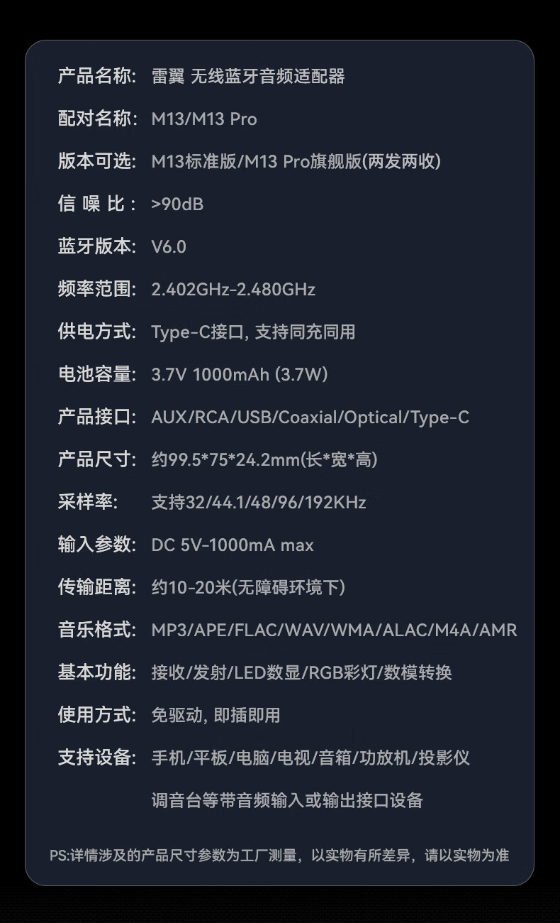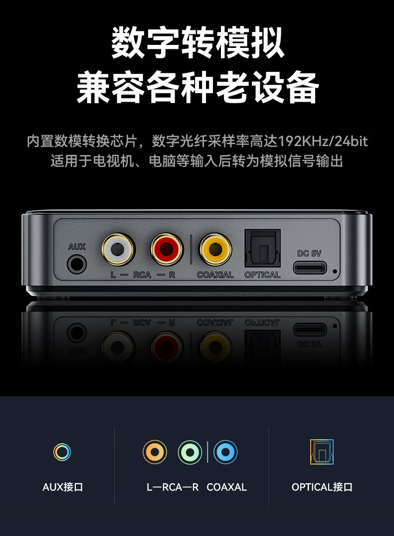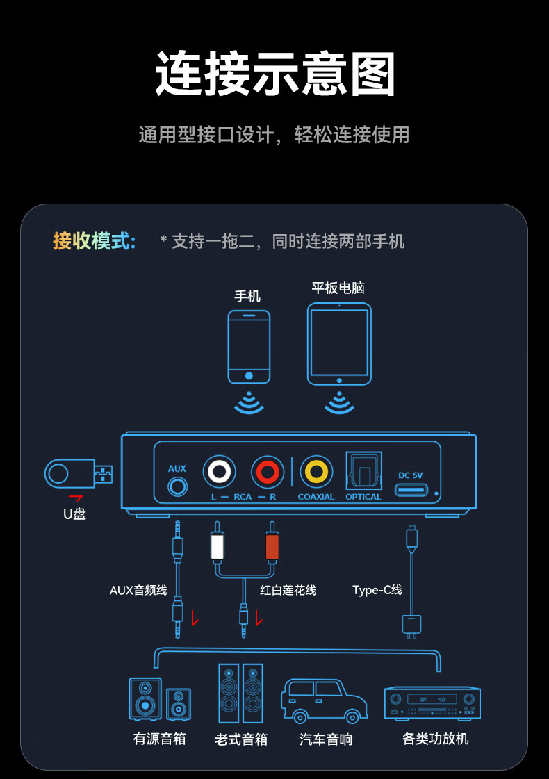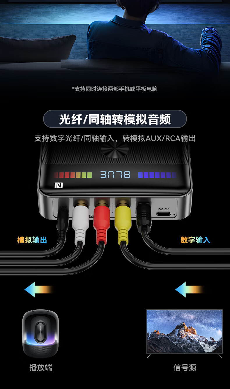 雷翼(RAYEE)蓝牙接收器6.0转音箱响功放机NFC触连U盘TF卡播放同轴光纤接电视电脑发射音频适配器 绅士黑 【升级版】一发两收