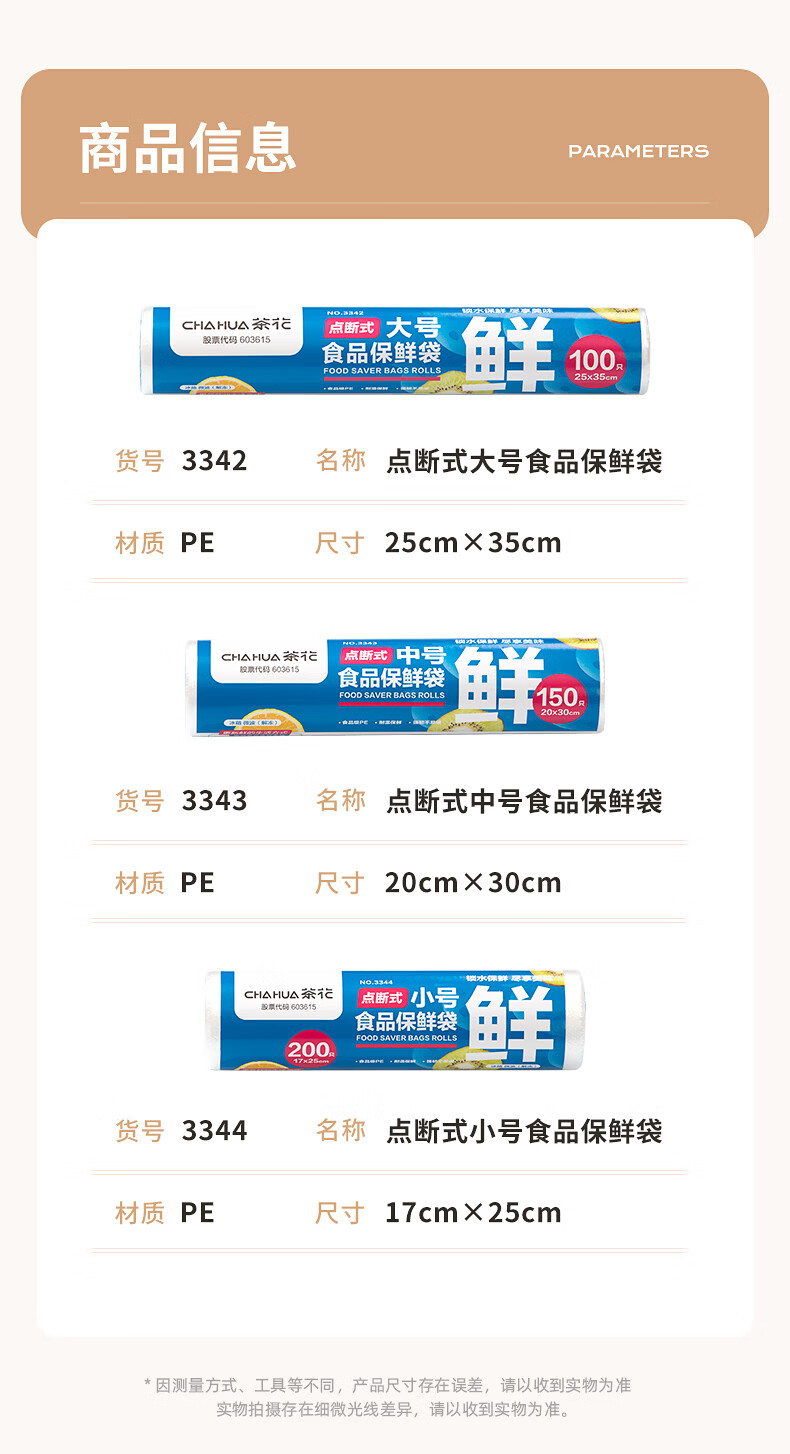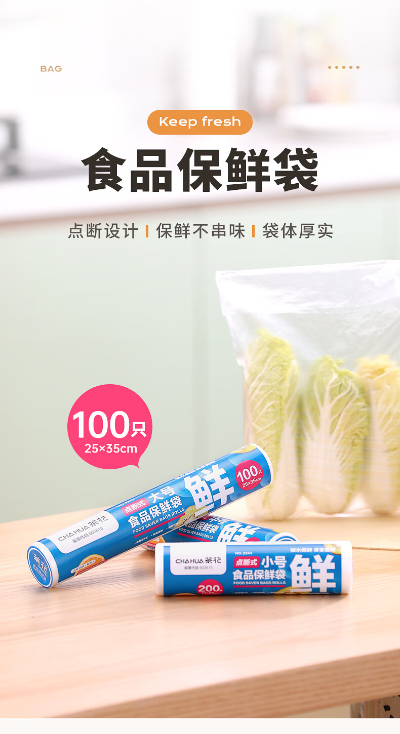 茶花(CHAHUA)保鲜袋食品级塑料袋点断式PE食品保鲜袋一次性厨房食品分装袋 小号保鲜袋 400只 点断式