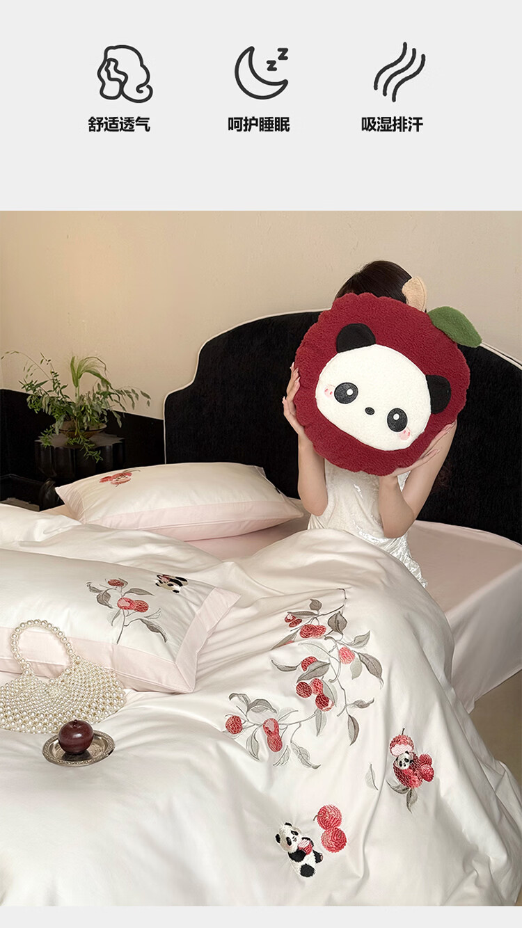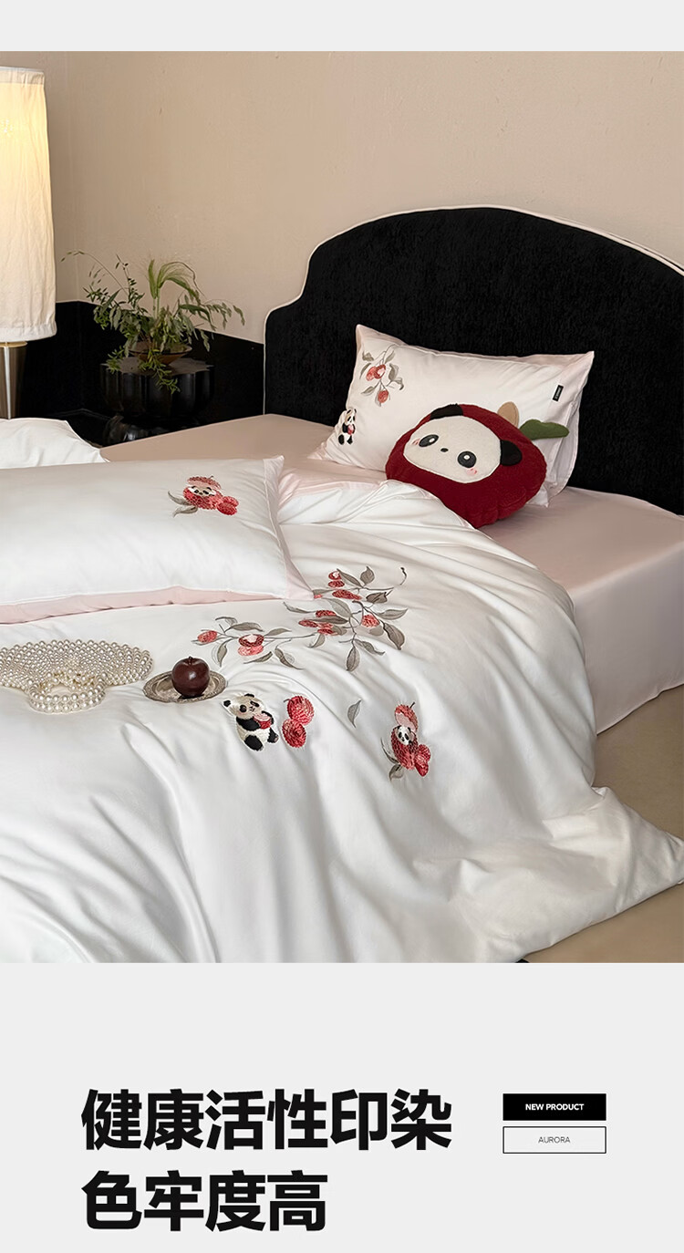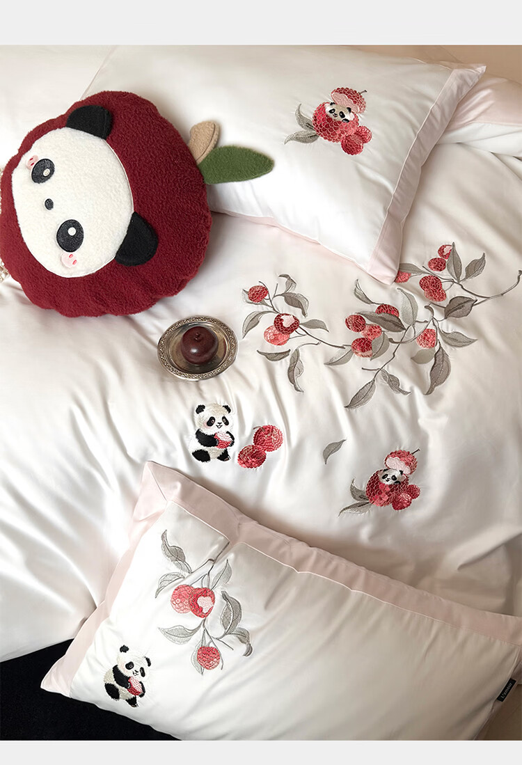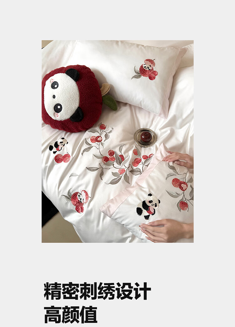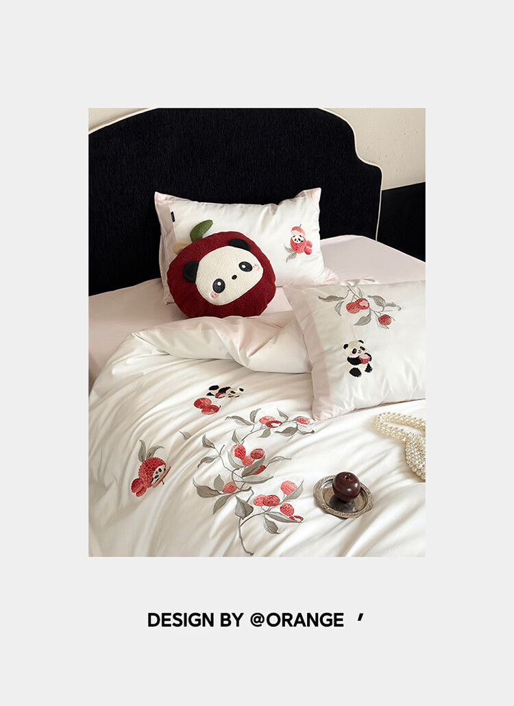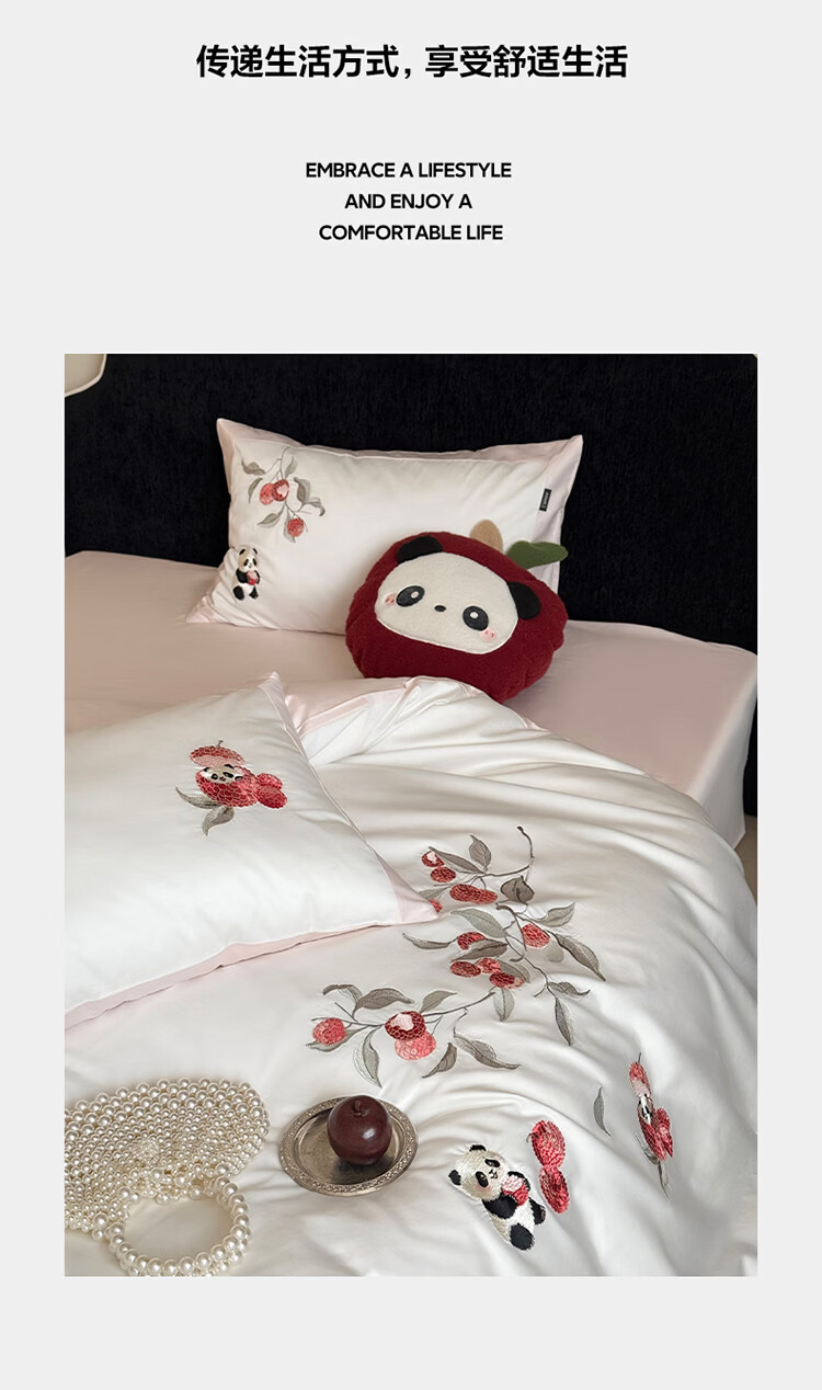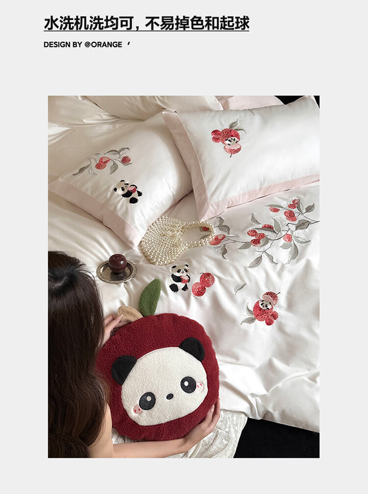 ROLAND LIVE春季新款长绒棉精密刺绣四件套可爱熊猫儿童卧室被套全棉三件套 LB 长绒棉套件-熊猫荔荔粉色 1.2米床 床单款 【被套150*200cm】