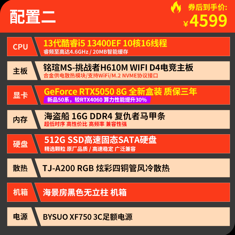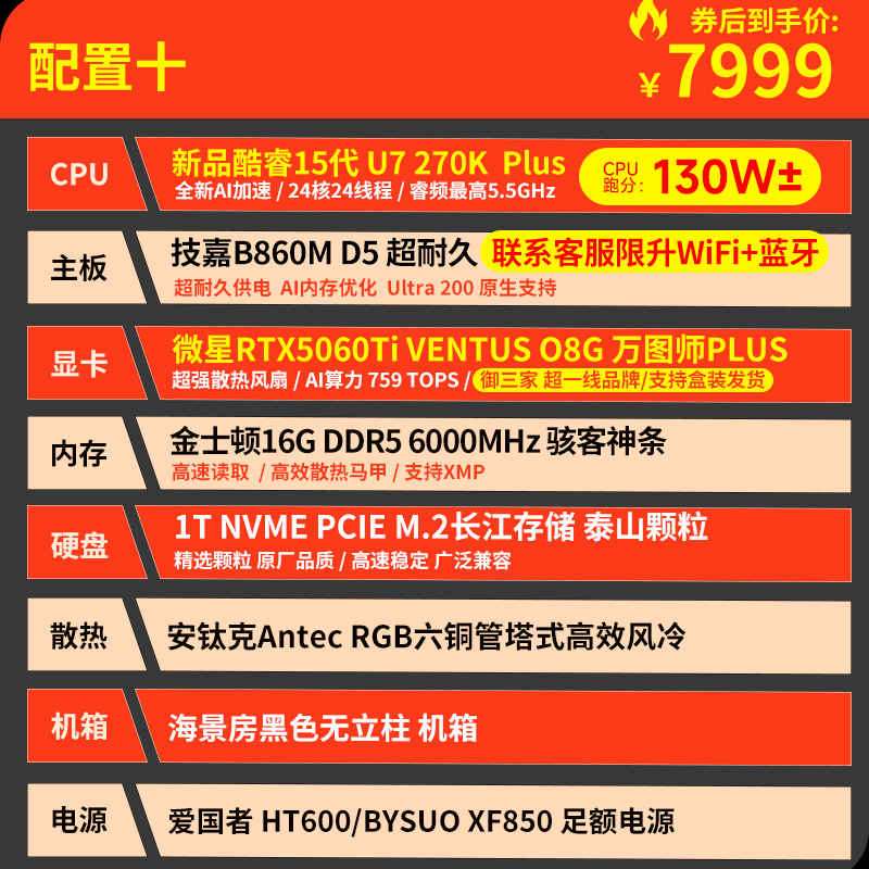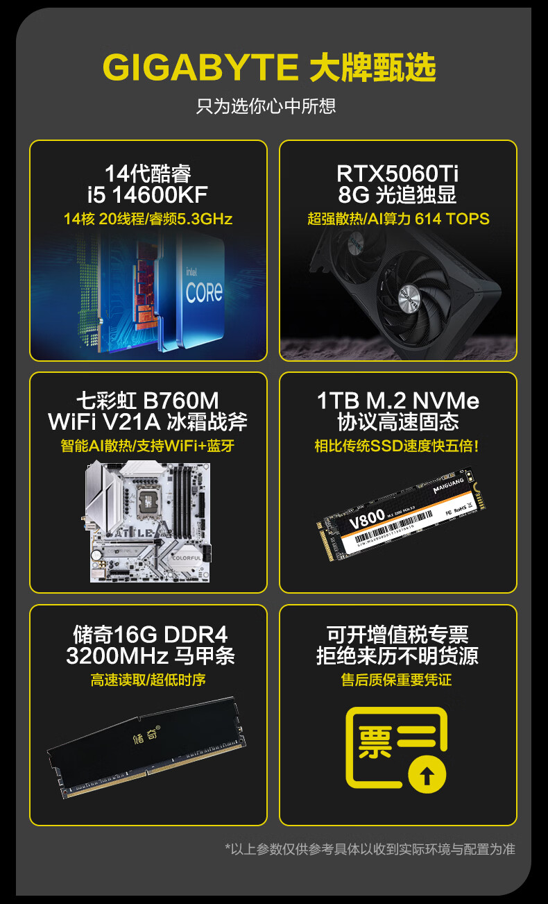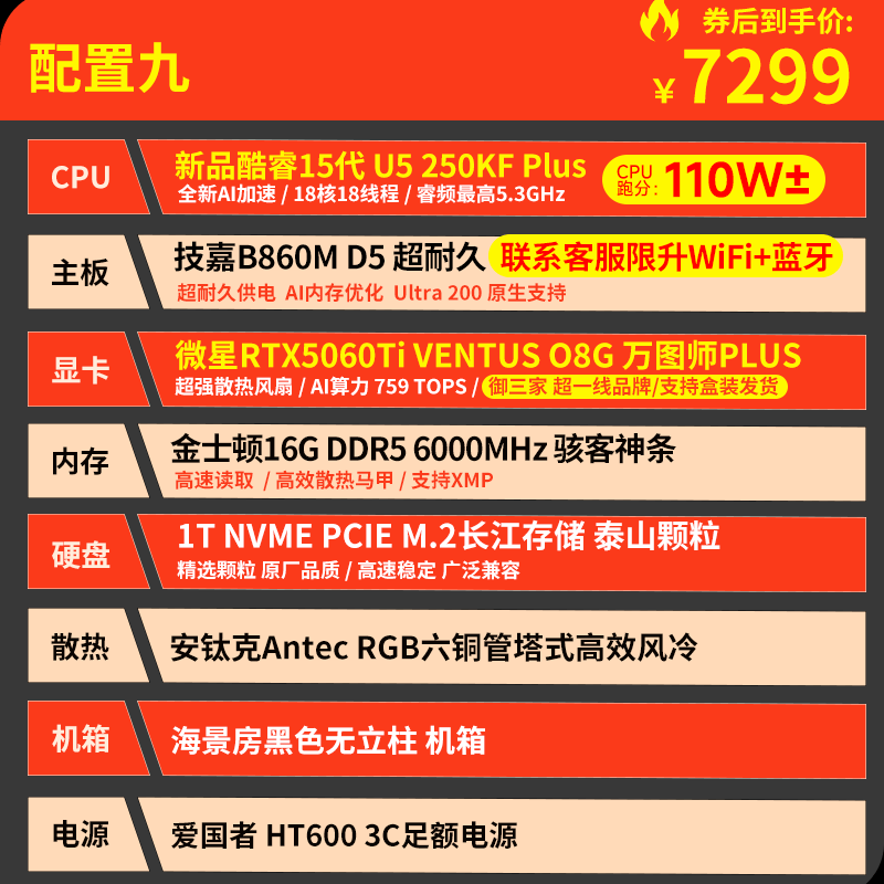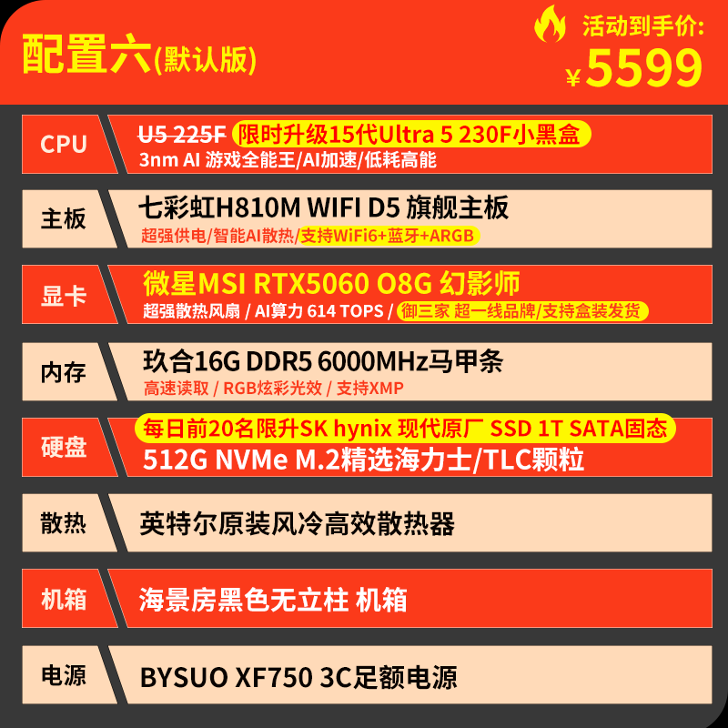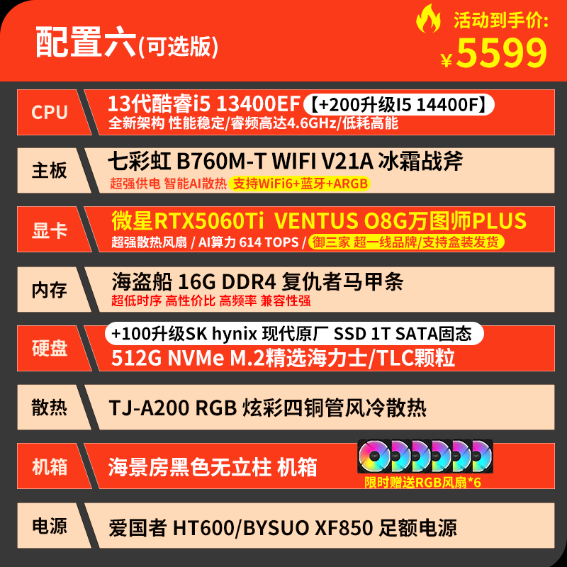 技嘉 酷睿i5 13400F升15代245KF台式组装电脑主机RTX4060Ti/5060Ti游戏高端电竞独显直播设计渲染整机 配置六:U5 230F 丨RTX5060