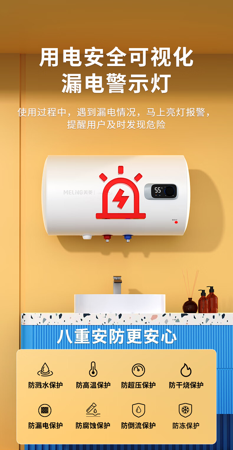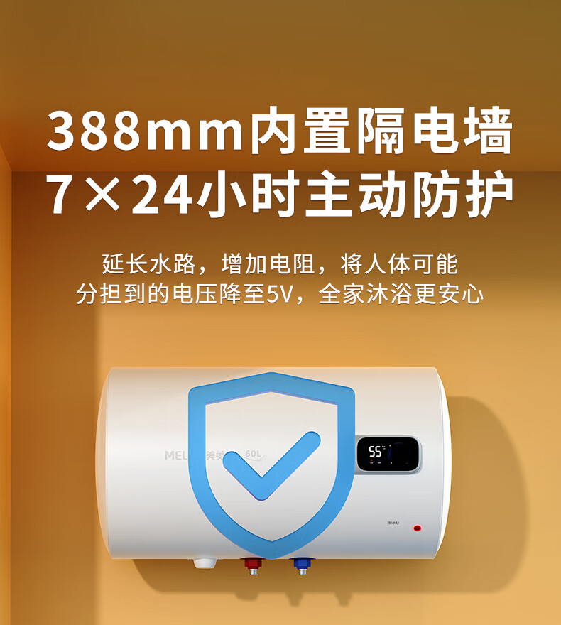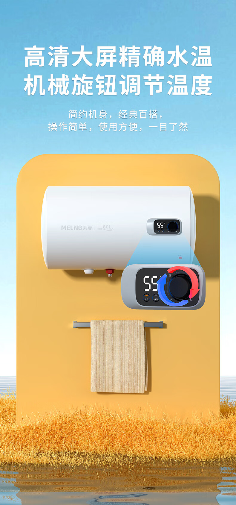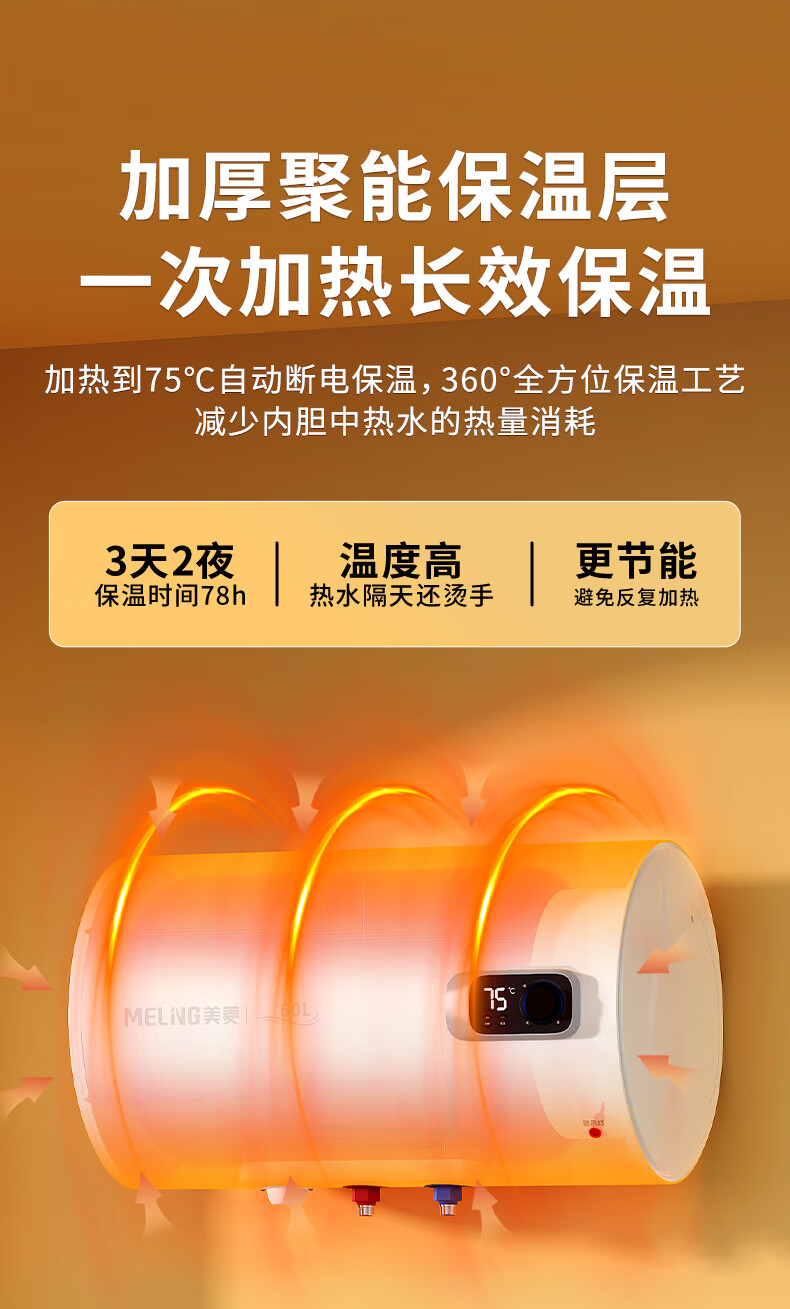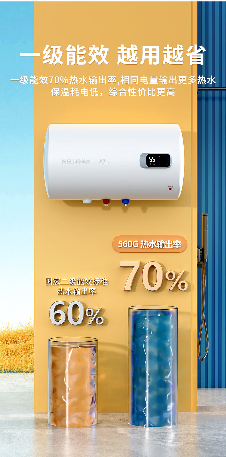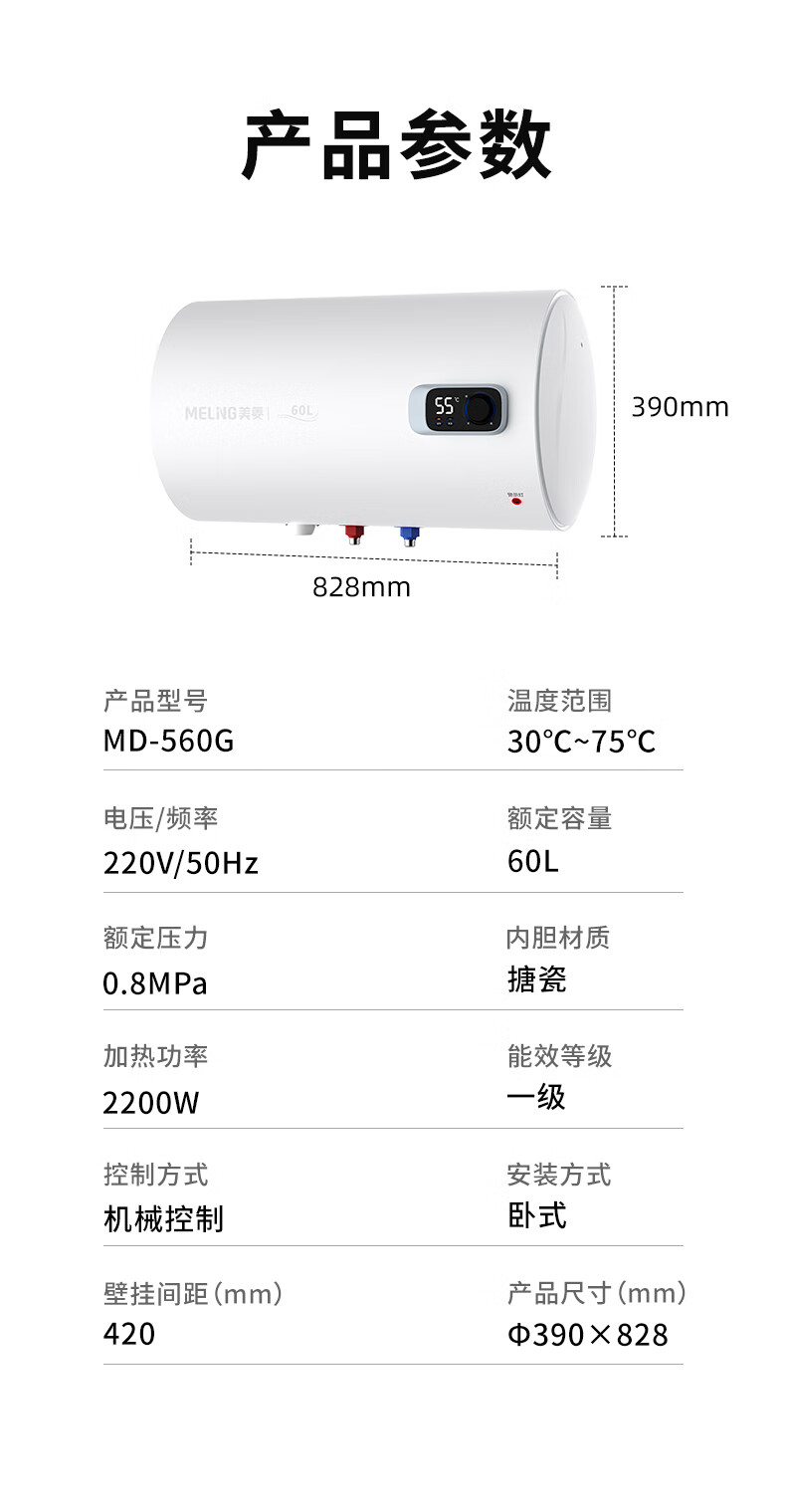 美菱电热水器60升免更换镁棒政府补贴15%一级能效家用节能储水式热水器2200W速热电脑数显质保8年560G