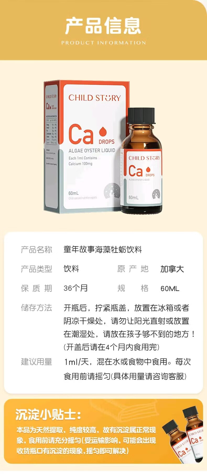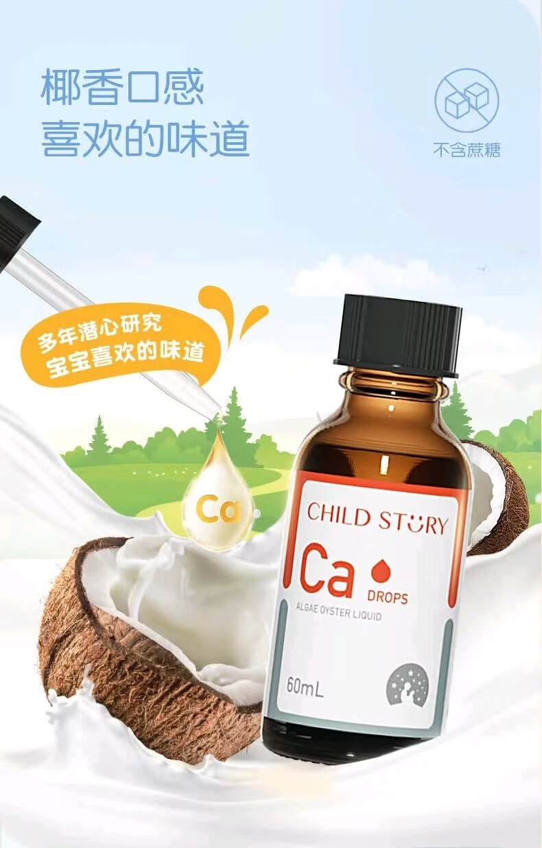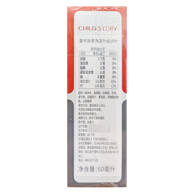 童年故事海藻牡蛎饮料60ml/瓶 宝宝钙儿童液体海藻牡蛎钙滴剂加拿大进口 1盒装【顺丰包邮】 海藻钙60ml/瓶-每毫升含100mg钙