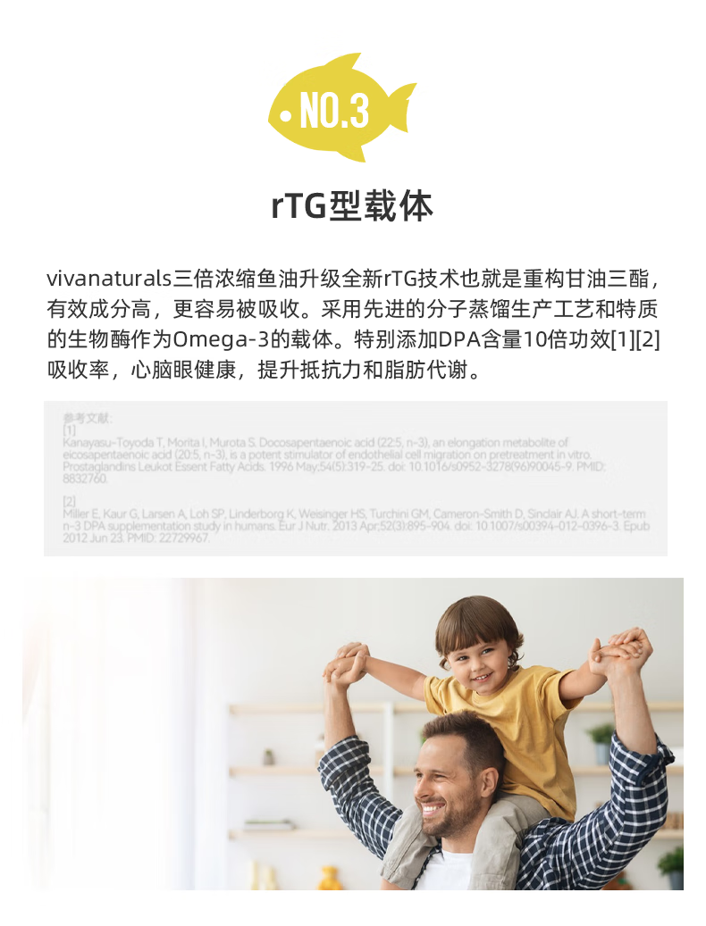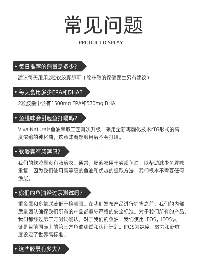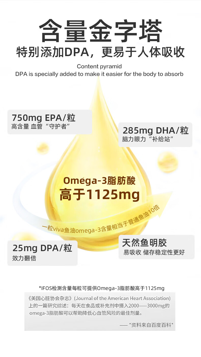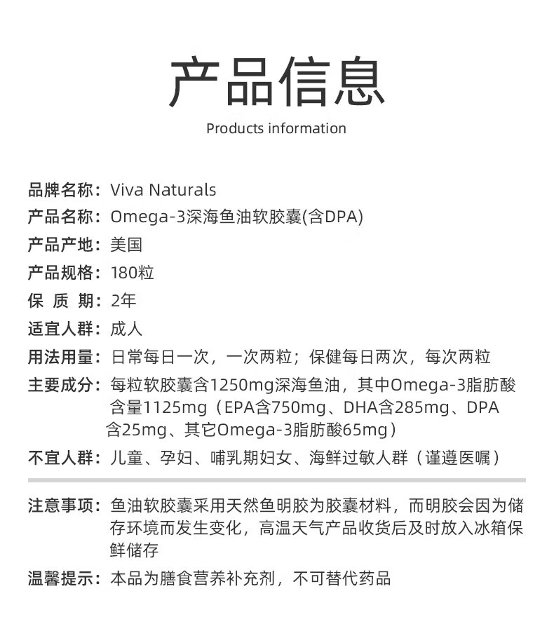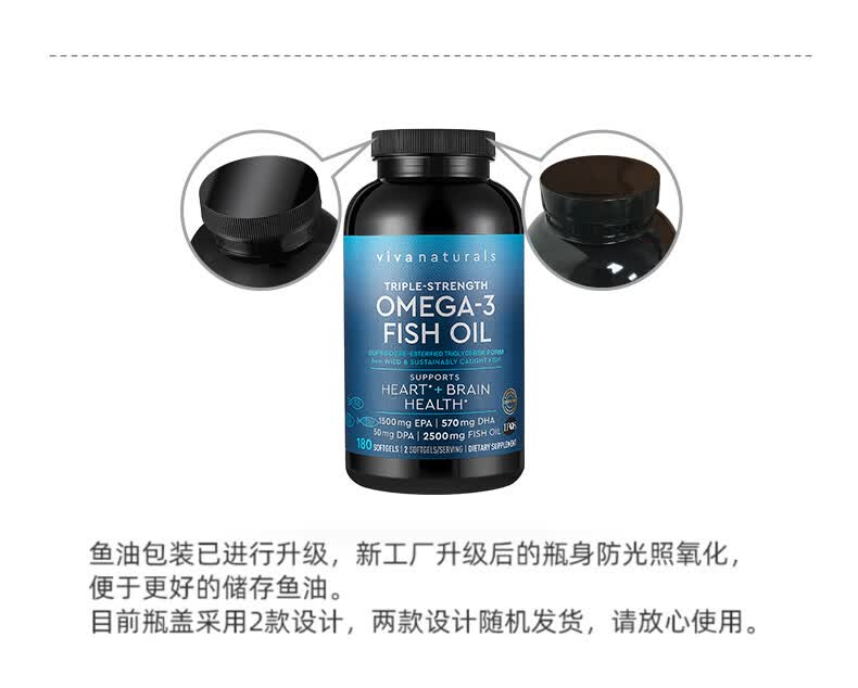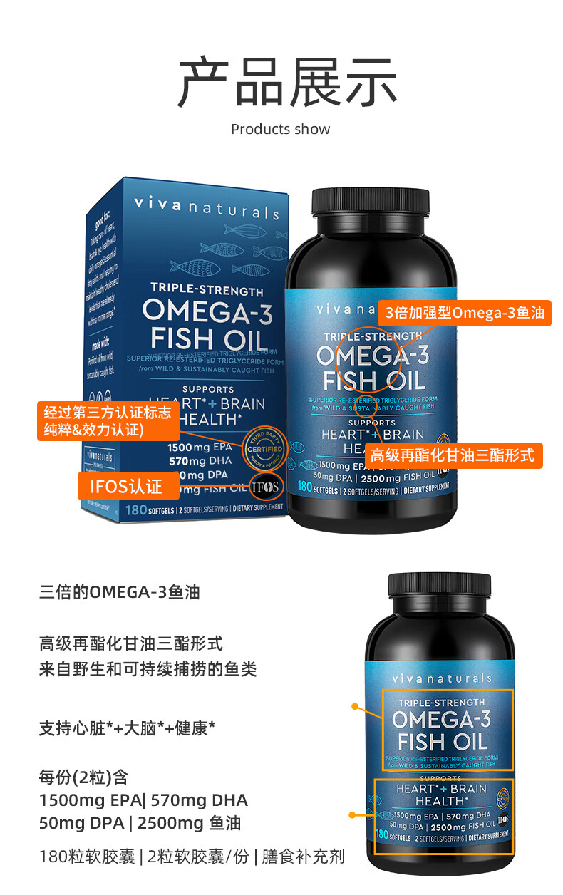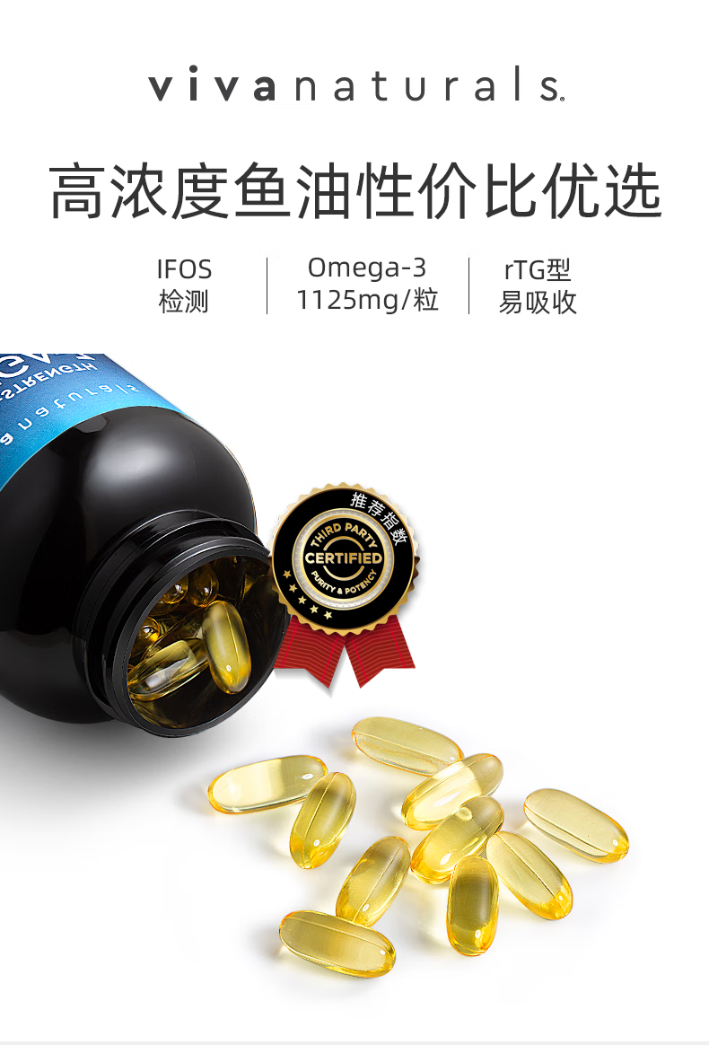 Viva Naturals美国进口高纯度rTG结构深海鱼油DPA天然omega3欧米伽3软胶囊180粒
