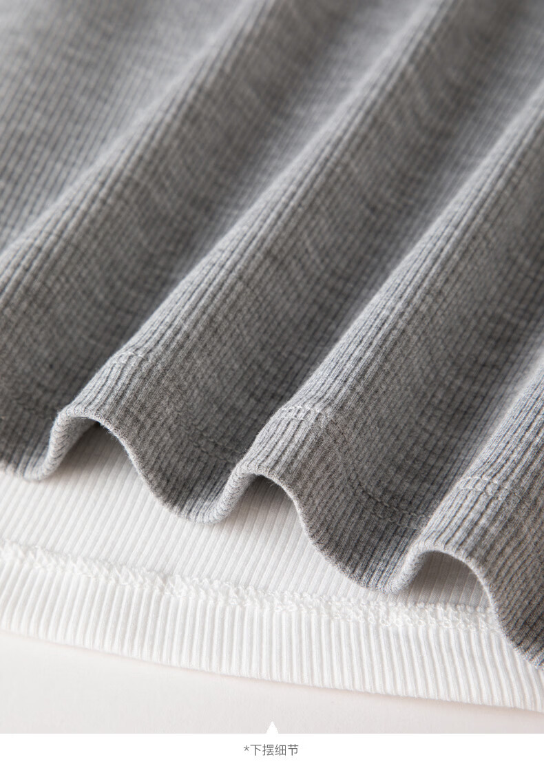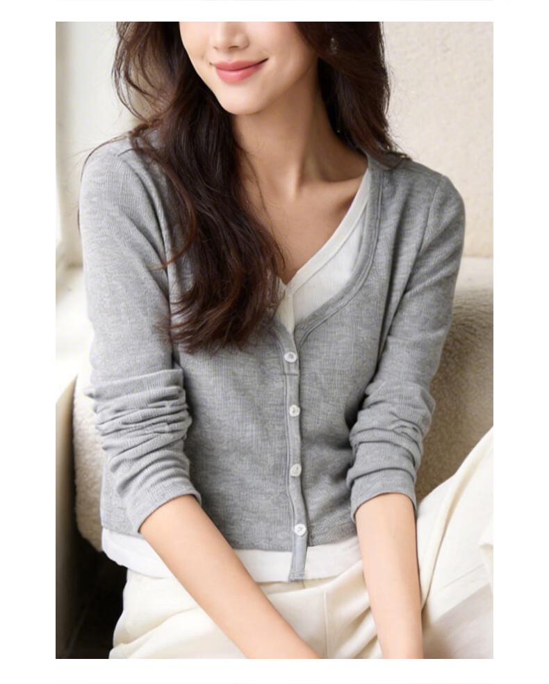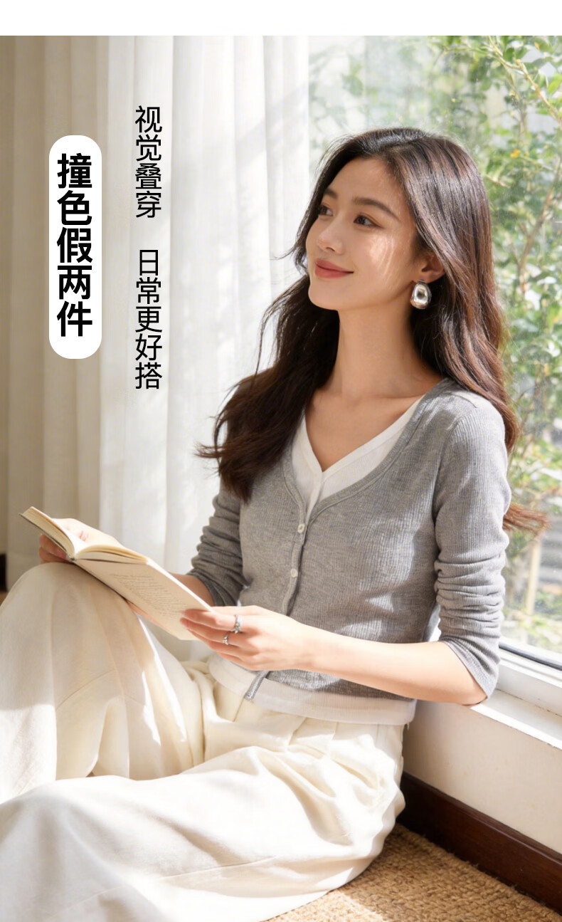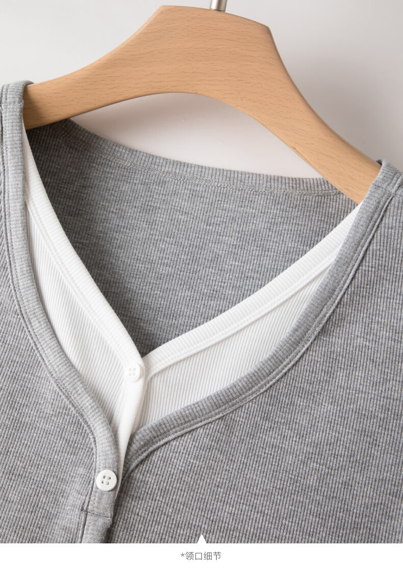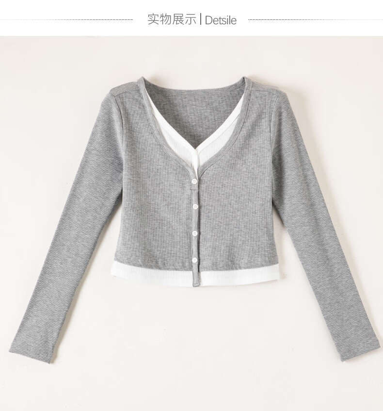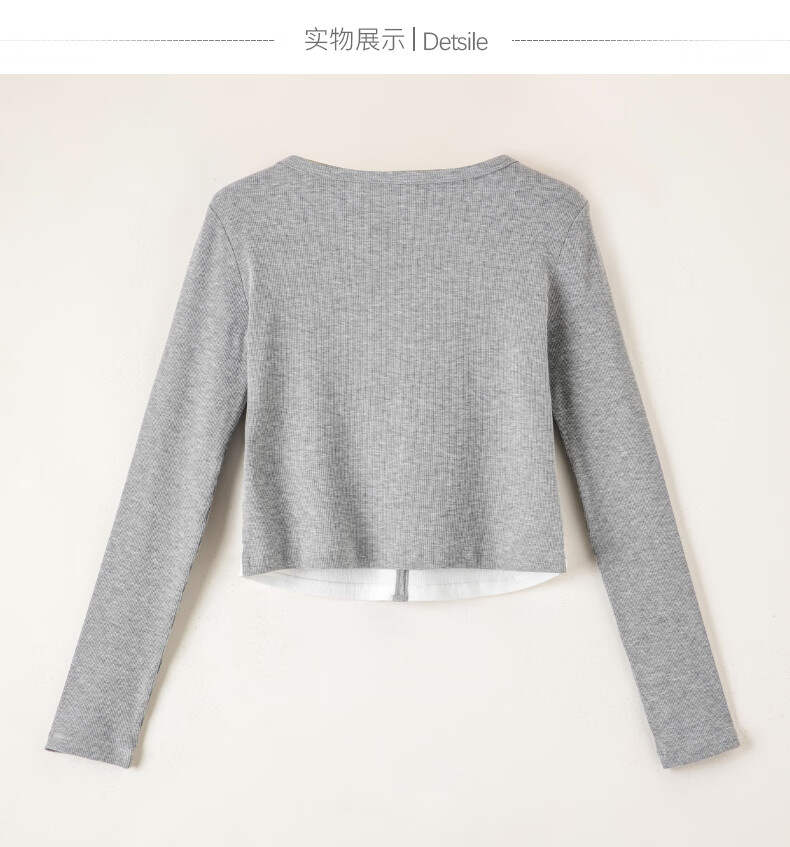 晚白【新品】2026春款经典撞色V领miu系穿搭棉料T恤百搭短款打底衫女 灰色 M