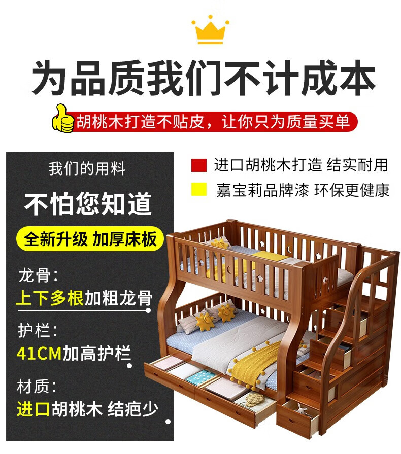 临稚胡桃木 儿童上下床实木高低床双层床上下铺床两层木床子母床 梯柜款 上铺宽1.3米下铺宽1.5米