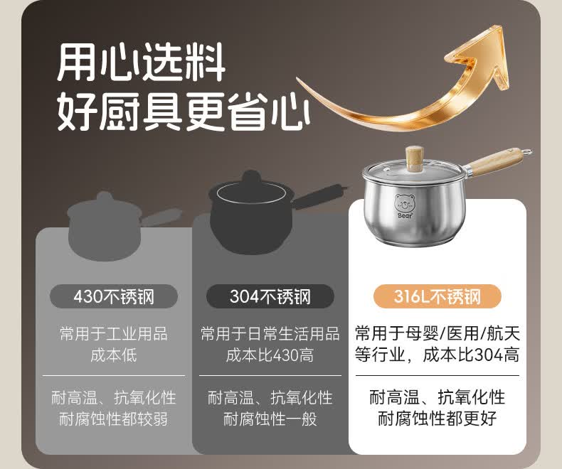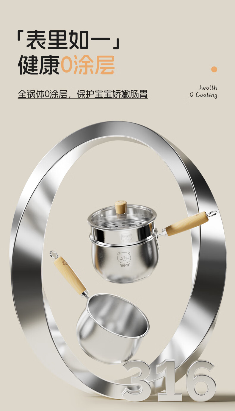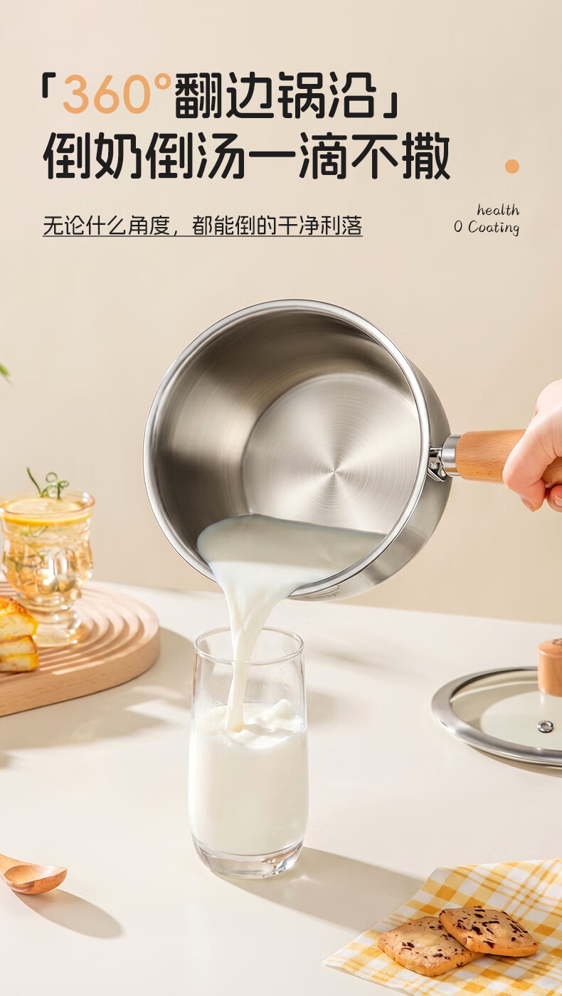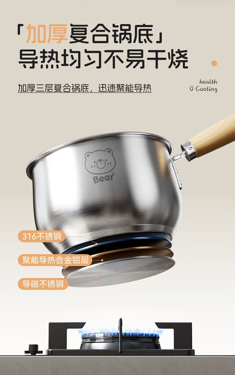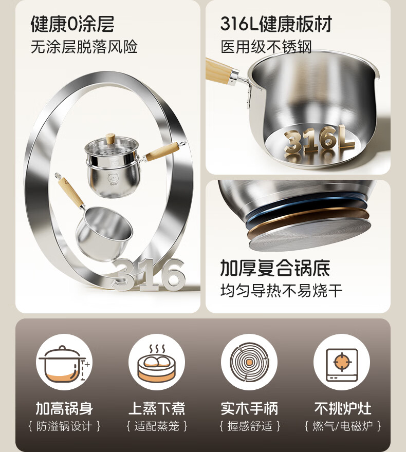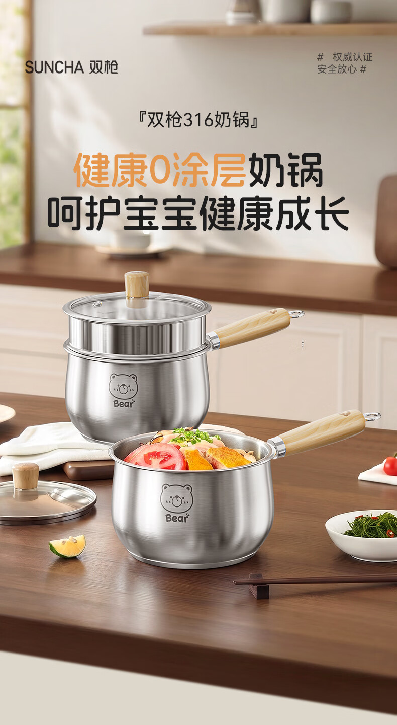 双枪(Suncha)316L不锈钢小奶锅辅食锅汤锅泡面蒸锅燃气电磁炉18cm带盖