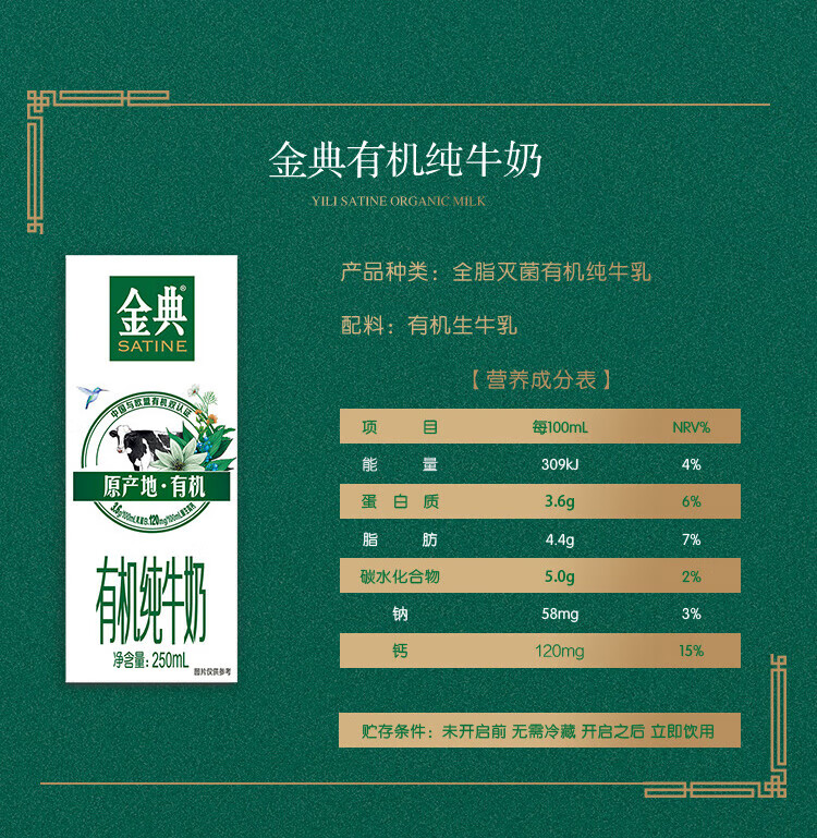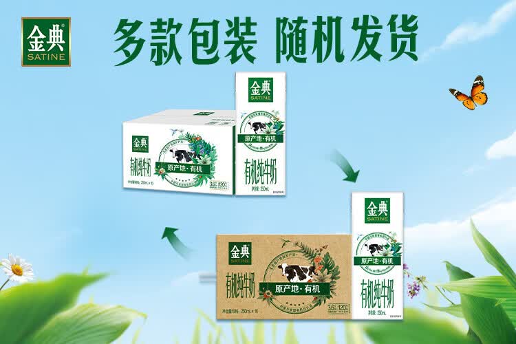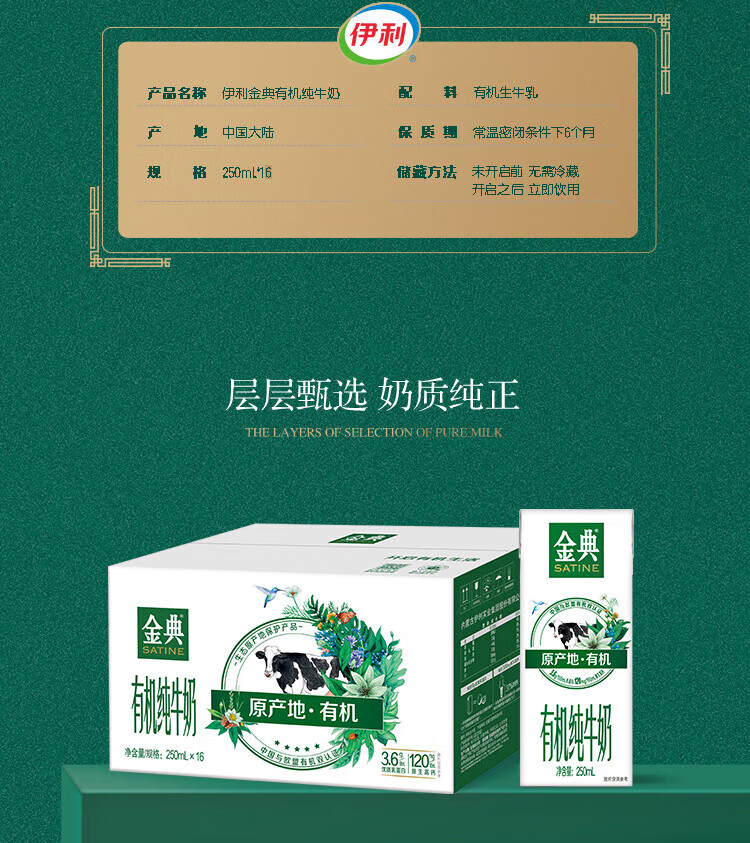 金典(SATINE)有机纯牛奶 3.6g乳蛋白 早餐伴侣 牛奶整箱礼盒 新鲜日期3月产 有机纯牛奶250ml*16盒*1箱