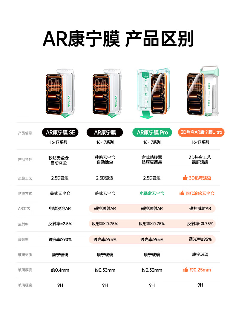 绿联AR康宁膜【AR抗反射+美国康宁授权】适用iPhone17ProMax钢化膜苹果17proma手机膜防摔指纹无尘仓