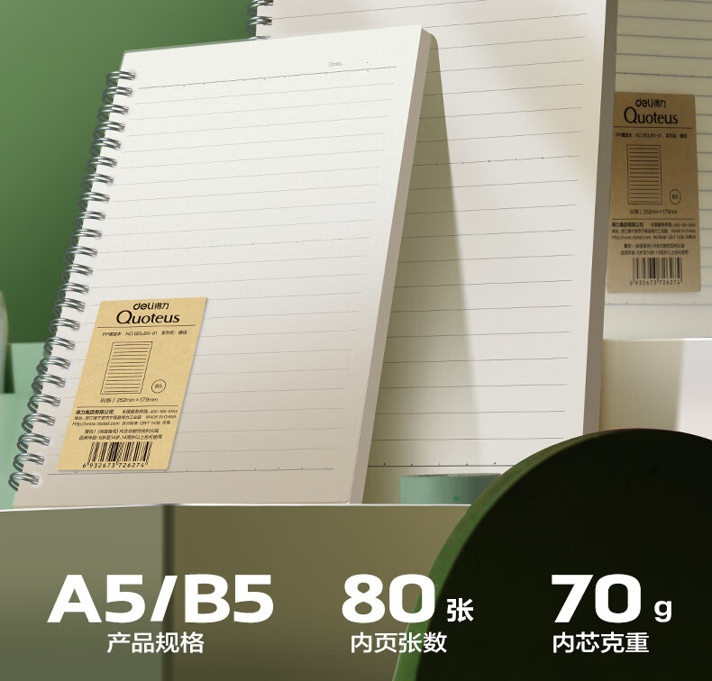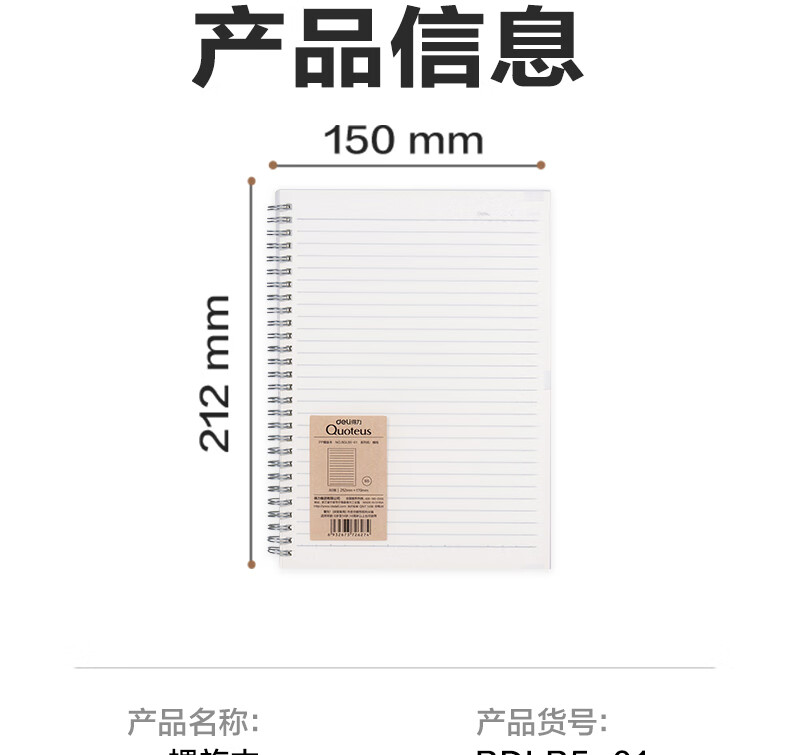 得力(deli)B5螺旋记事本笔记本线圈本子80张/本 横线内芯BDLB5-01