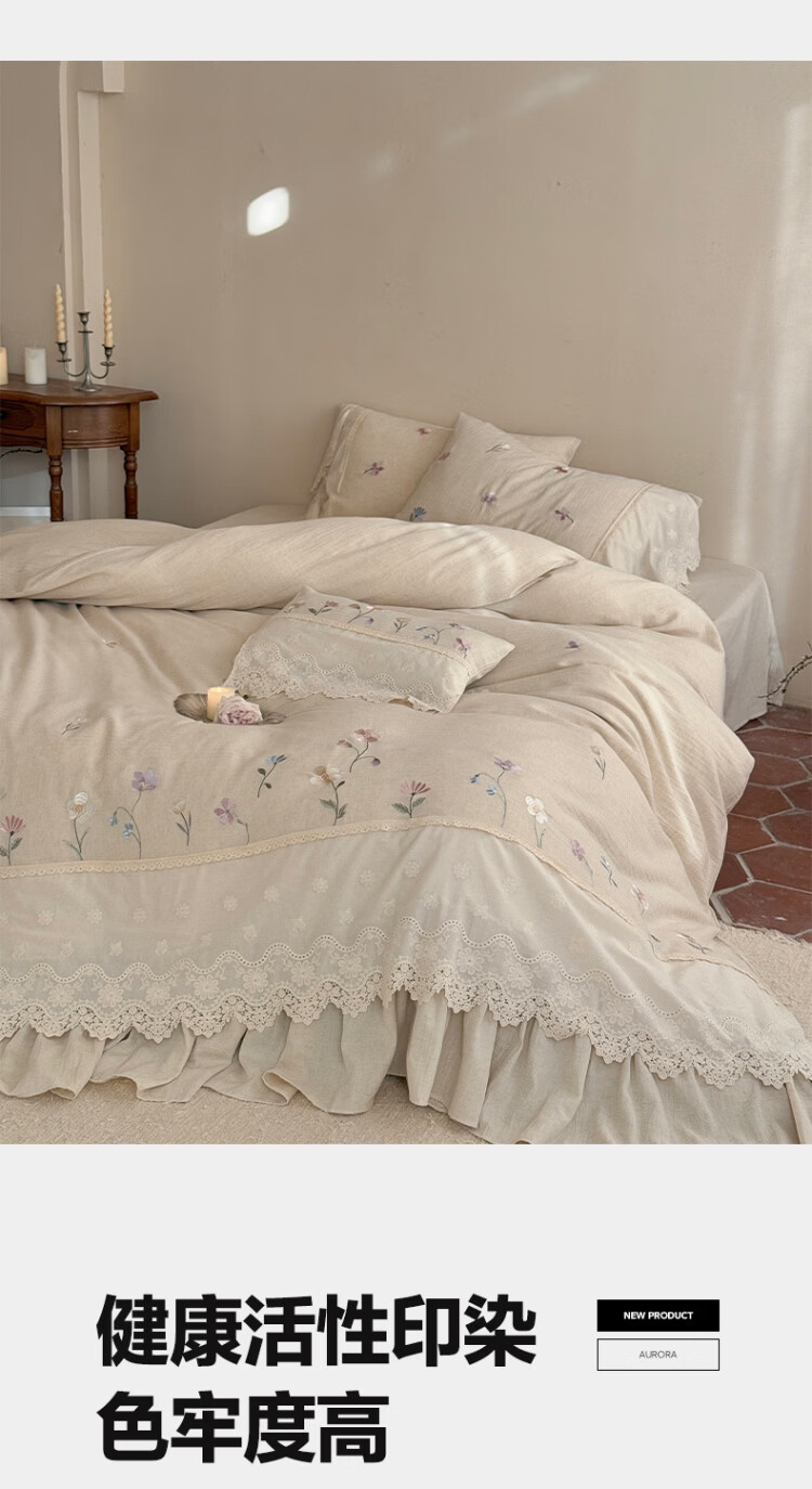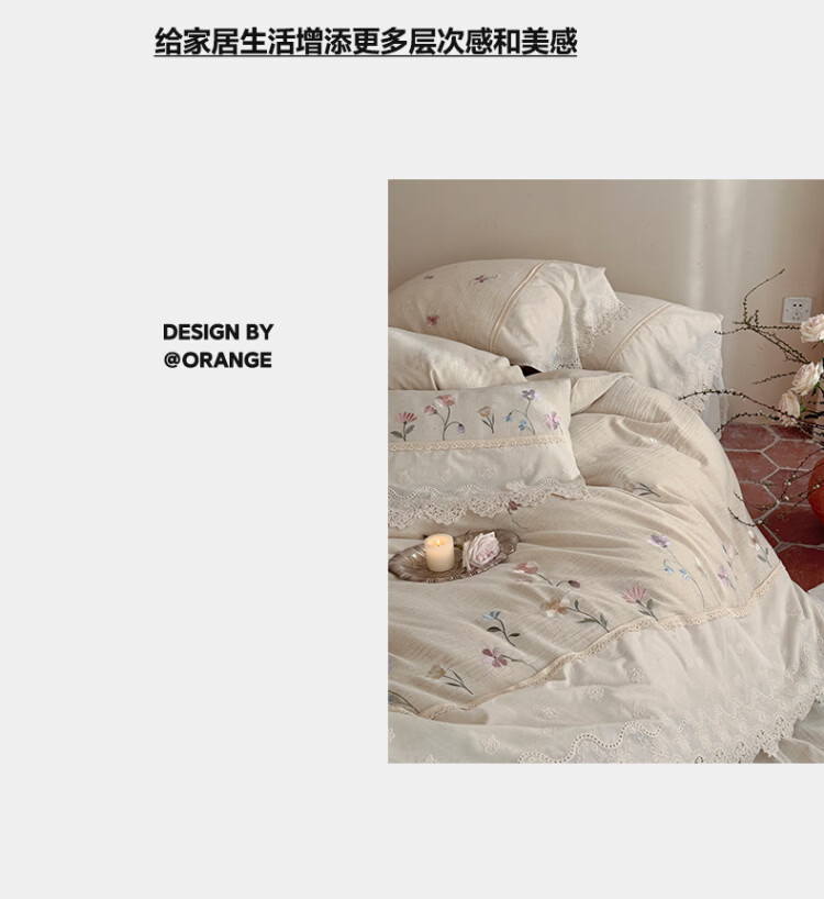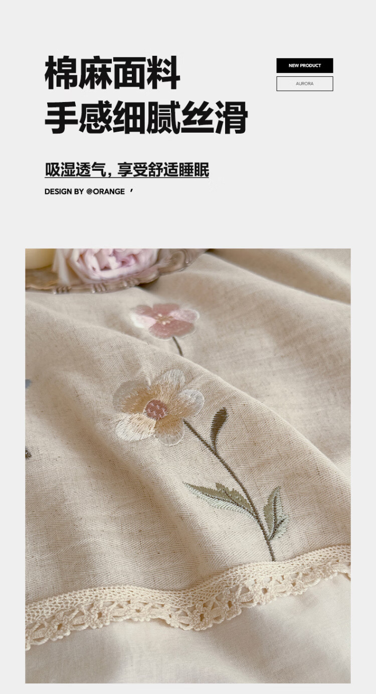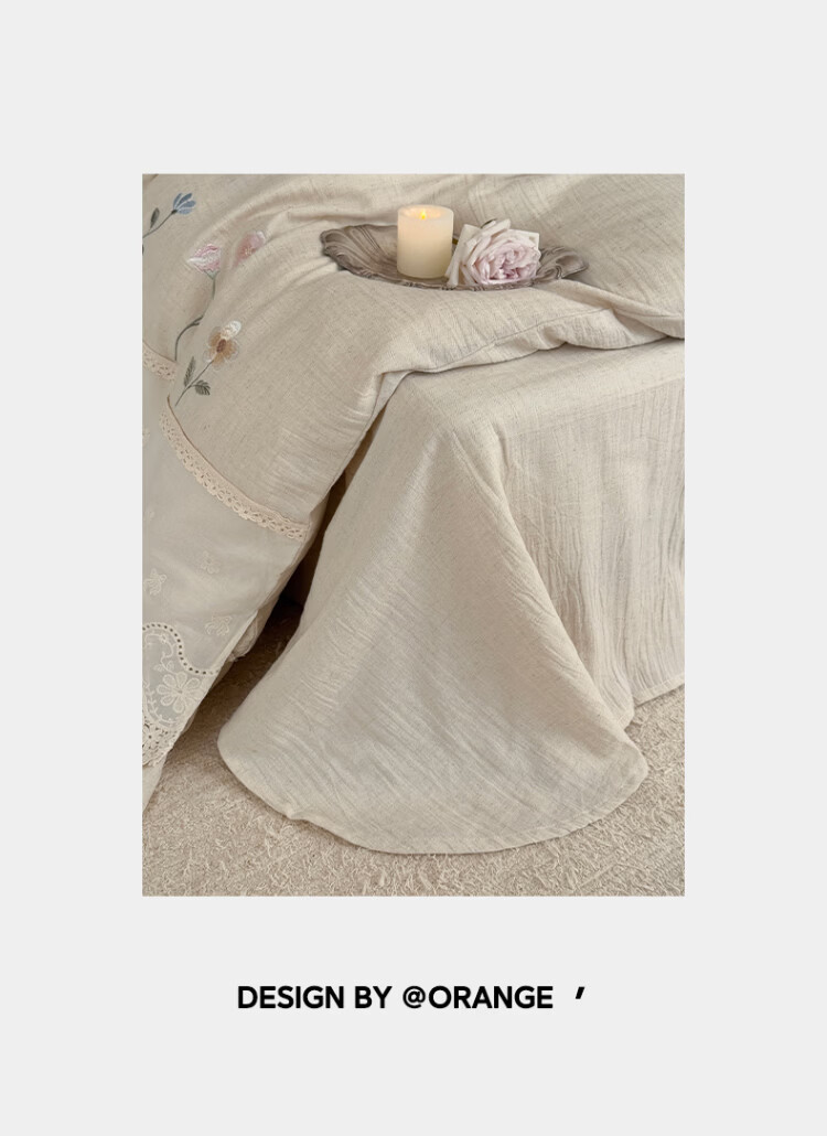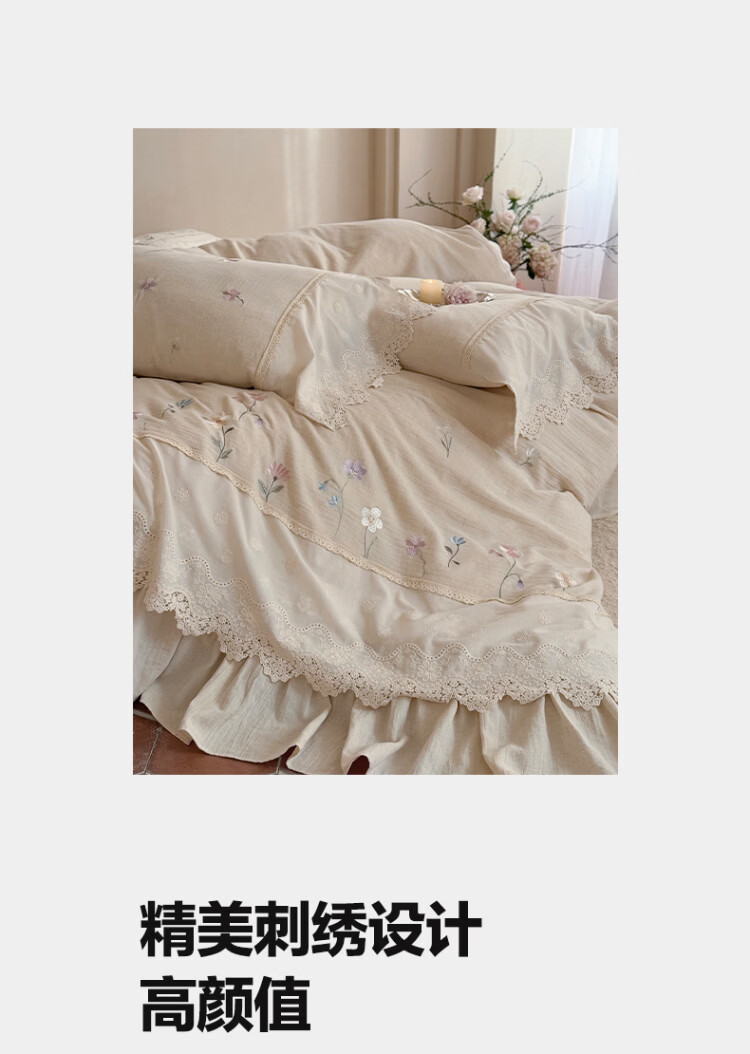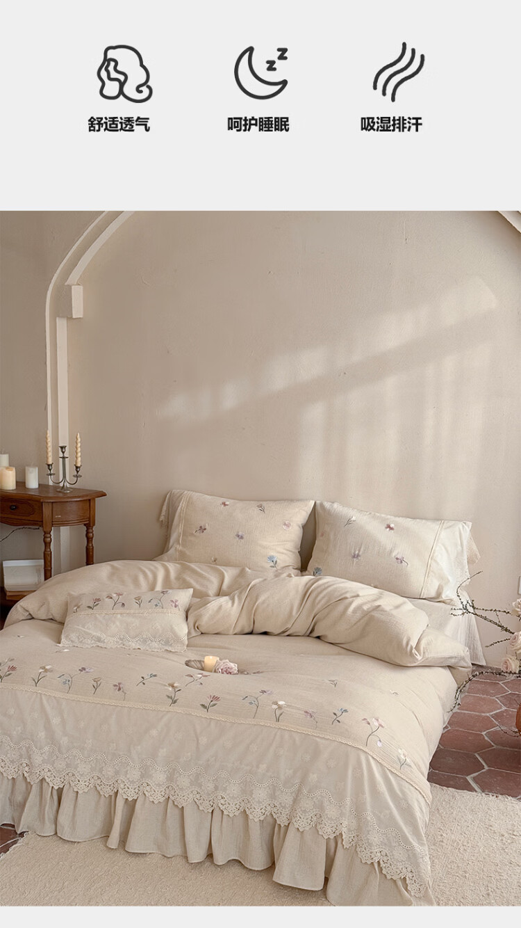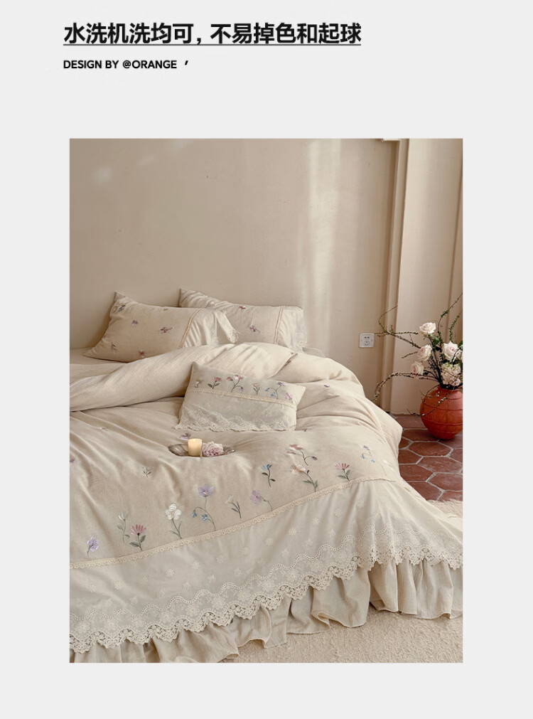 ROLAND LIVE法式公主风棉麻刺绣四件套蕾丝花边被套少女心透气春夏床上用品 MX 棉麻刺绣四件套-兰知春序白 1.5米床 床单款 【被套200*230cm】