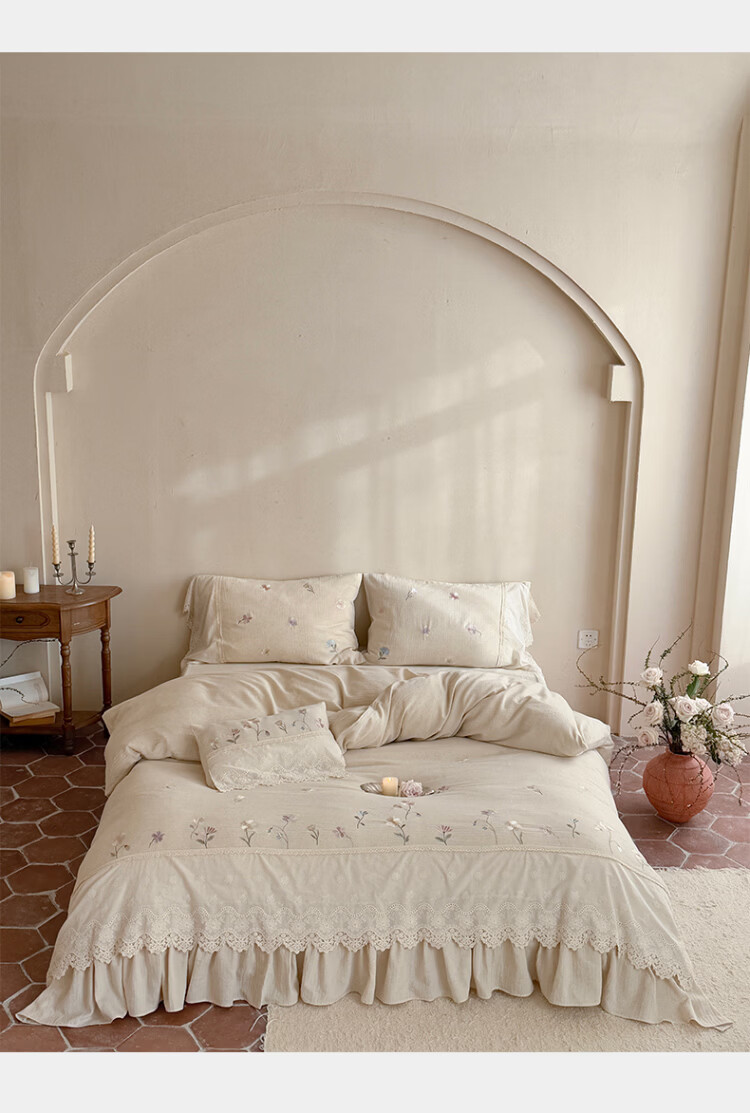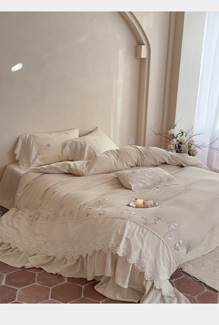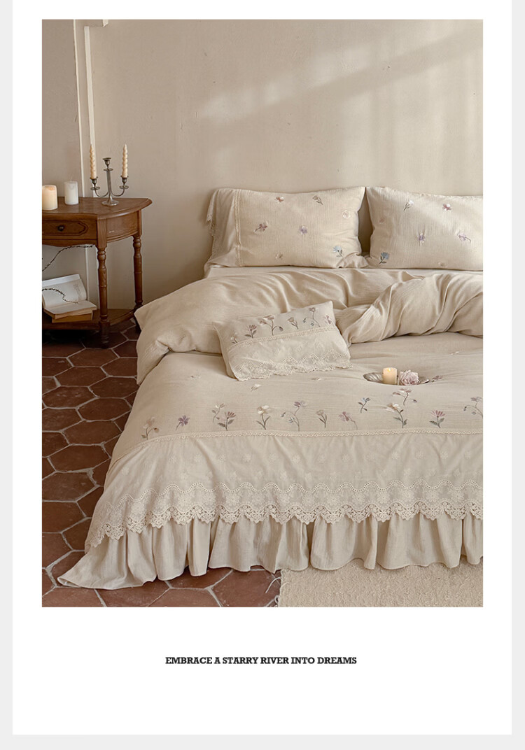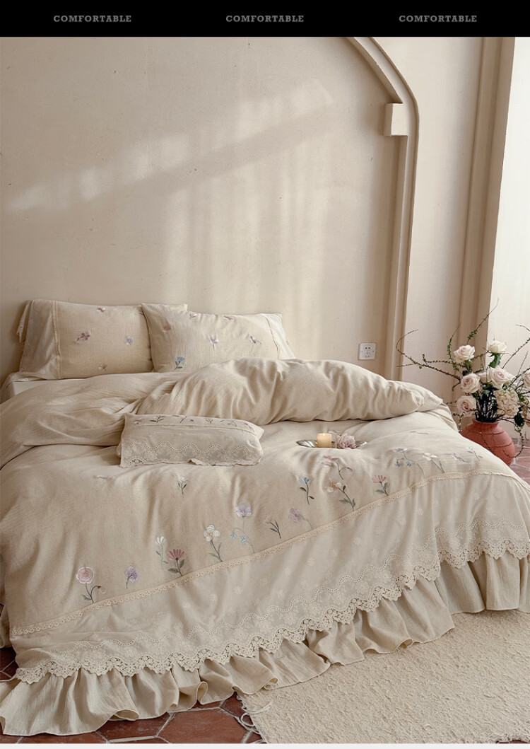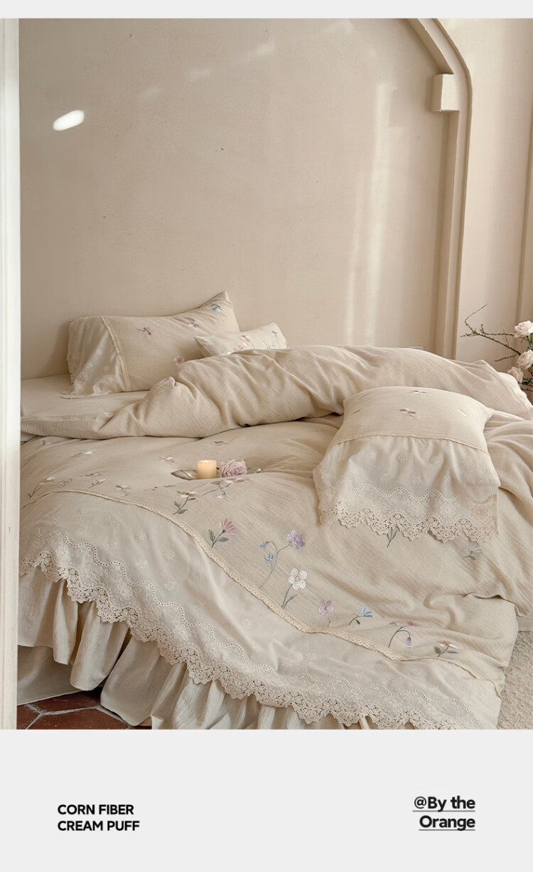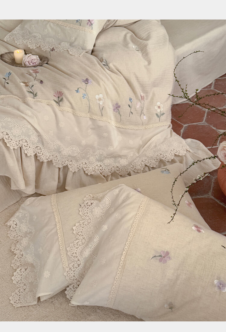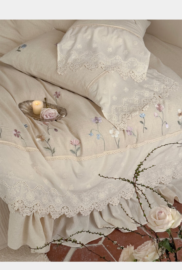 ROLAND LIVE法式公主风棉麻刺绣四件套蕾丝花边被套少女心透气春夏床上用品 MX 棉麻刺绣四件套-兰知春序白 1.5米床 床单款 【被套200*230cm】