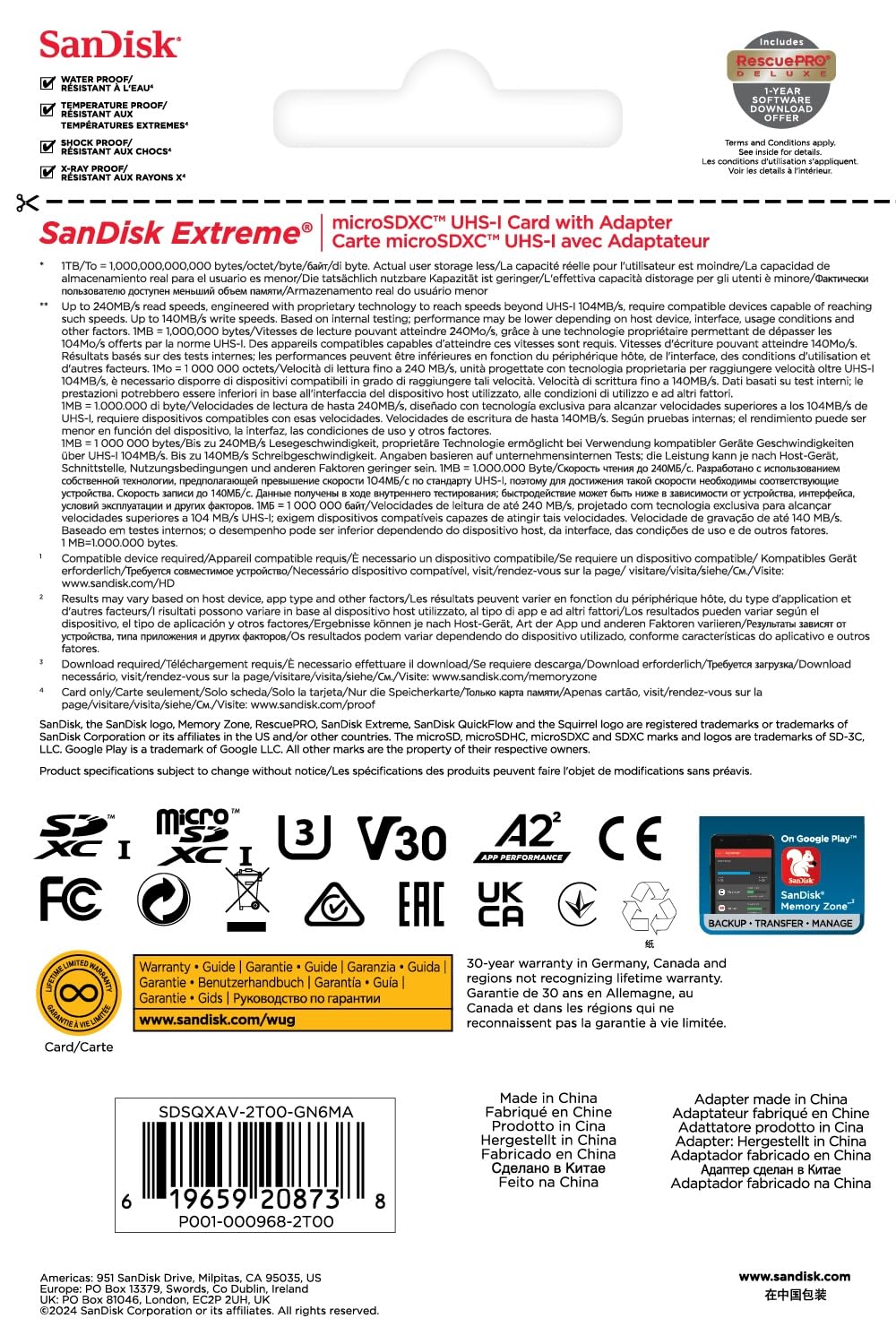 闪迪(SanDisk) 闪迪 2TB 极速microSDXC UHS-I内存卡 读取240MB/s 适用手机/相机/无人机 SDSQXAV-2T00-GN6MA