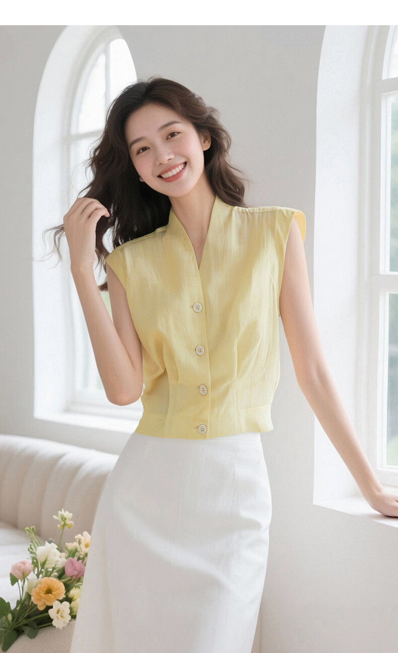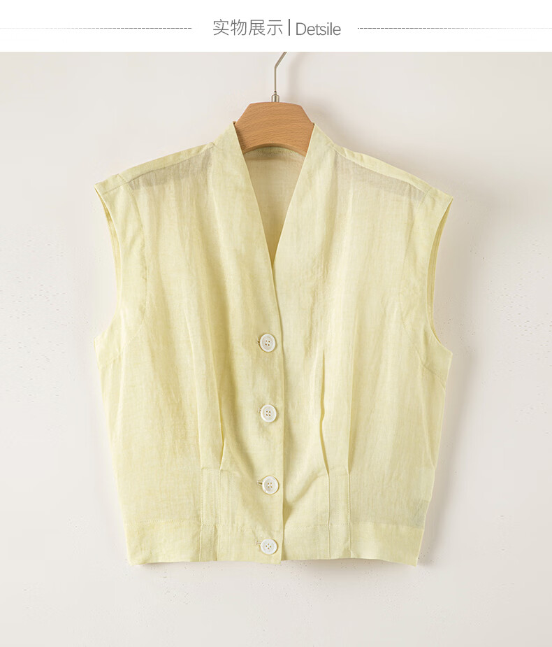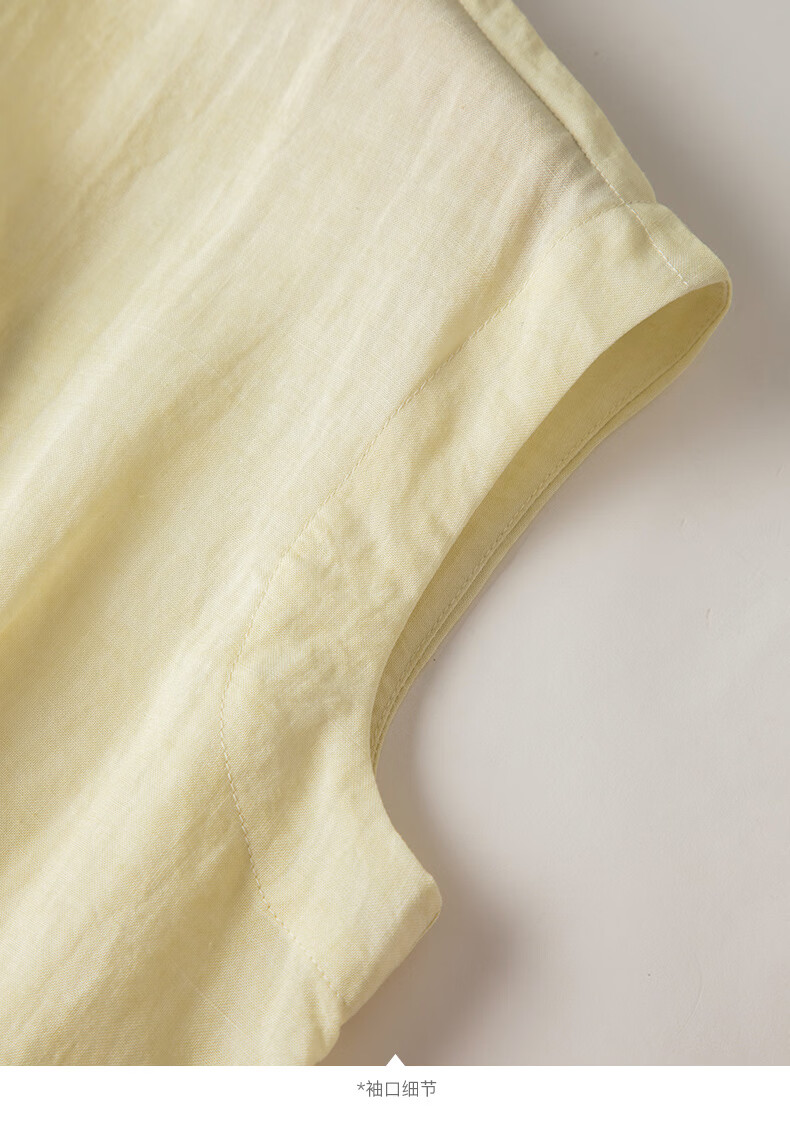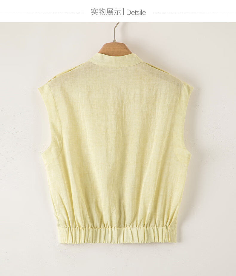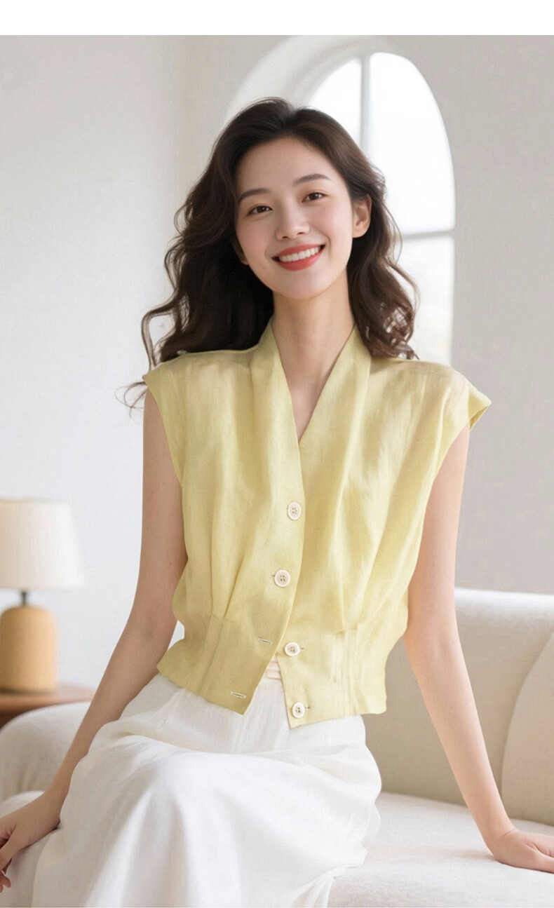 晚白2026年春夏款老钱风V领莱赛尔天丝含麻上衣轻薄休闲无袖衬衫女 嫩黄色 S