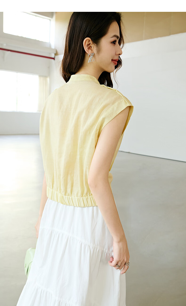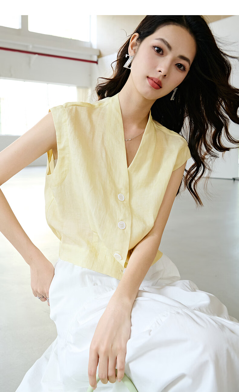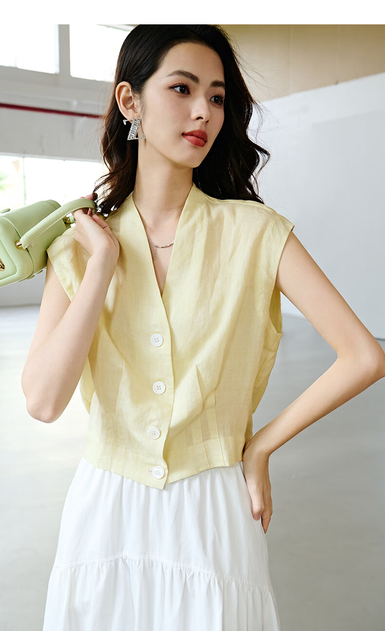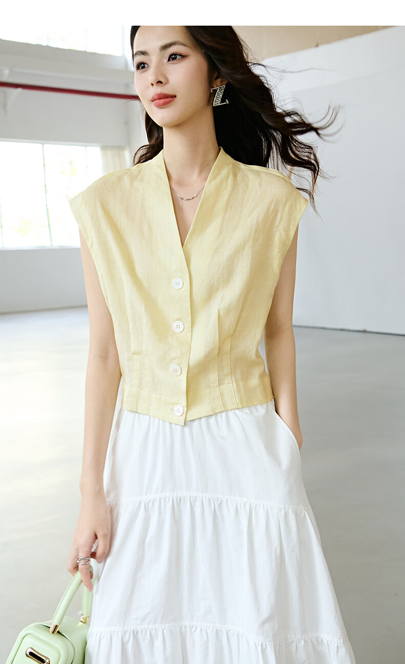 晚白2026年春夏款老钱风V领莱赛尔天丝含麻上衣轻薄休闲无袖衬衫女 嫩黄色 S