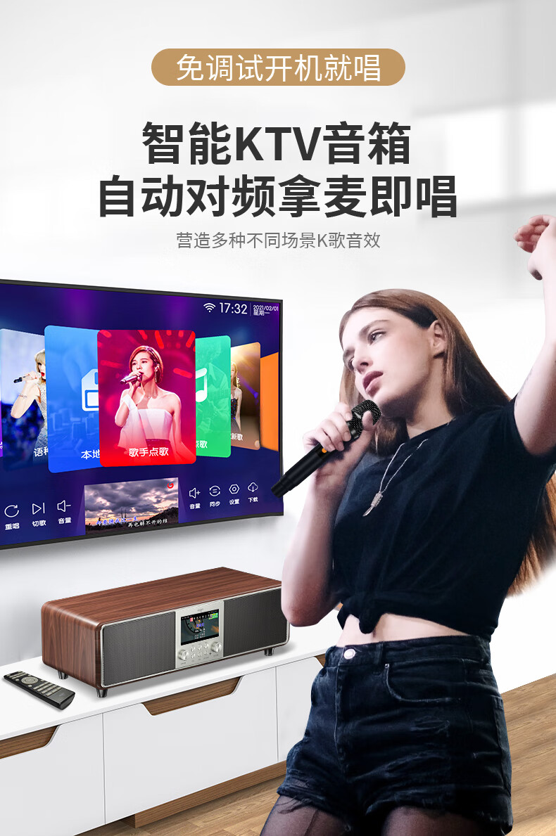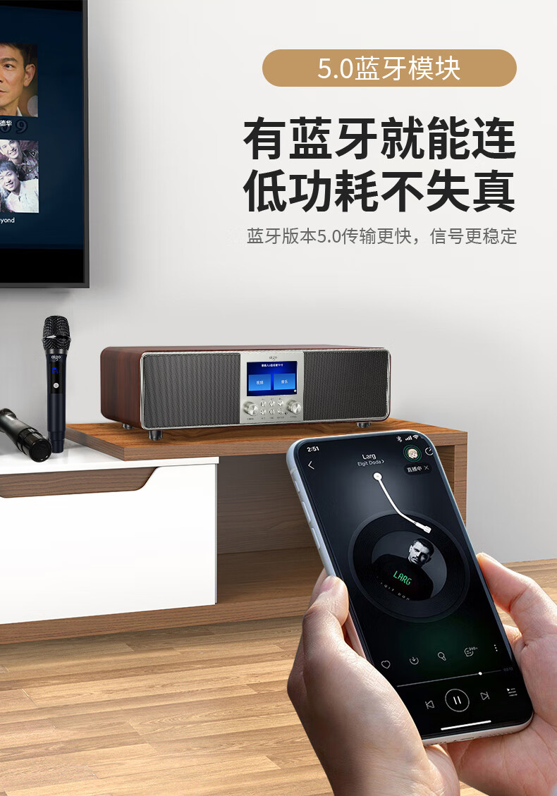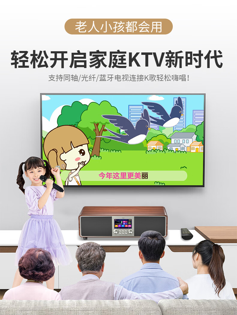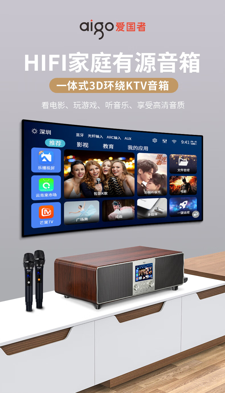 爱国者T16 蓝牙音响回音壁电视音箱无线家庭KTV影院K歌音响套装一体机带双麦克风 原木色