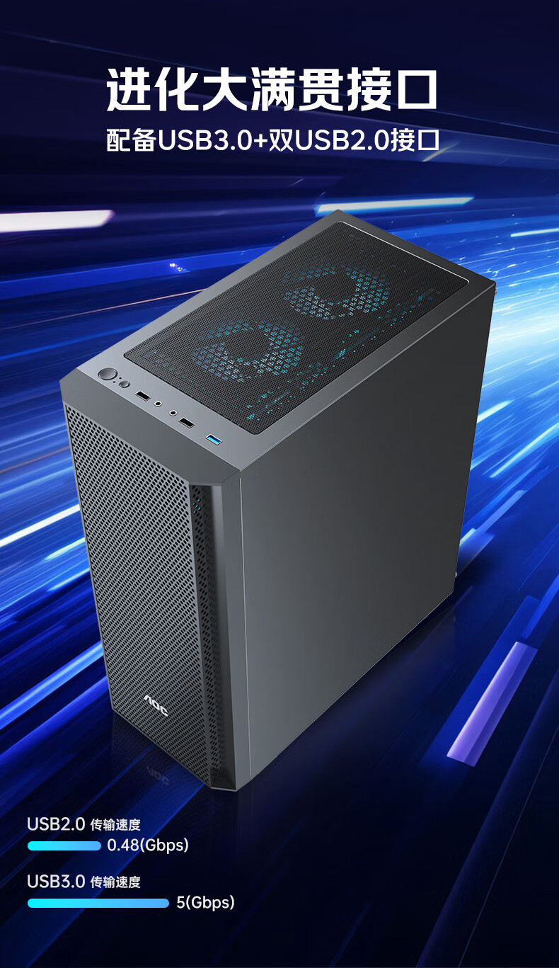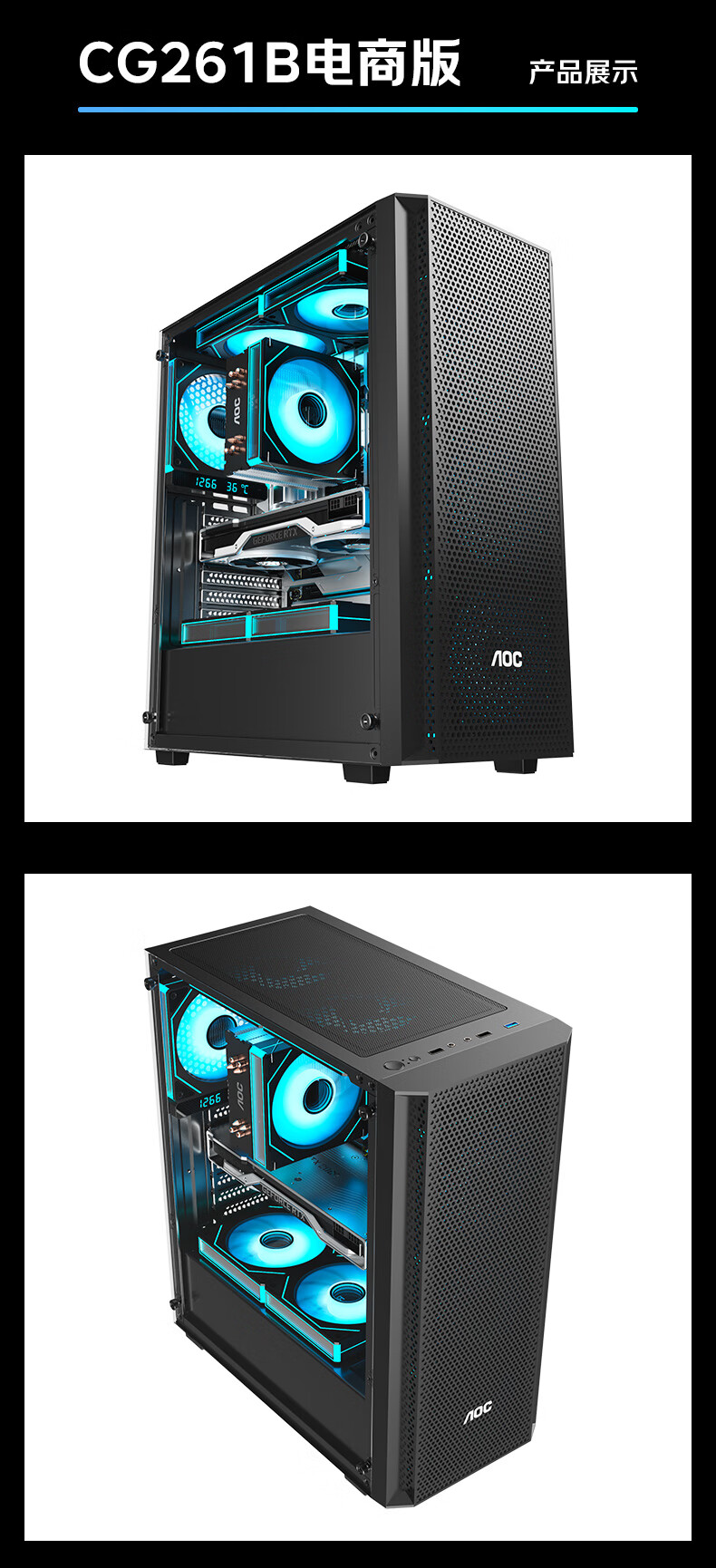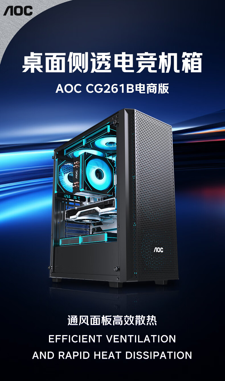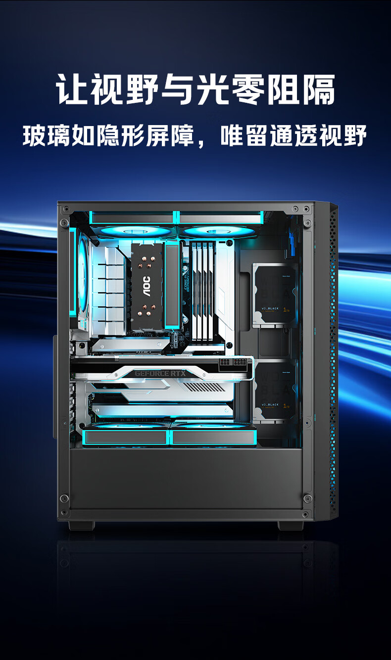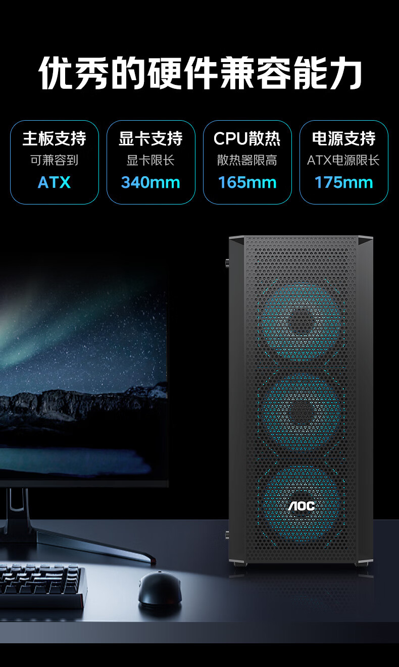 AOC台式电脑机箱CG261B黑色简约办公游戏静音主机箱支持ATX主板240水冷8风扇位