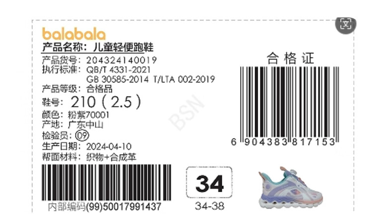 巴拉巴拉巴拉巴拉童鞋儿童运动鞋透气网布鞋女童跑步鞋春秋旋钮扣鞋子潮流 粉紫70001 35