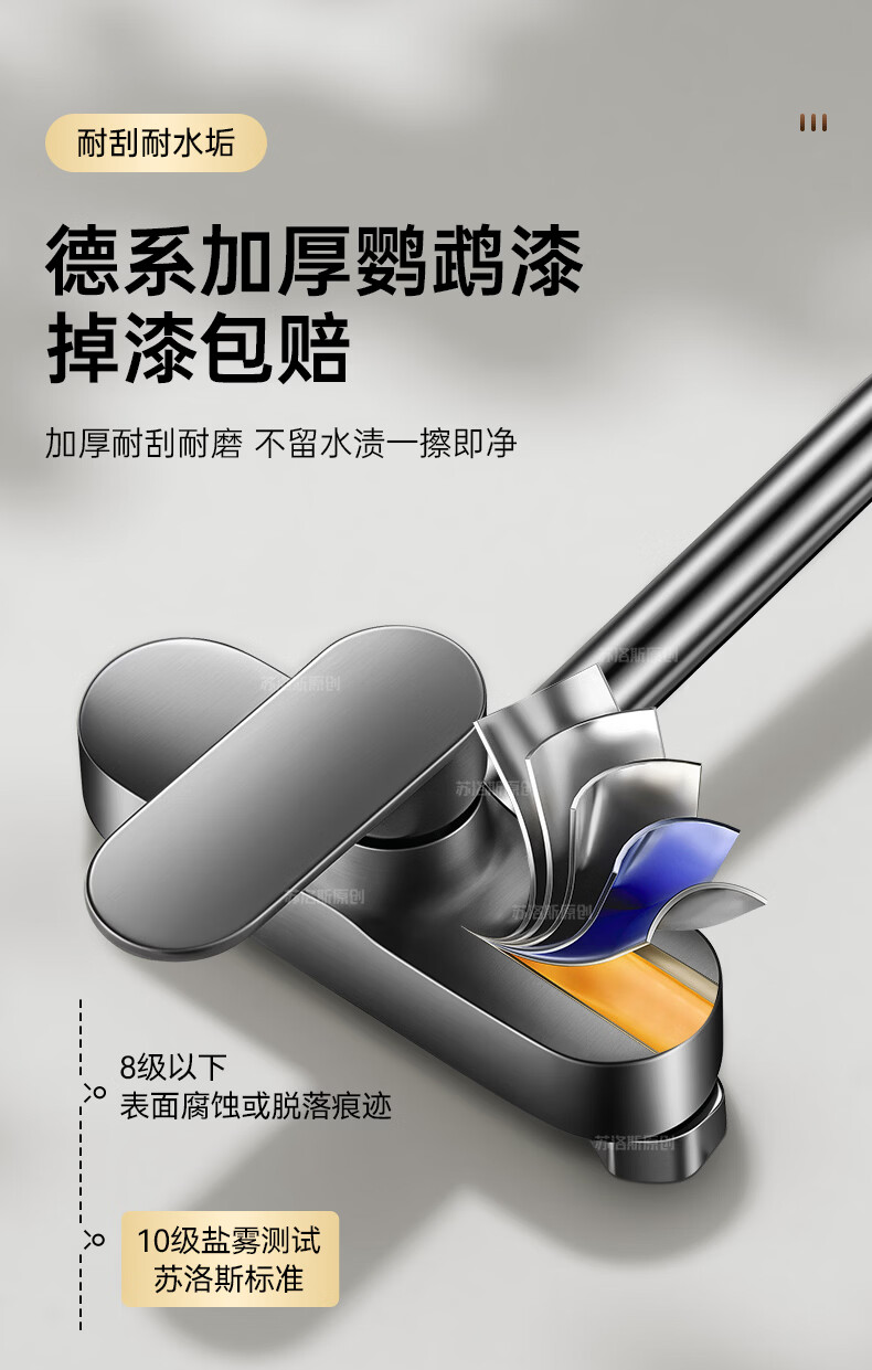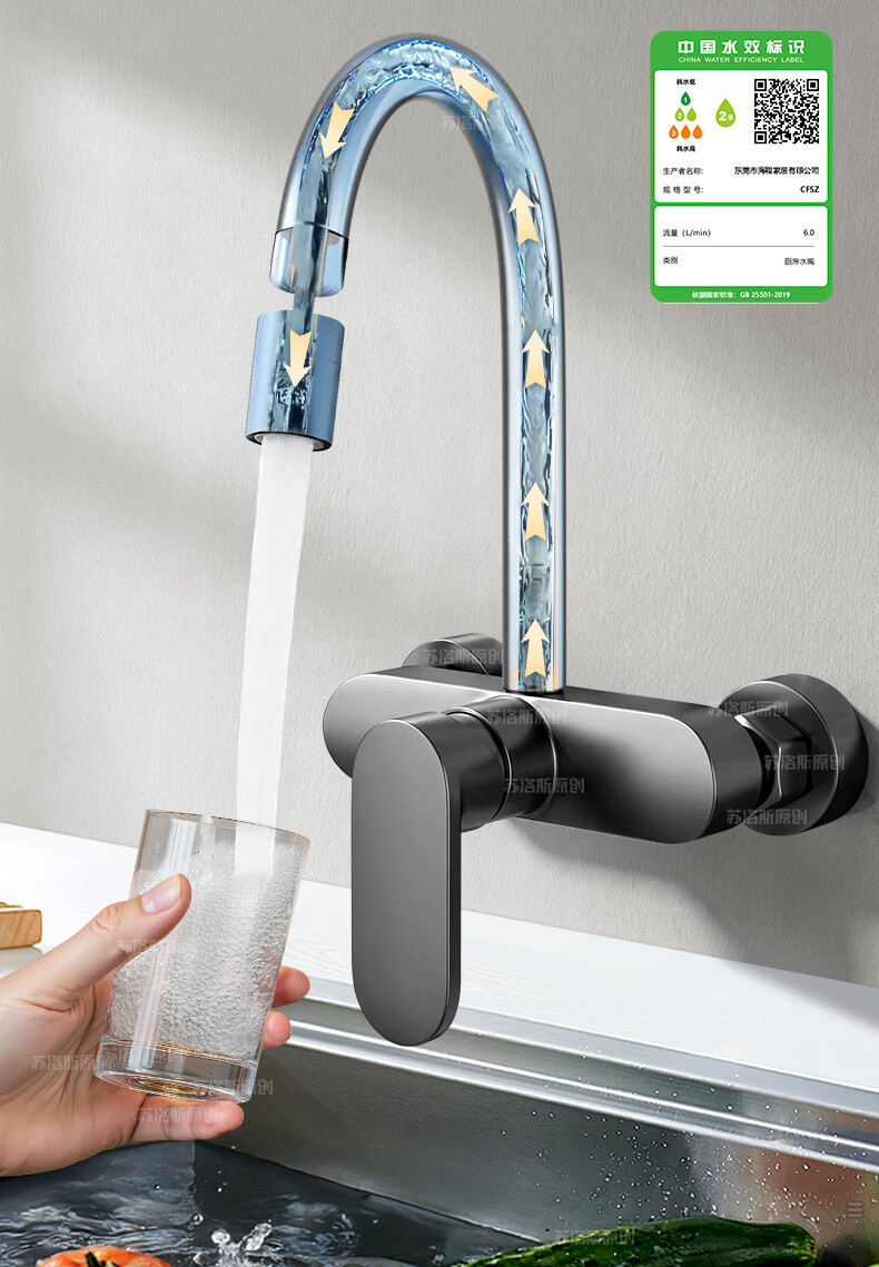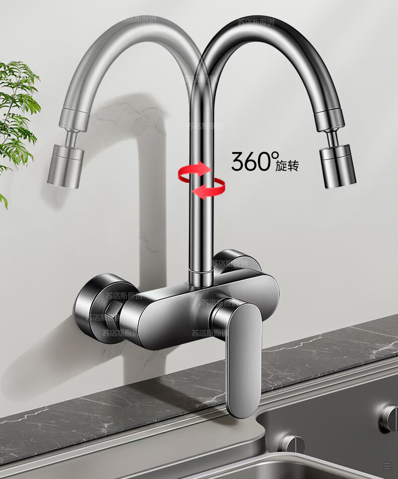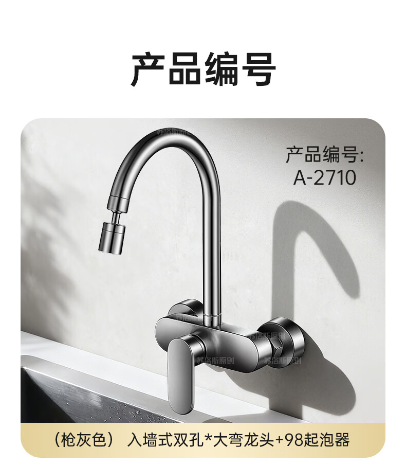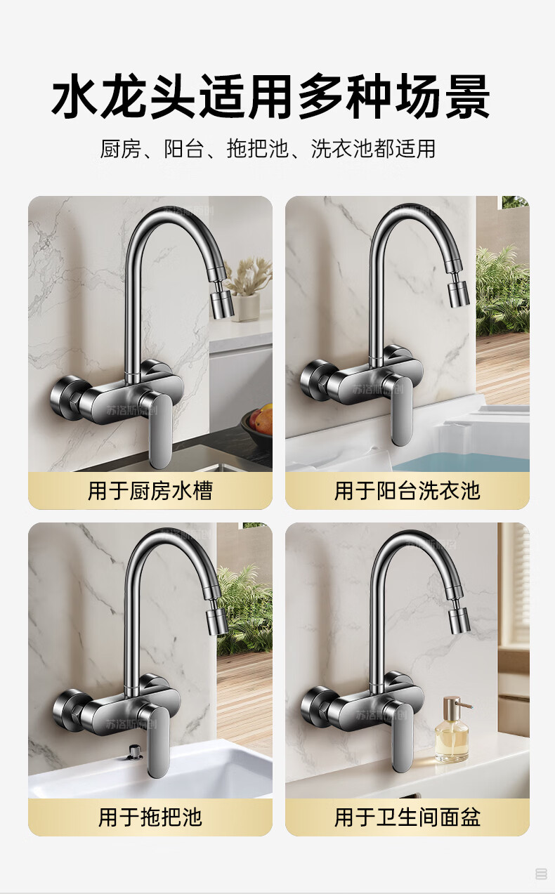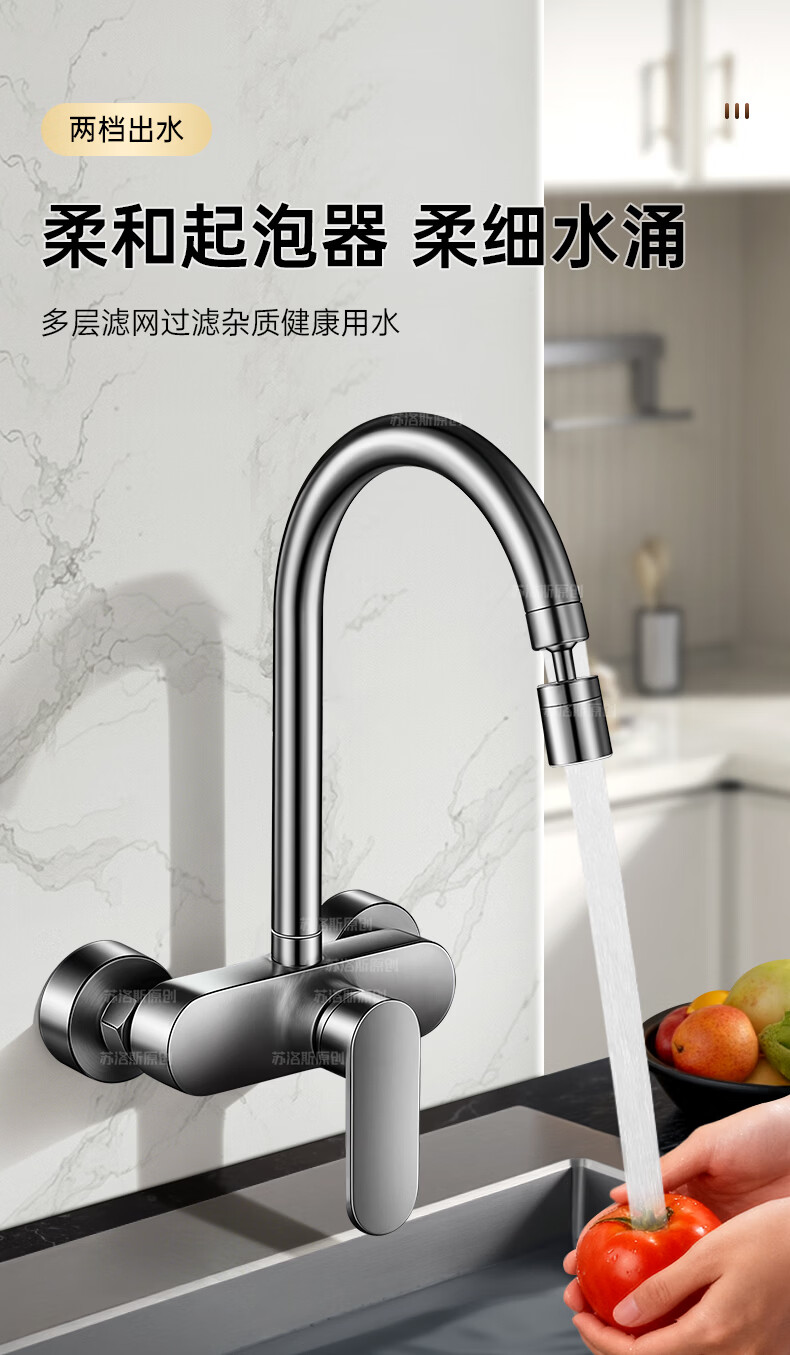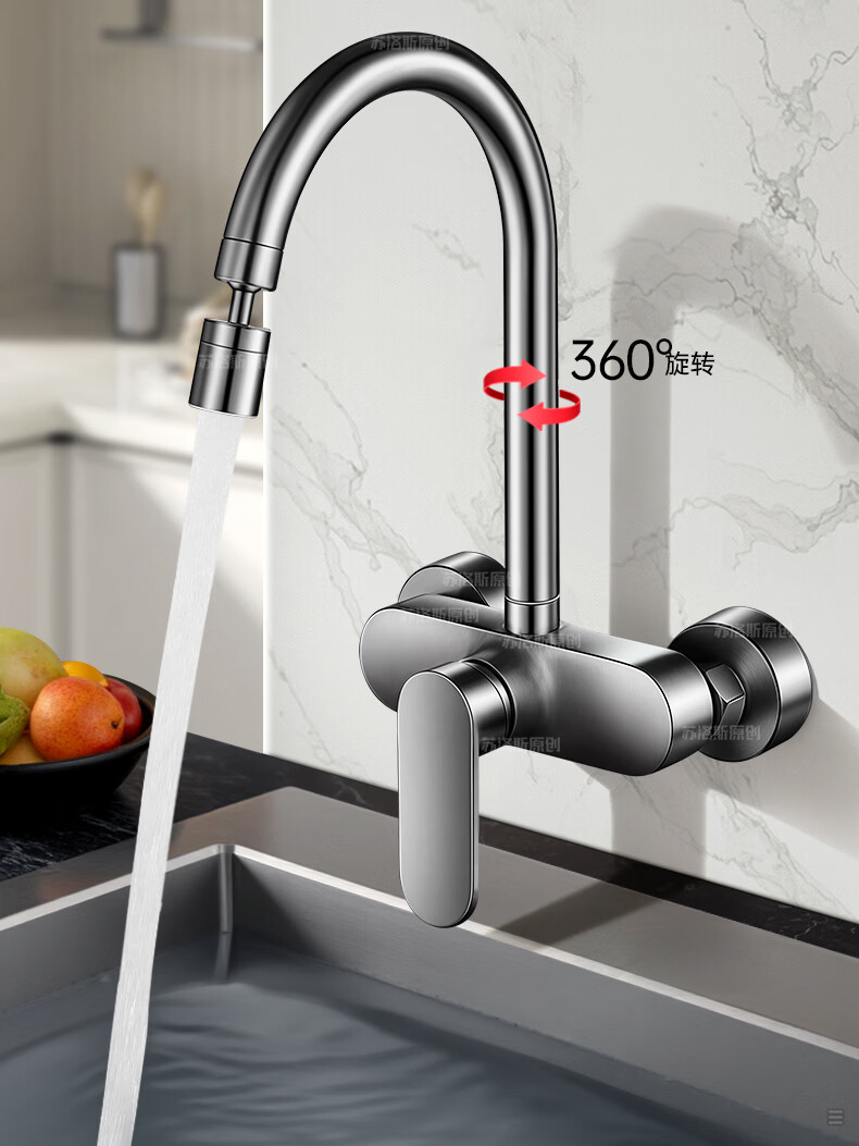 苏洛斯入墙式冷热水龙头厨房洗菜盆卫生间洗衣台阳台墙壁双孔龙头防溅水 【枪灰】两档增压防溅丨加厚精铜主体 自由万向旋转丨久用不生锈不掉漆