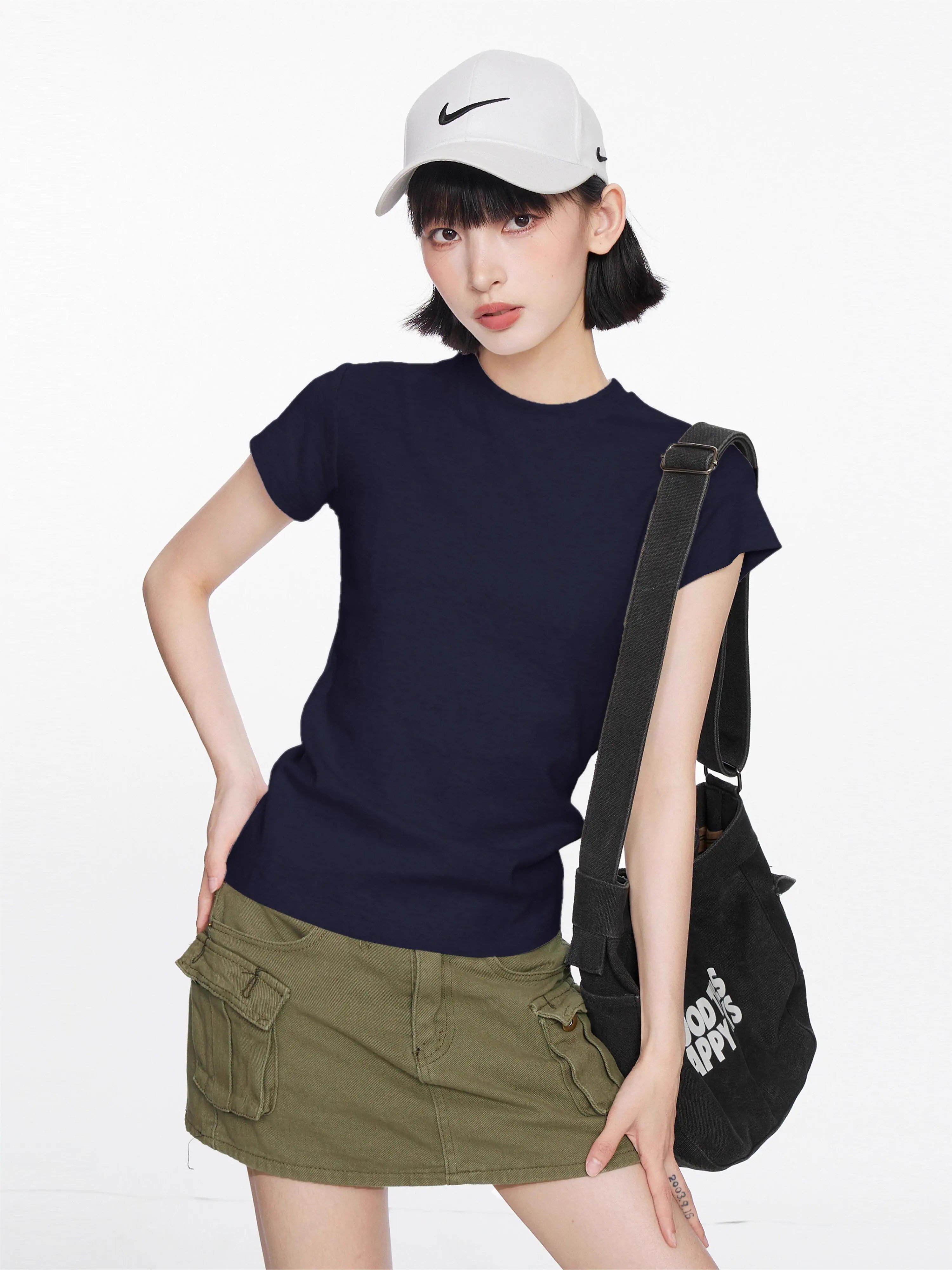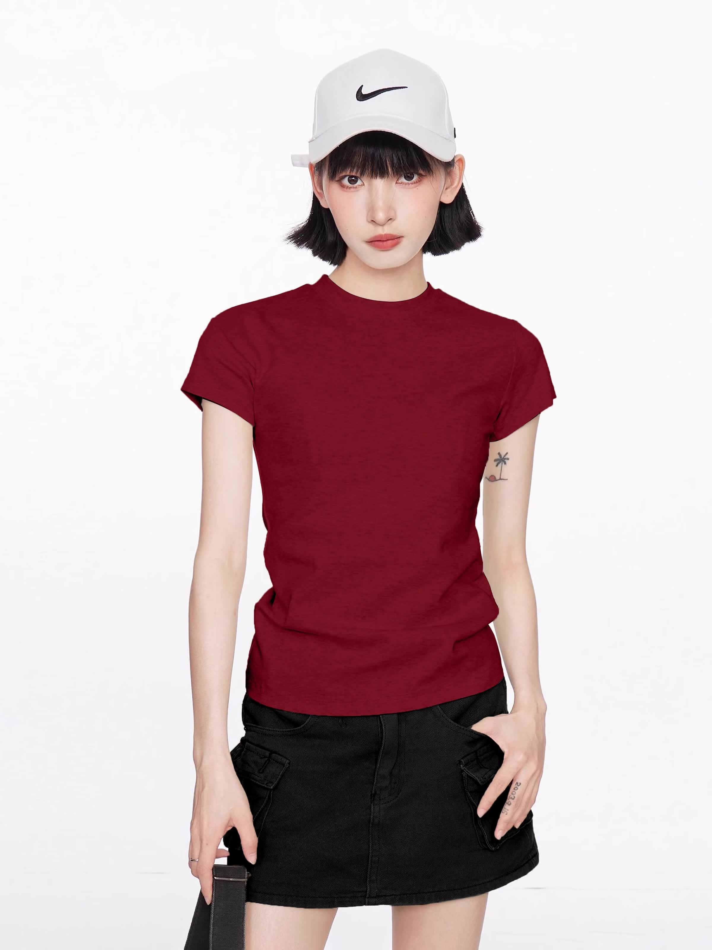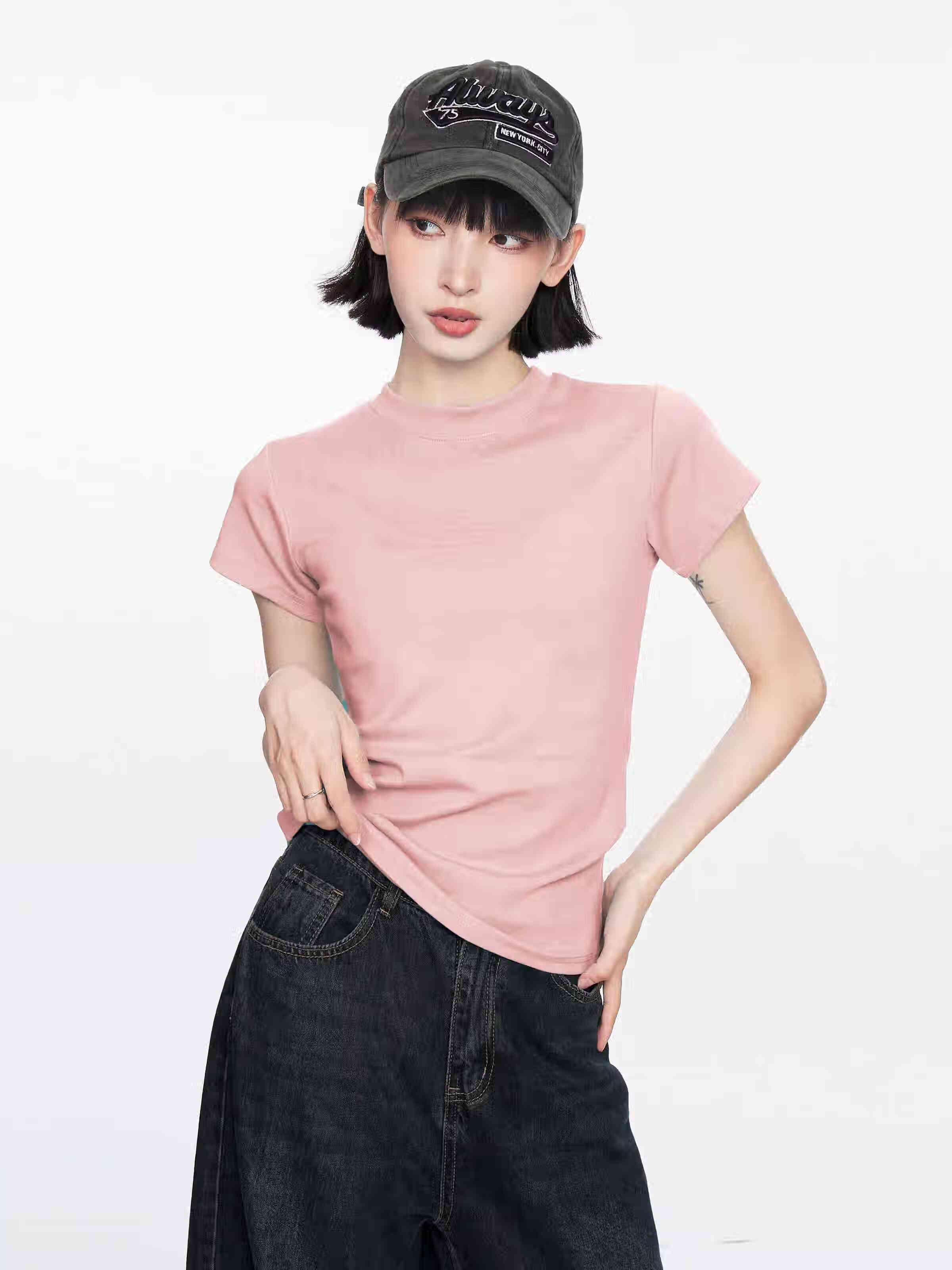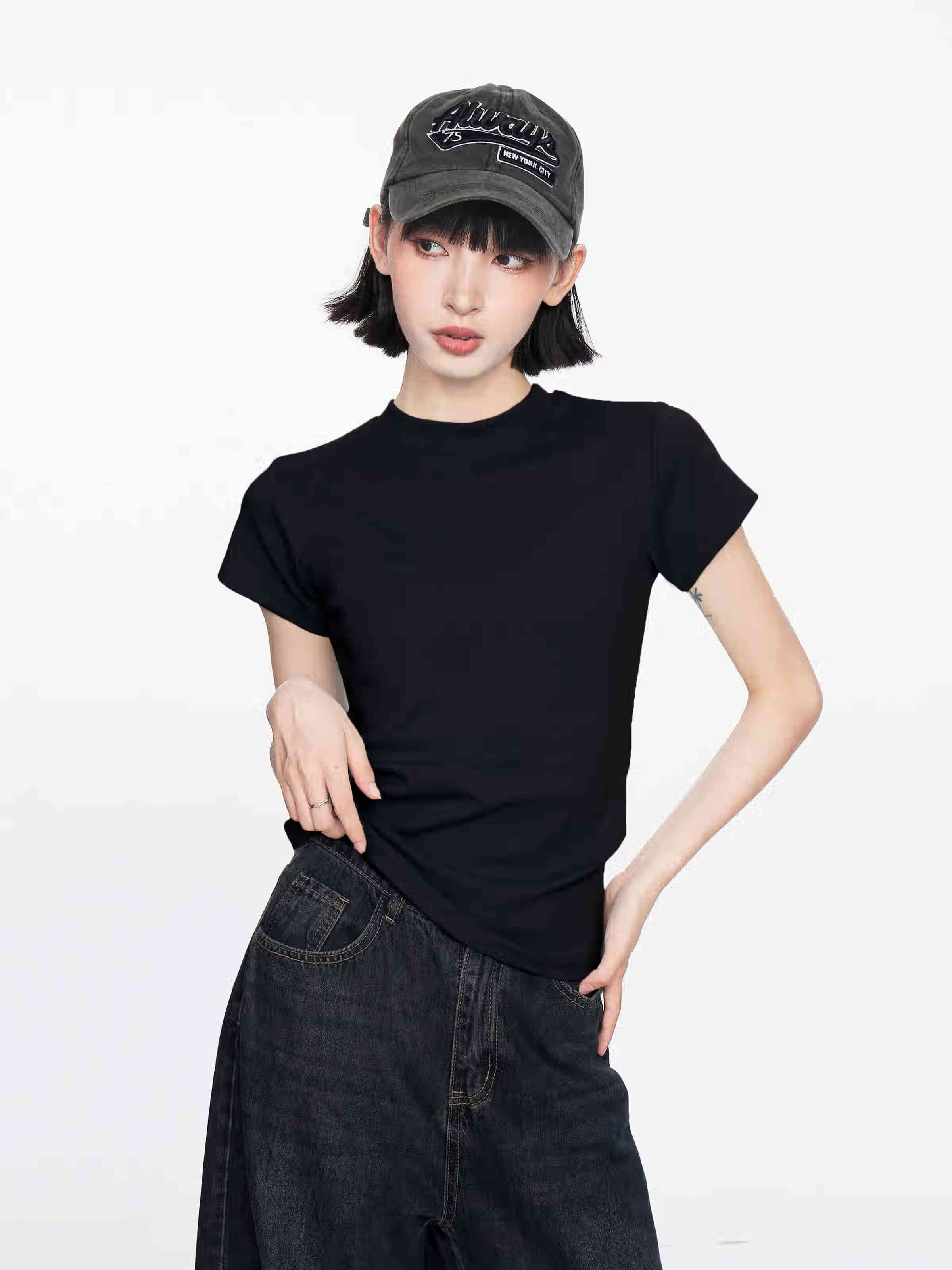 【地素DZZIT同款】纯棉正肩短袖t恤女修身显瘦纯色内搭GXXX11 黑色(高质量款) XL