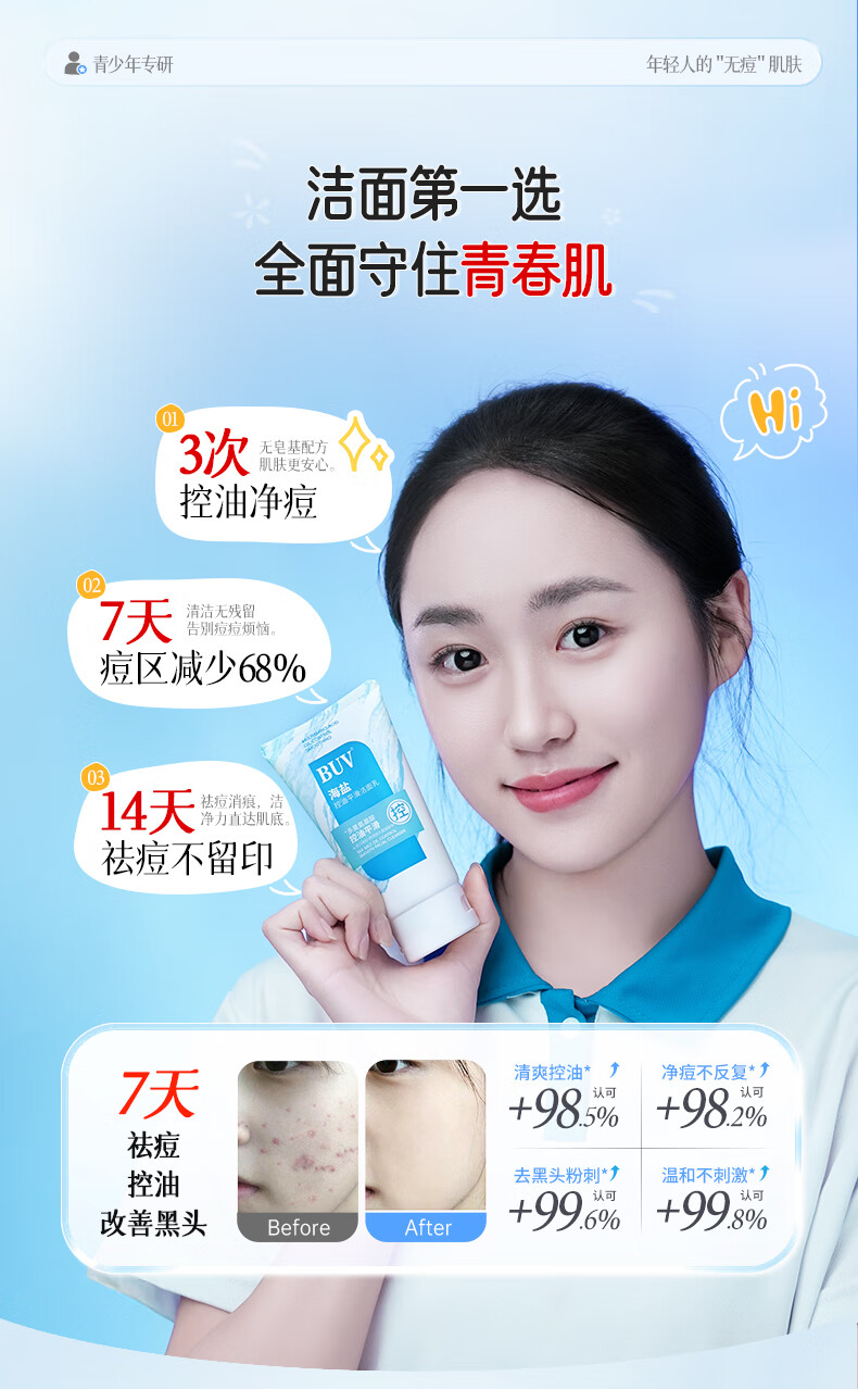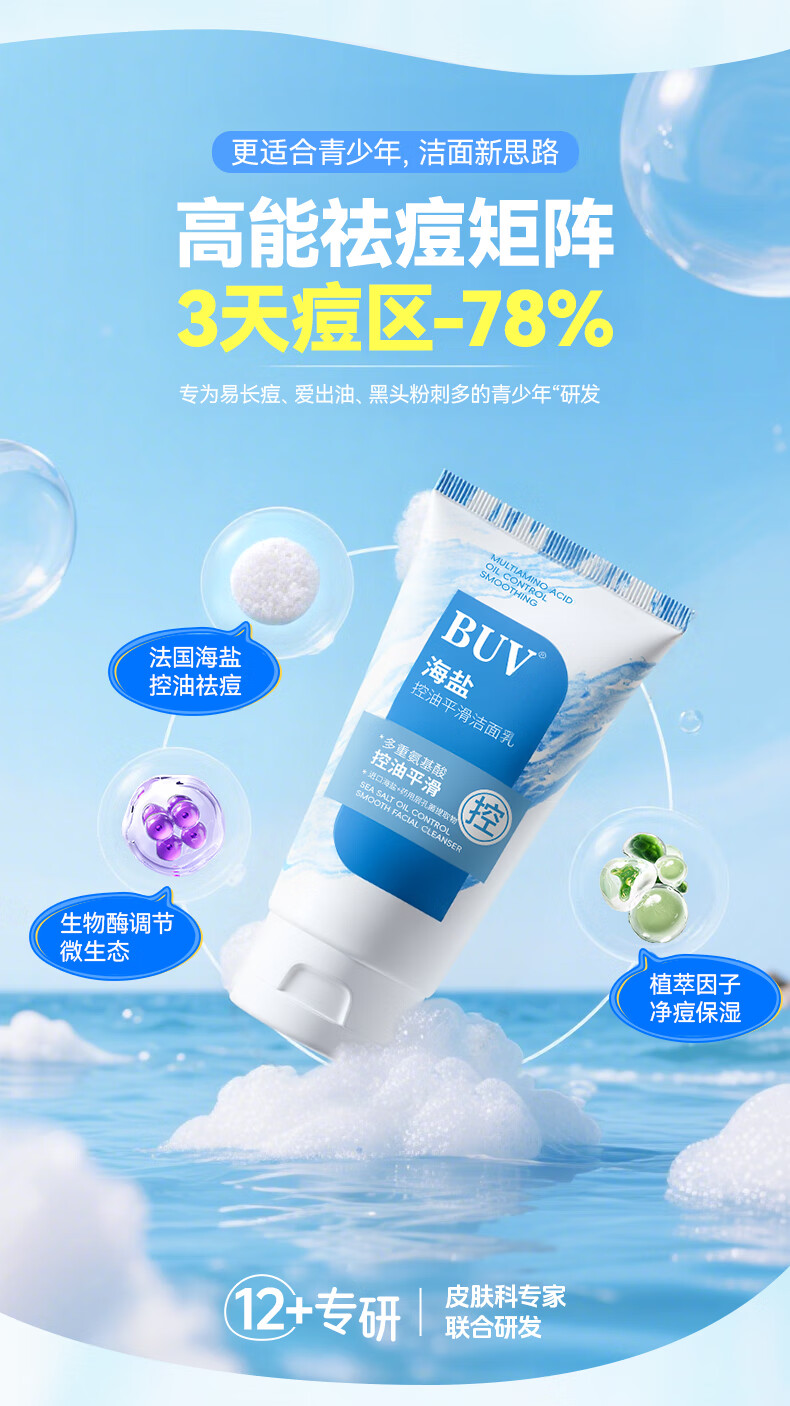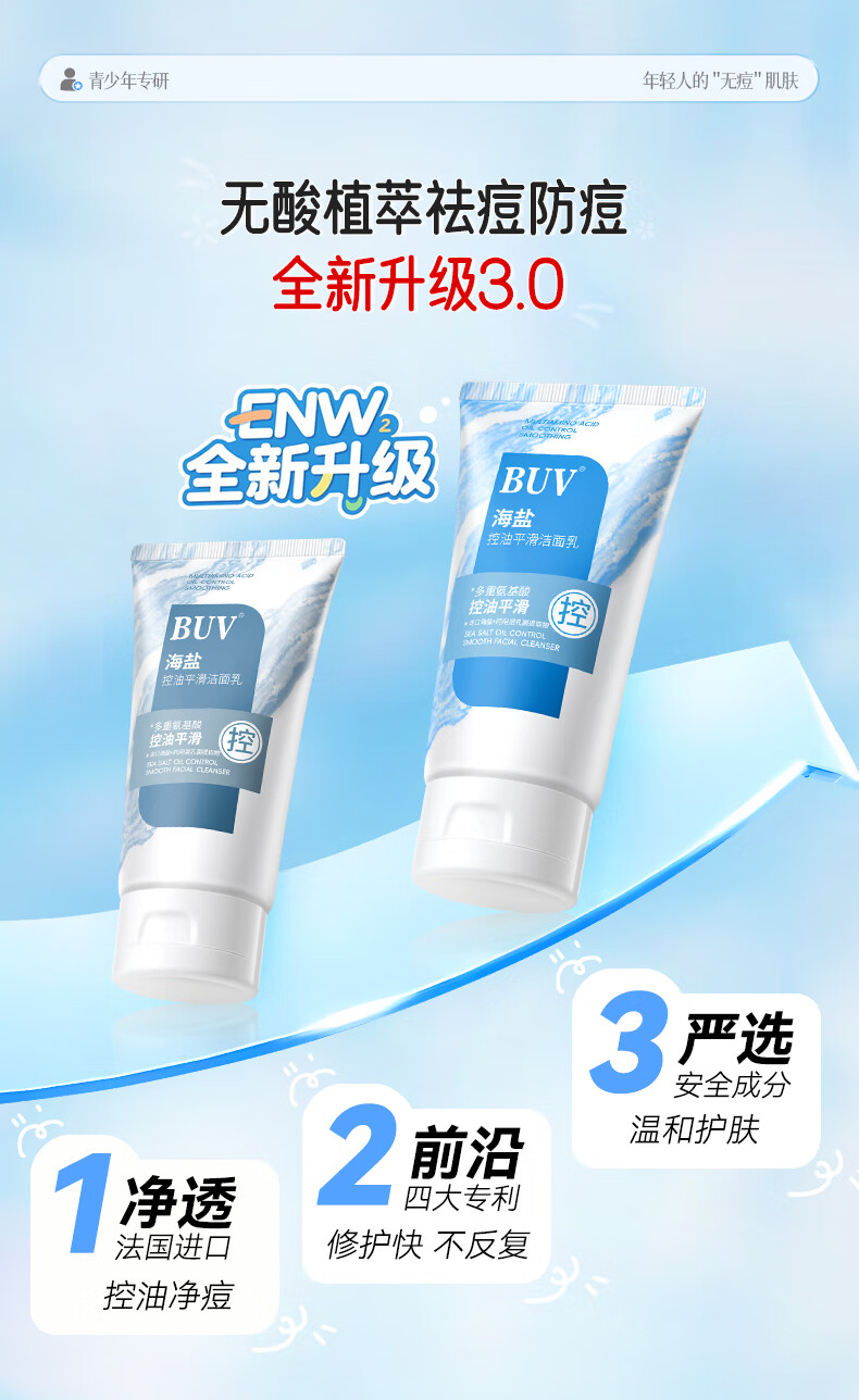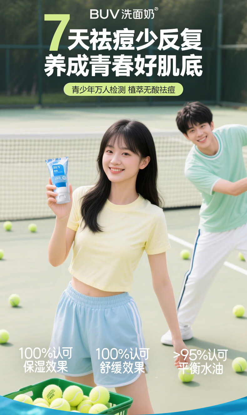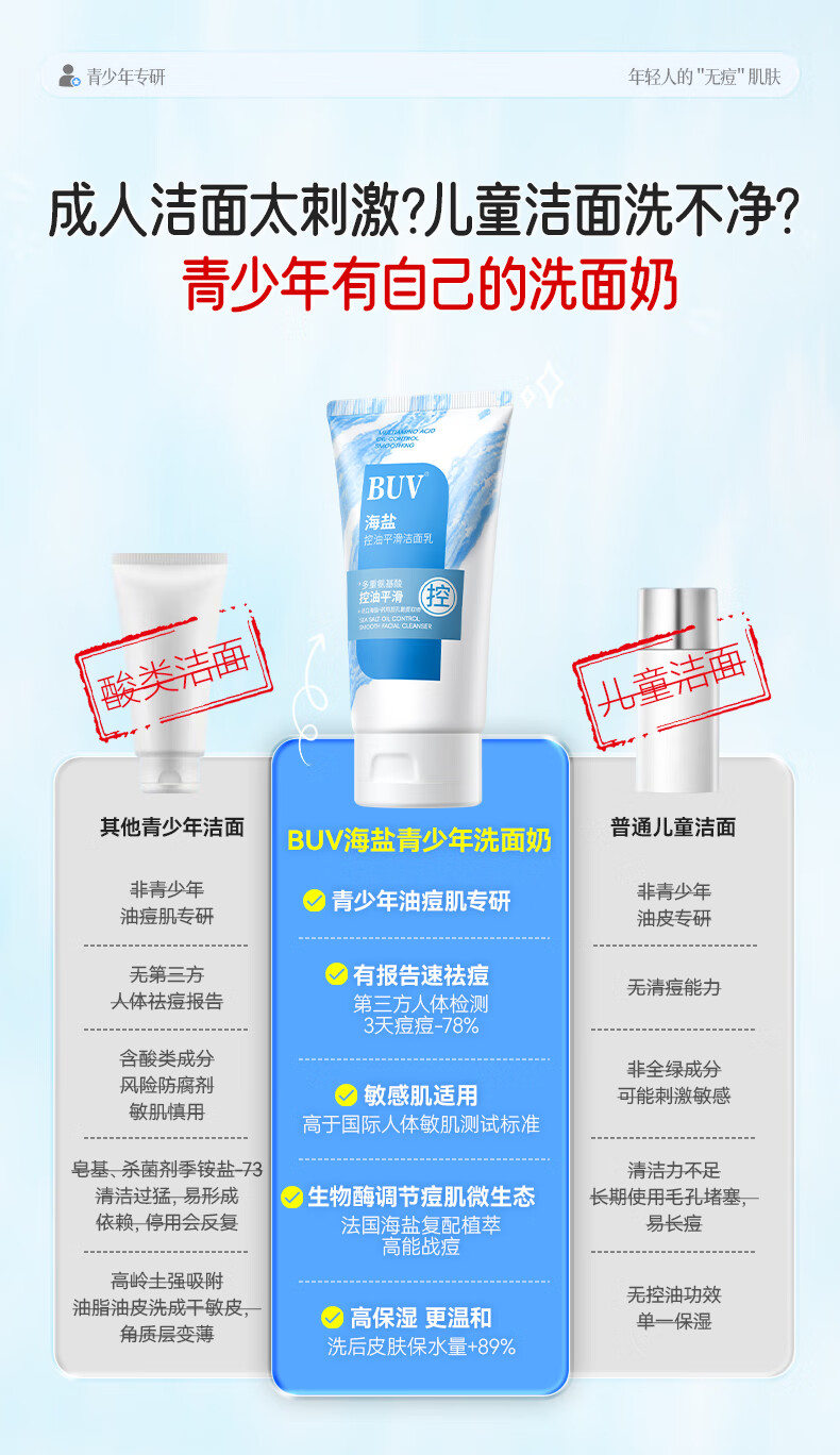BUV青少年洗面奶祛痘控油学生专用氨基酸保湿去黑头痘印缩毛孔金榜1