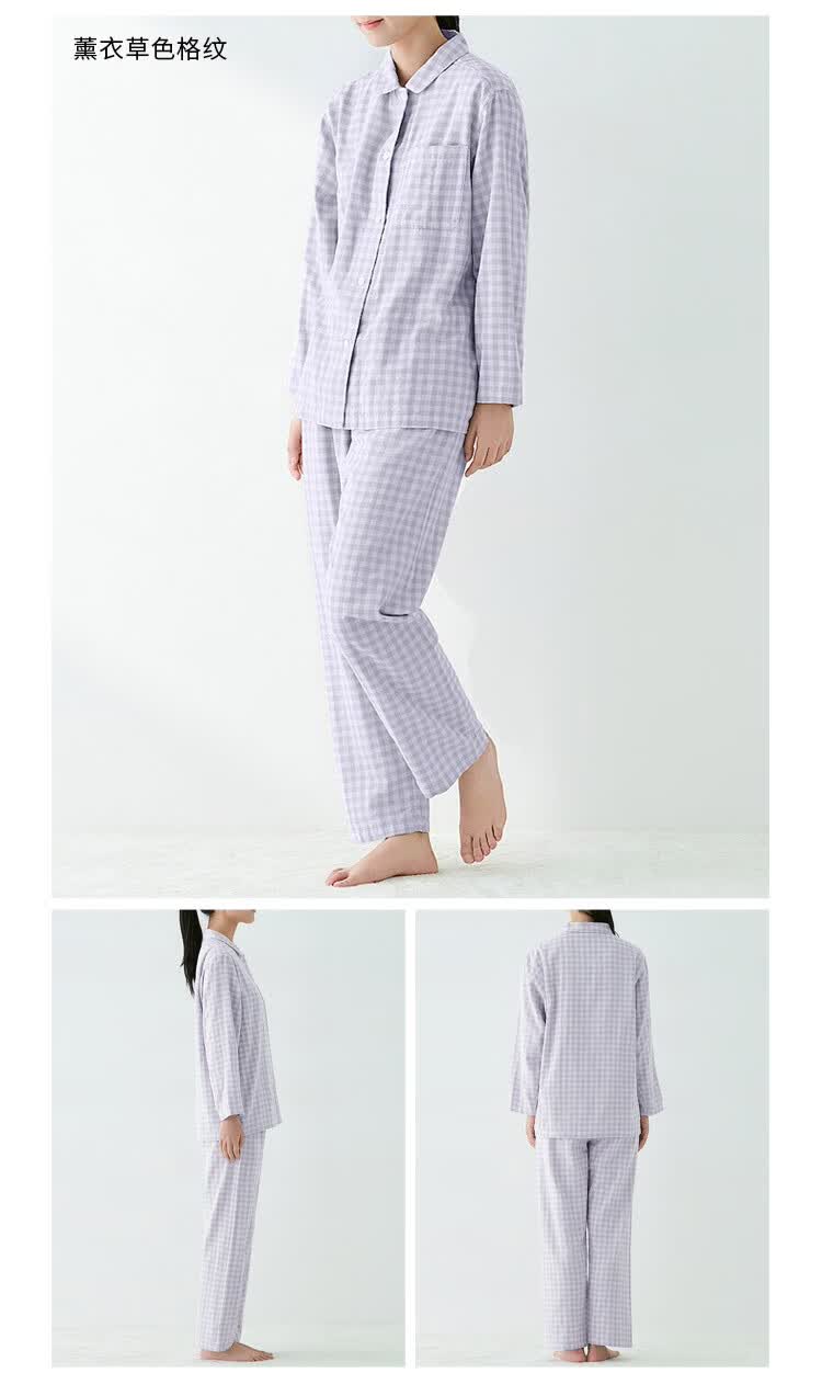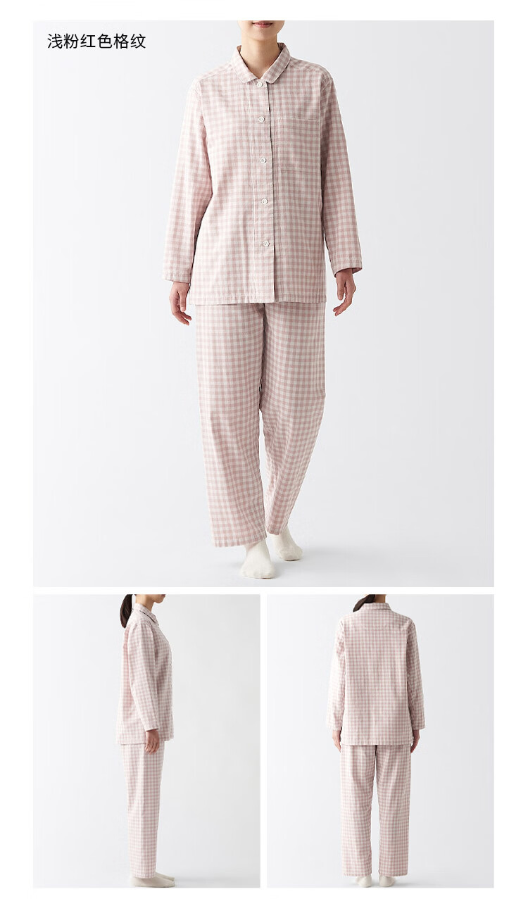 MUJI[自营限定款]女士无侧缝 双层纱织睡衣 纯棉家居服 浅粉色格纹 S