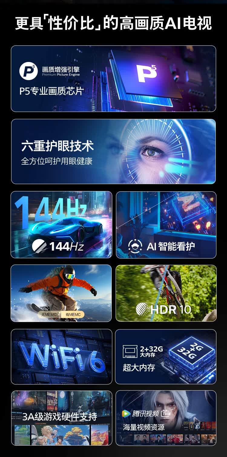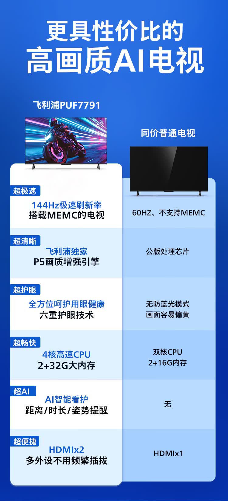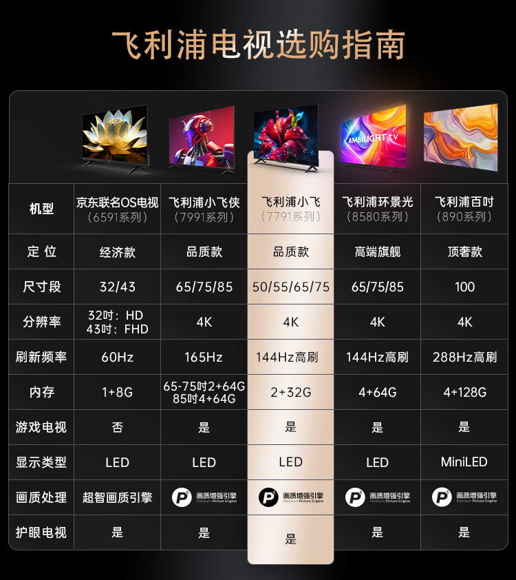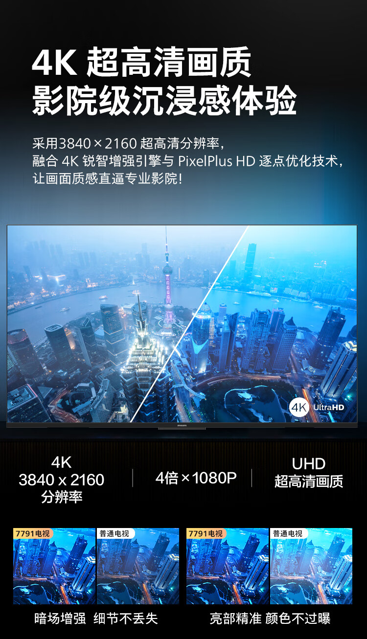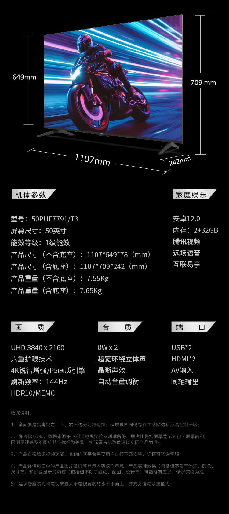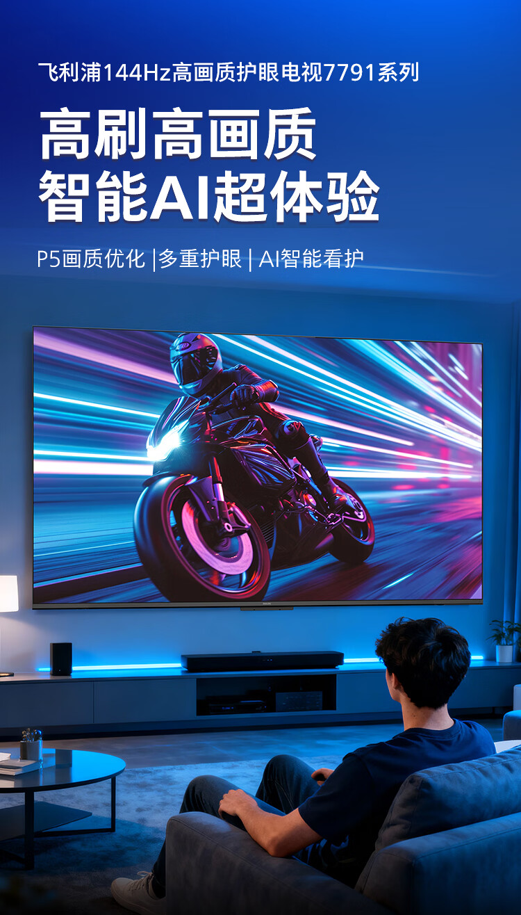 飞利浦(PHILIPS)电视 50英寸京东联名0S 4K超高清智能144Hz高刷护眼 家用液晶平板彩色电视机50PUF7791/T3