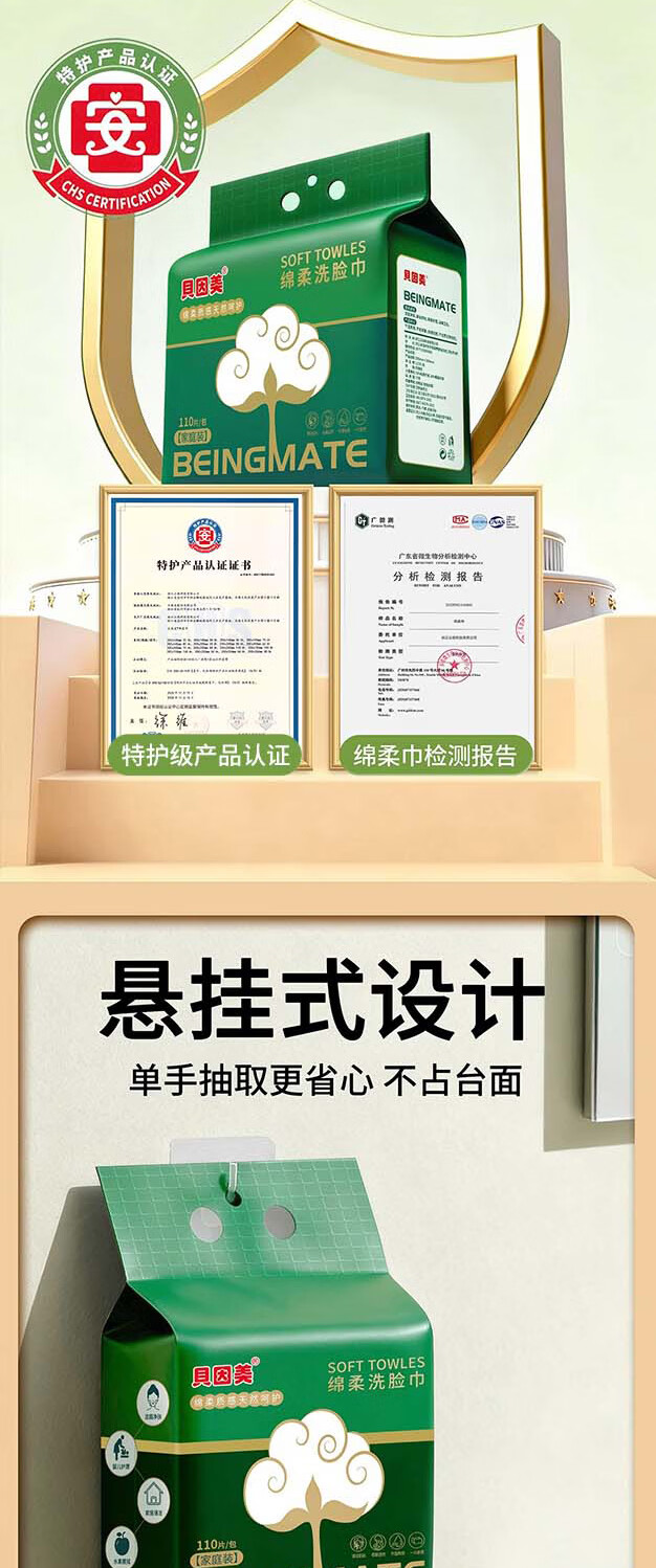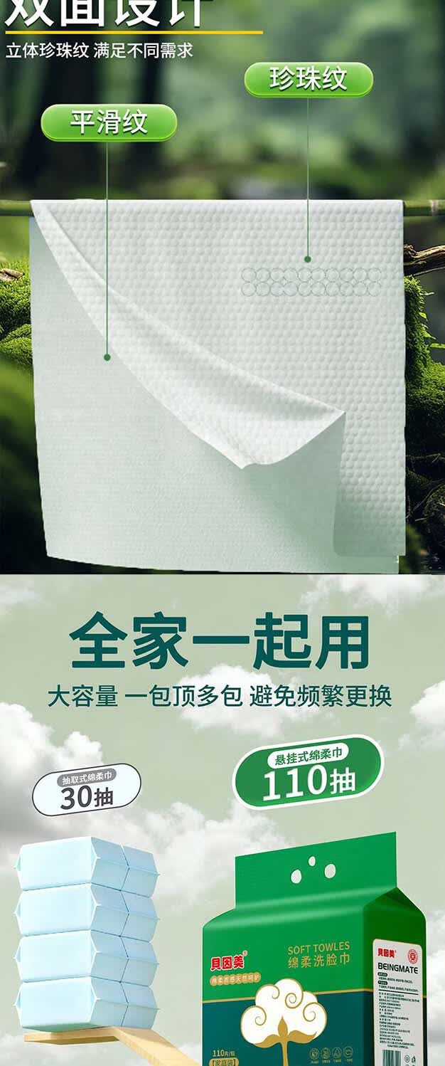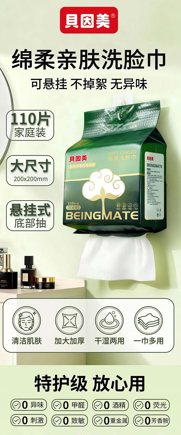 贝因美(Beingmate)一次性洗脸巾加大加厚悬挂式绵柔巾干湿两用洁面擦脸巾 110抽3提【悬挂式实惠装】