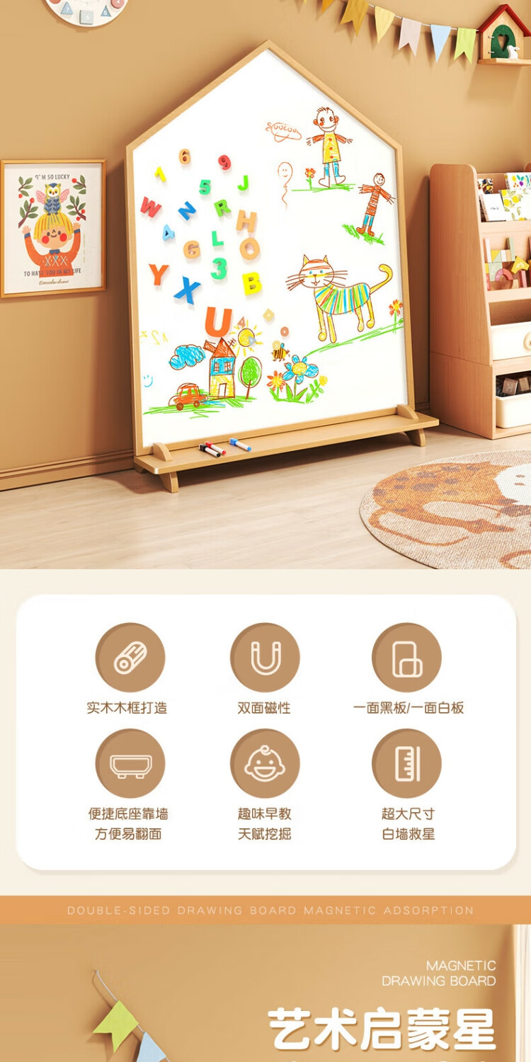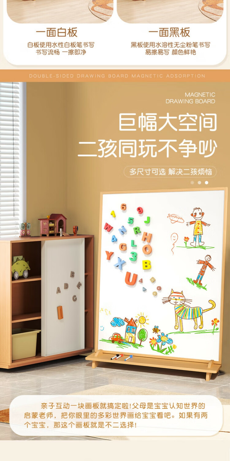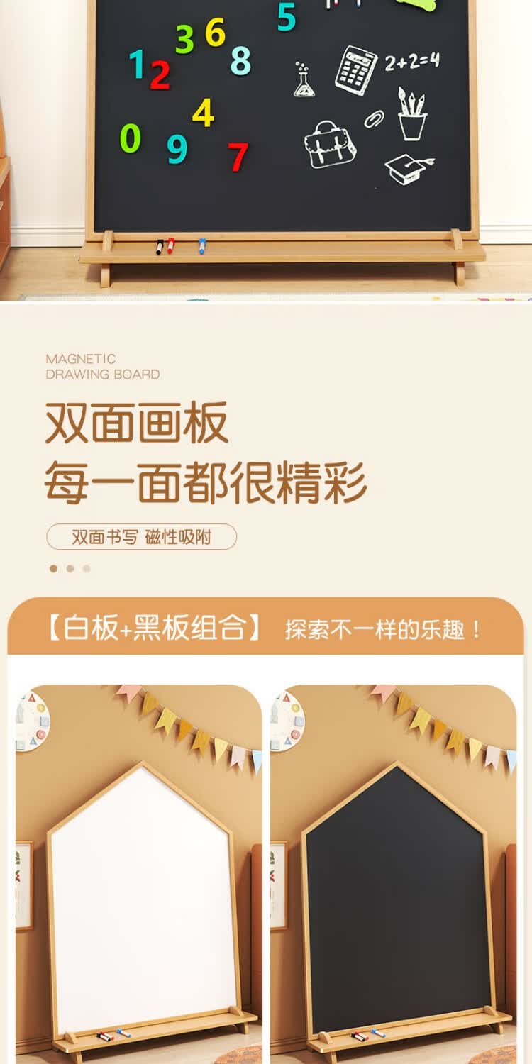 磁博士ciboshi家用儿童画板宝宝磁性双面小黑板支架式涂色涂鸦移动可擦写字白板 【米色】方型画板90*120cm带底座】双面白+黑