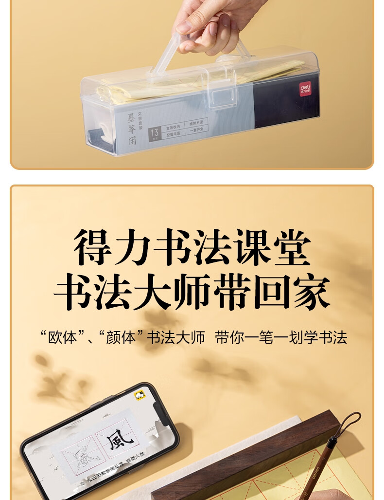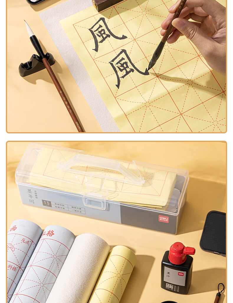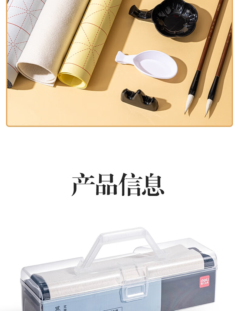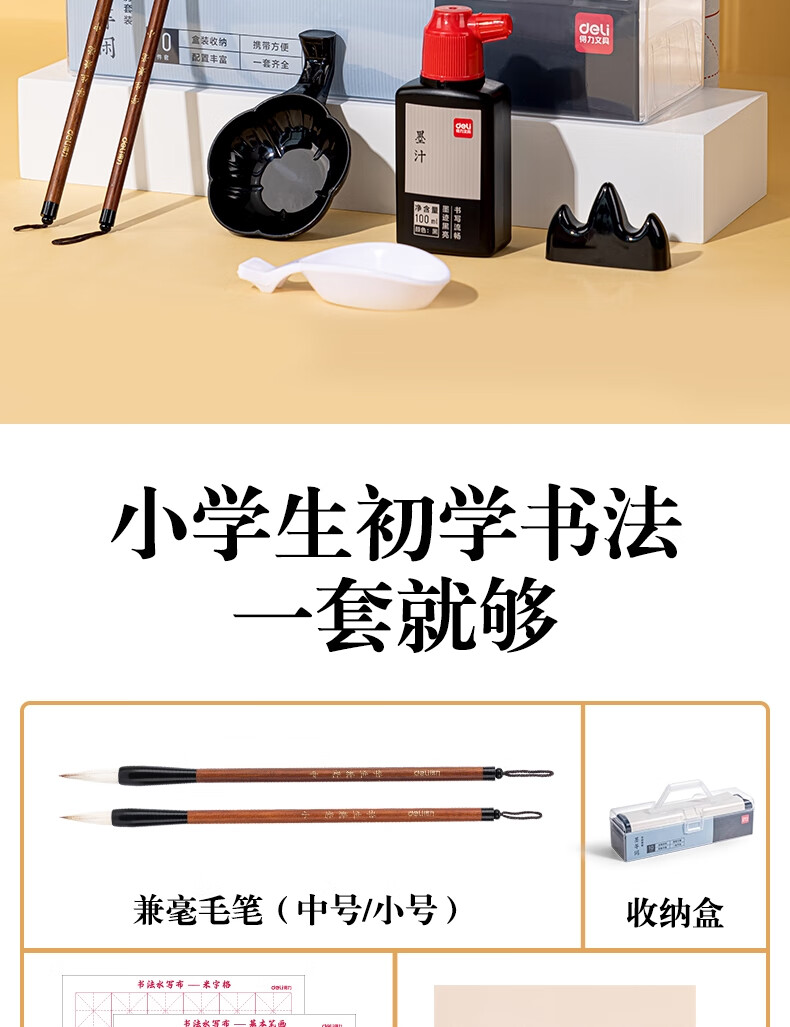 得力(deli)文房用品书法套装 文房四宝毛笔砚台宣纸收纳箱初学者学生入门 文房套装10件套开学用品小学生礼物