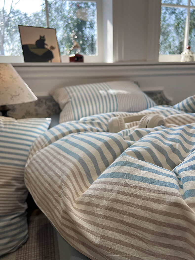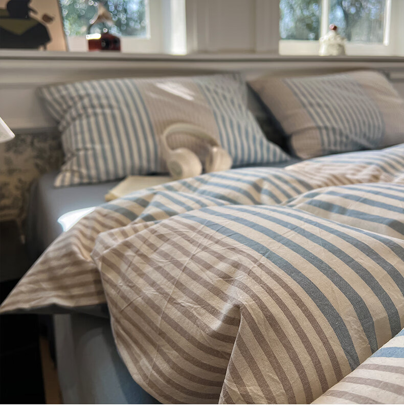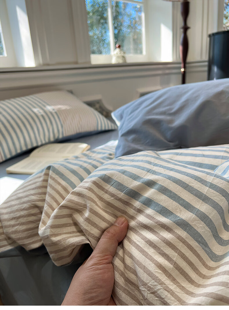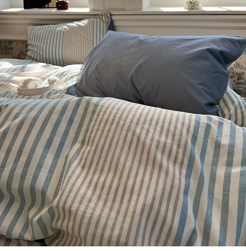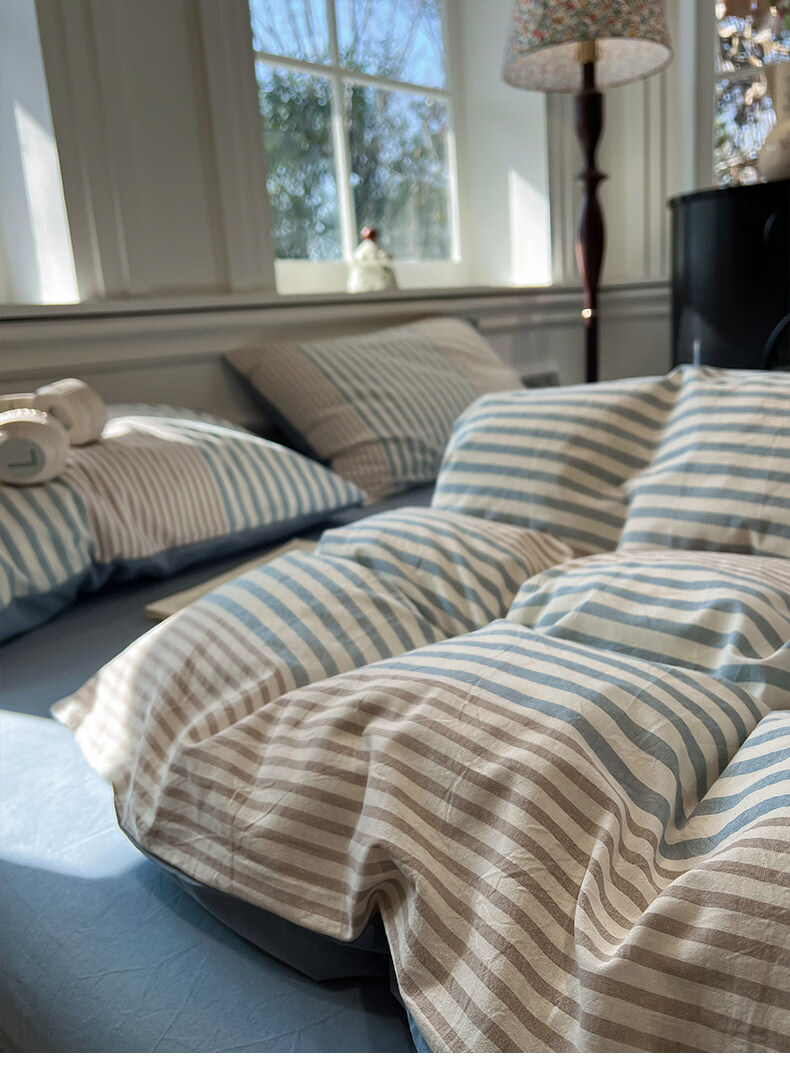 苏萱现代简约条纹全棉水洗棉床上四件套纯棉1.5m公寓被套床单四季床品 凯西亚-兰 1.8m 床单款 四件套-被套200x230cm