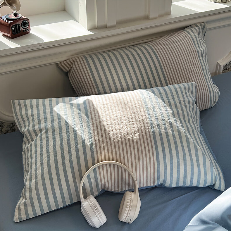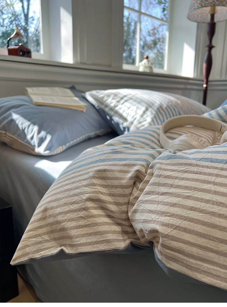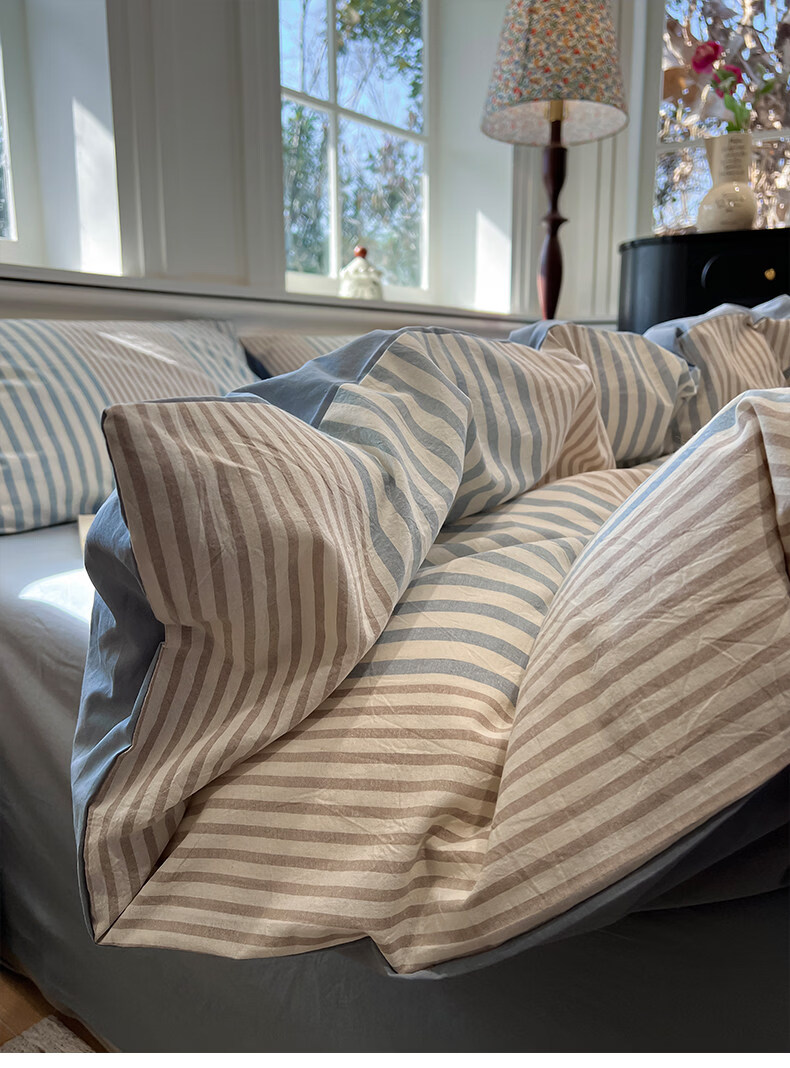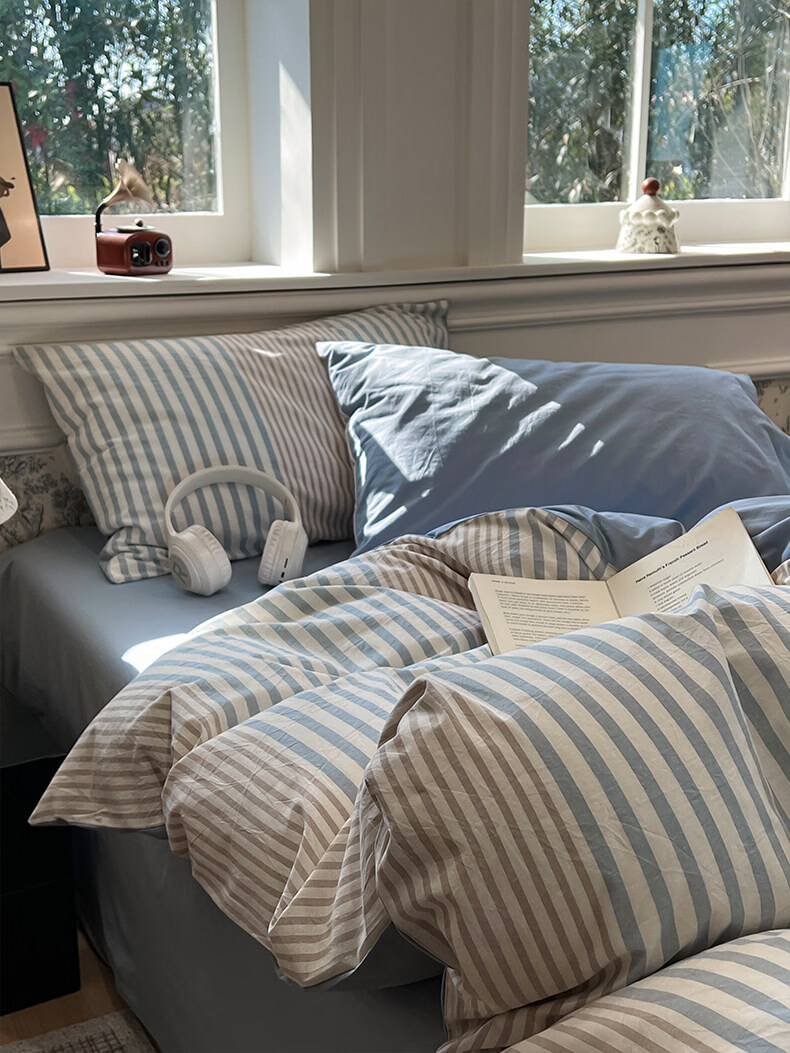 苏萱现代简约条纹全棉水洗棉床上四件套纯棉1.5m公寓被套床单四季床品 凯西亚-兰 1.8m 床单款 四件套-被套200x230cm