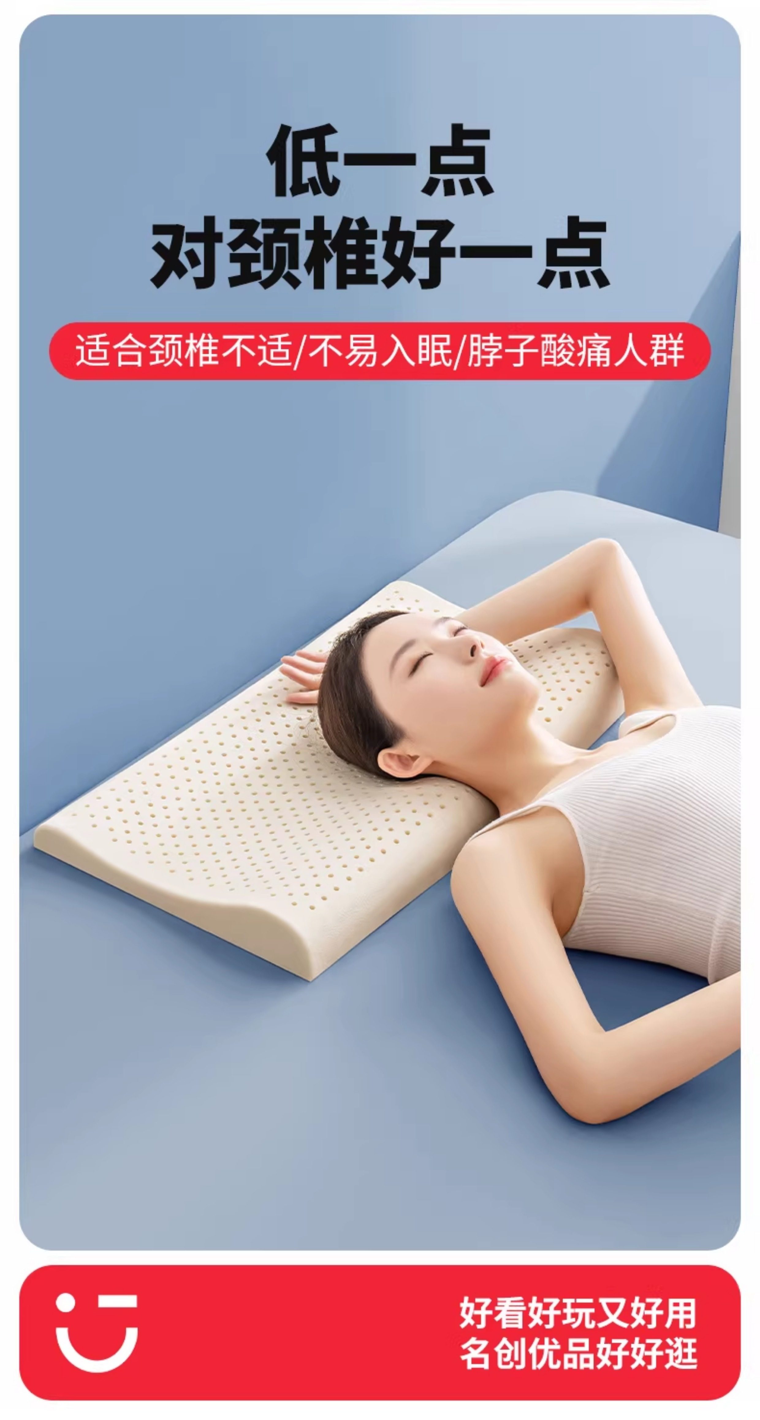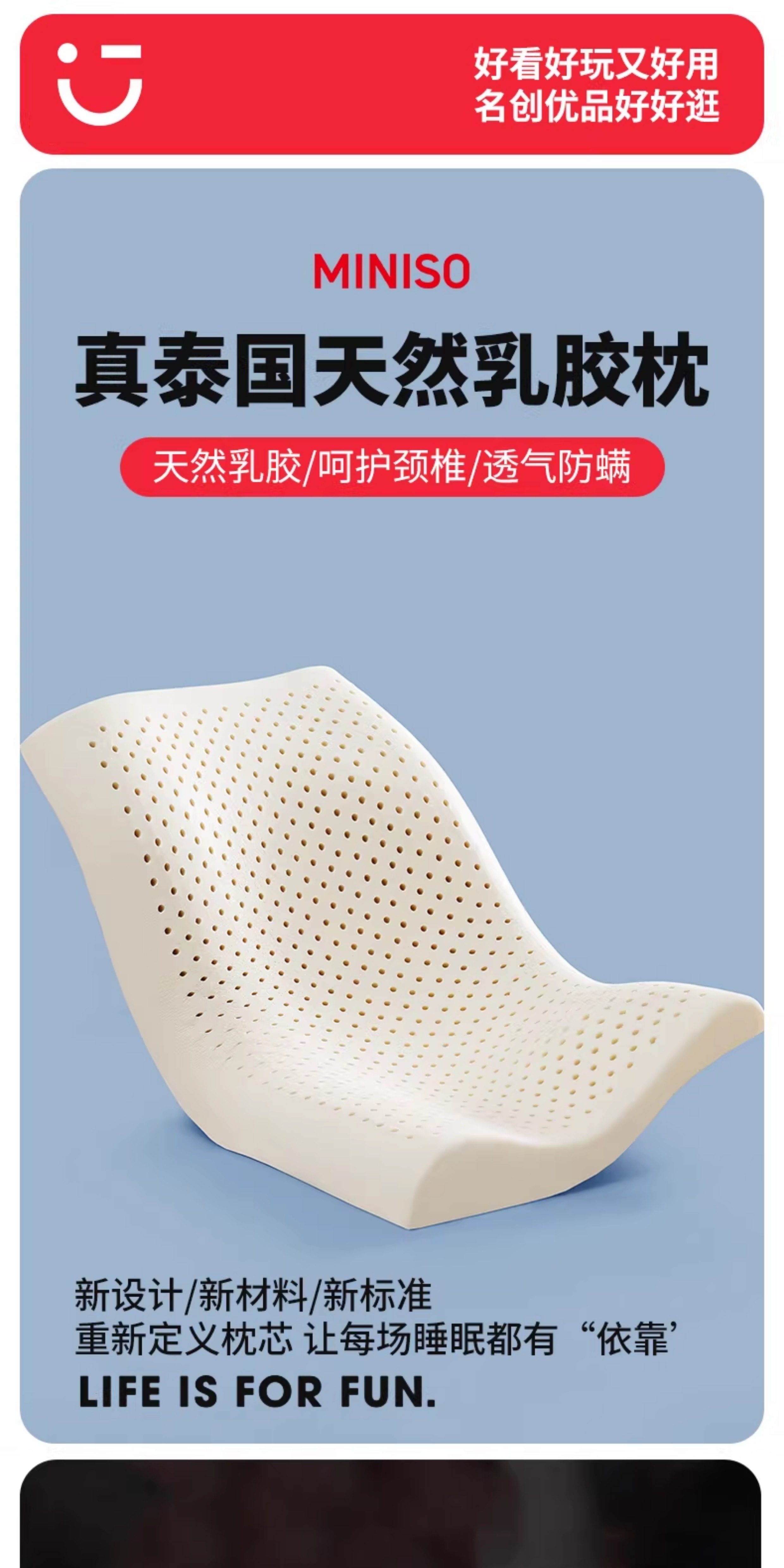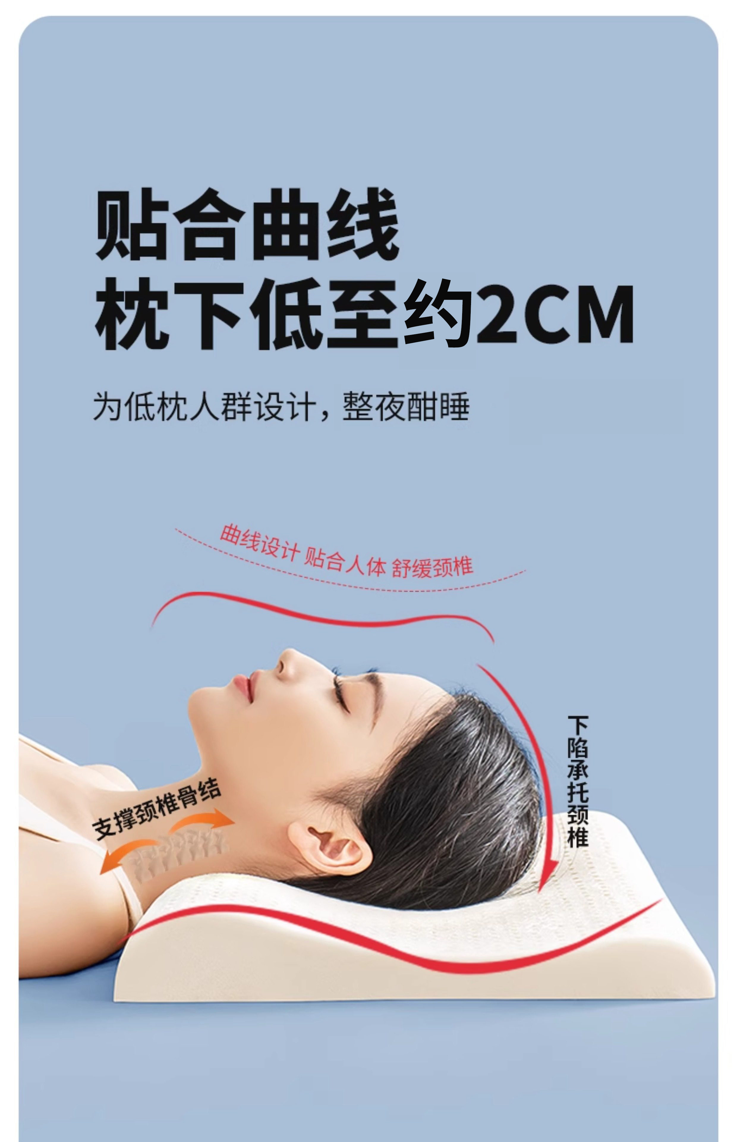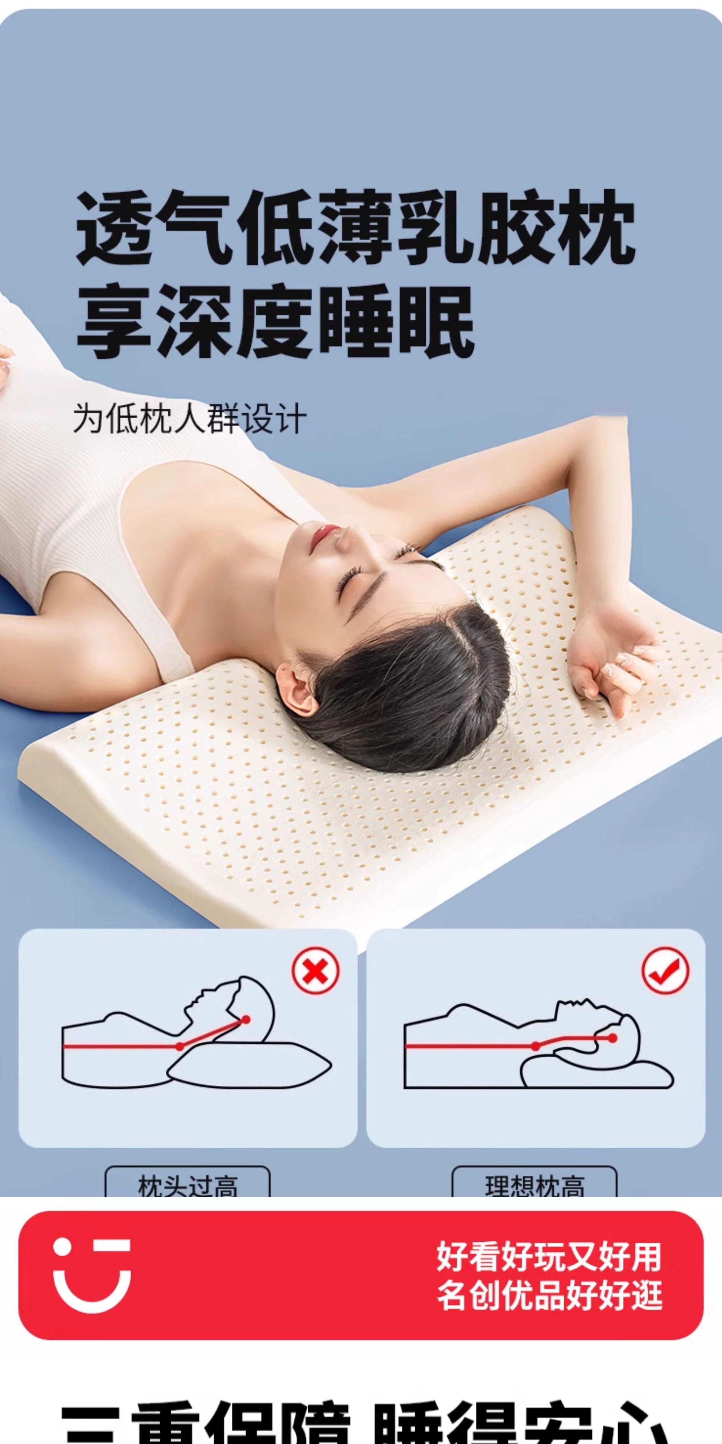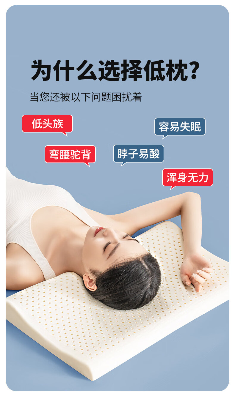 名创优品(MINISO)低枕头乳胶枕芯 护颈枕助睡眠成人家用天然橡胶枕高低枕 【超低枕-睡下高度约2cm】赠A类针织枕套 无规格