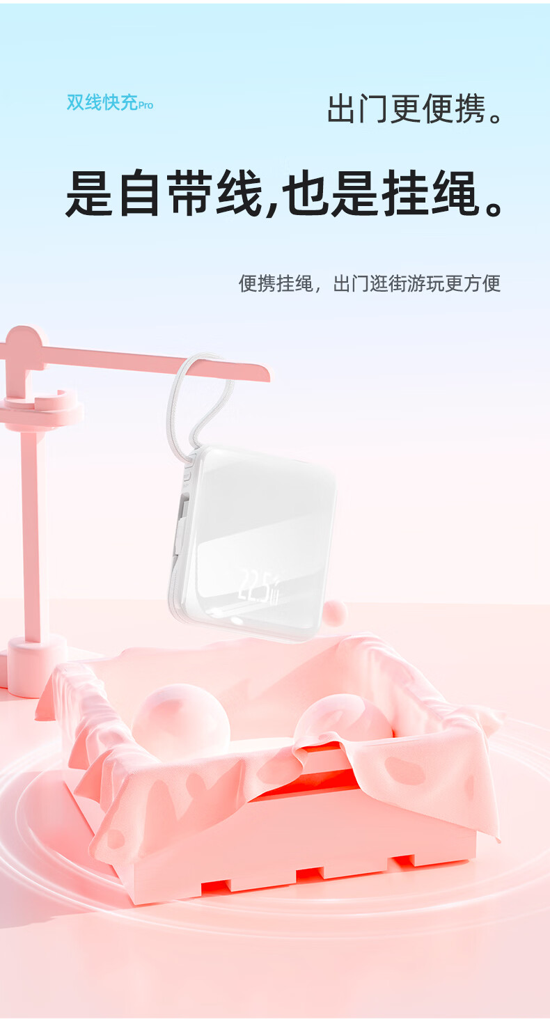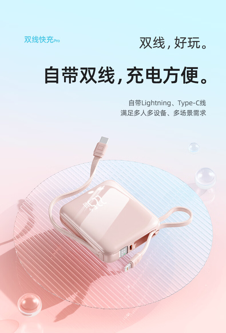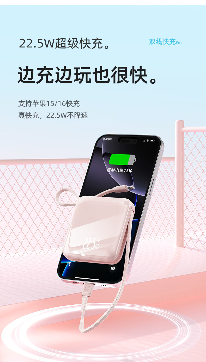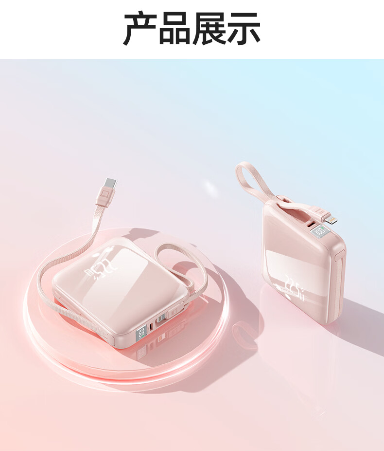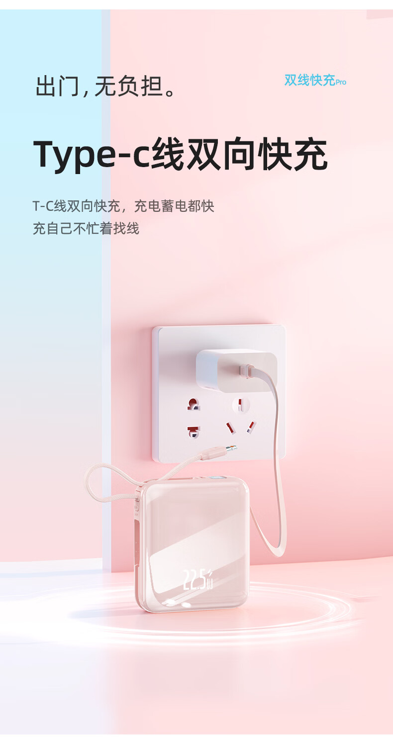 凯舟3C认证充电宝可上飞机2025年快充自带线20000毫安超大容量适用安卓苹果手机移动电源小巧便携定制 粉色【22.5W快充口袋版】3C认证+可上飞机 10000毫安