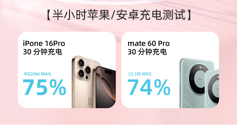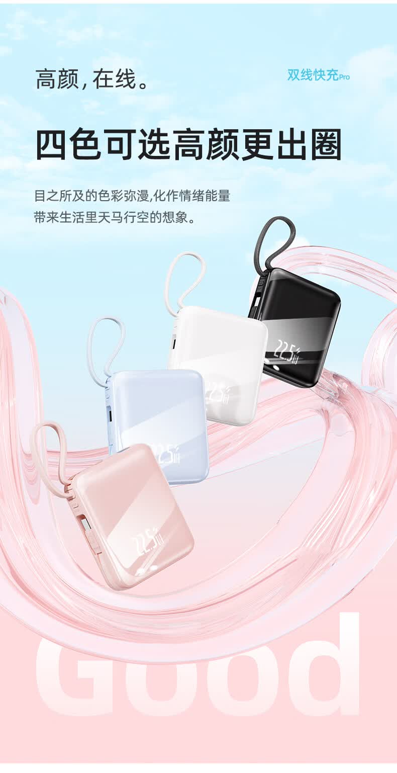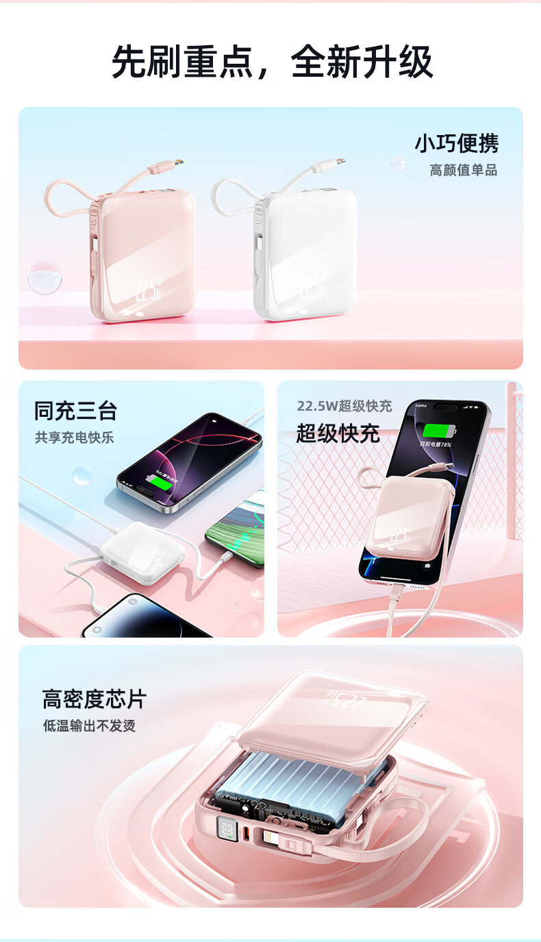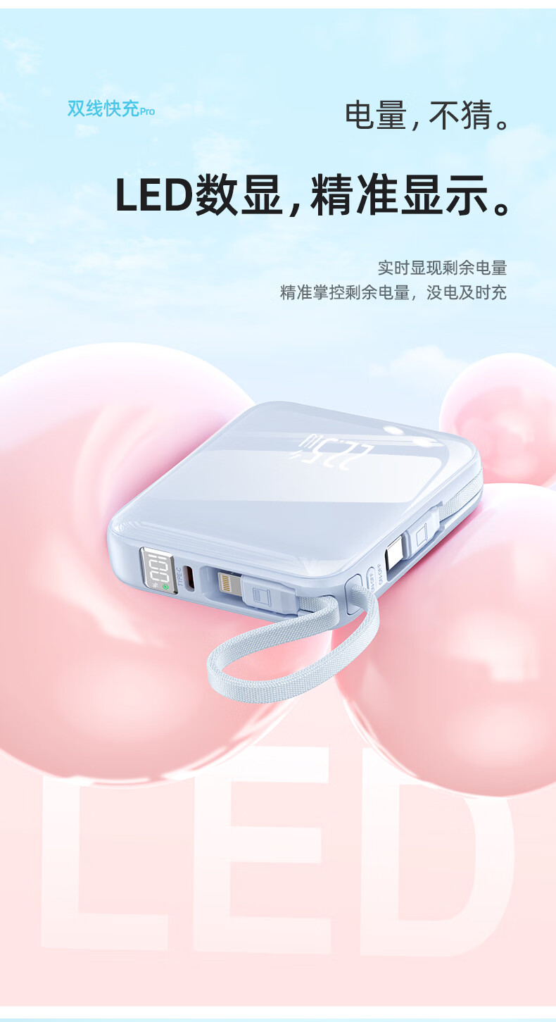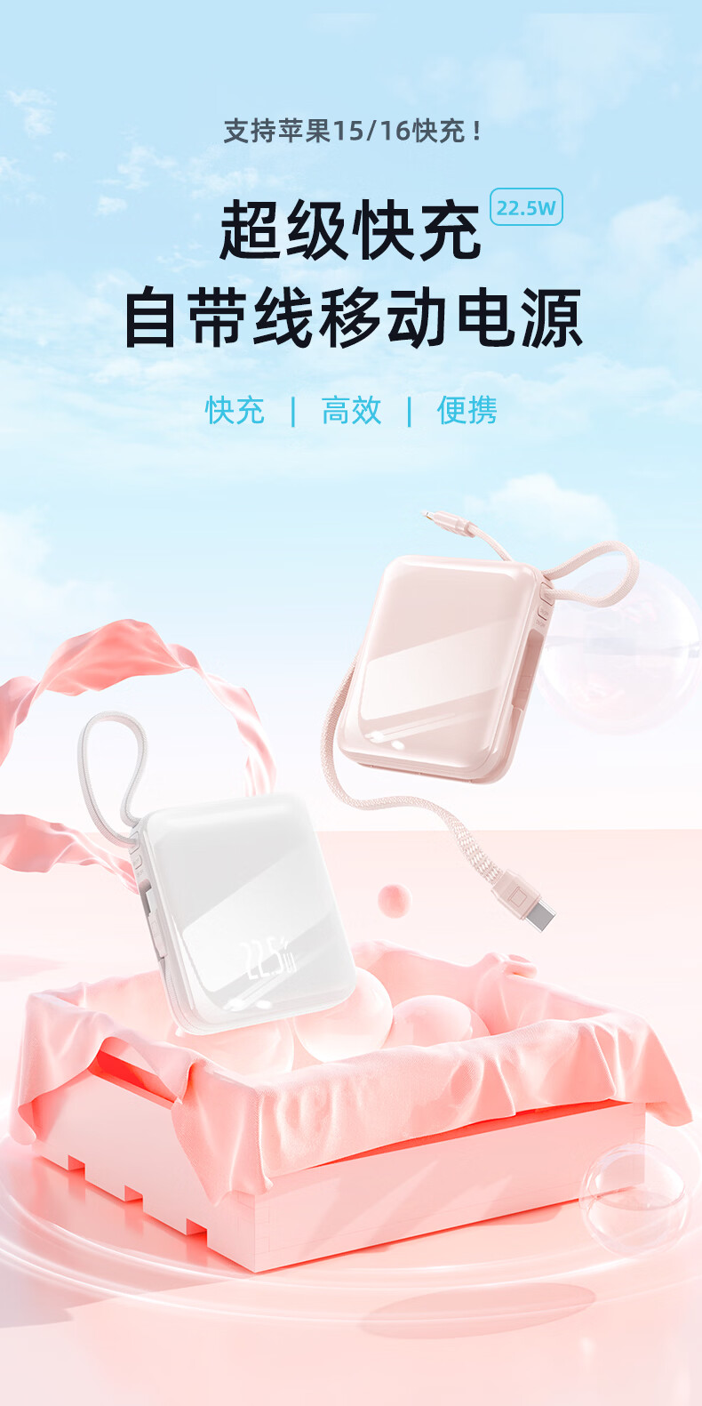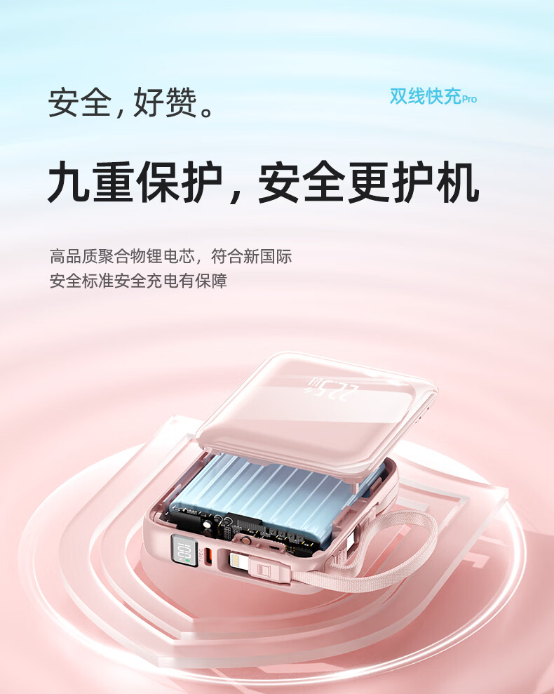 凯舟3C认证充电宝可上飞机2025年快充自带线20000毫安超大容量适用安卓苹果手机移动电源小巧便携定制 粉色【22.5W快充口袋版】3C认证+可上飞机 10000毫安