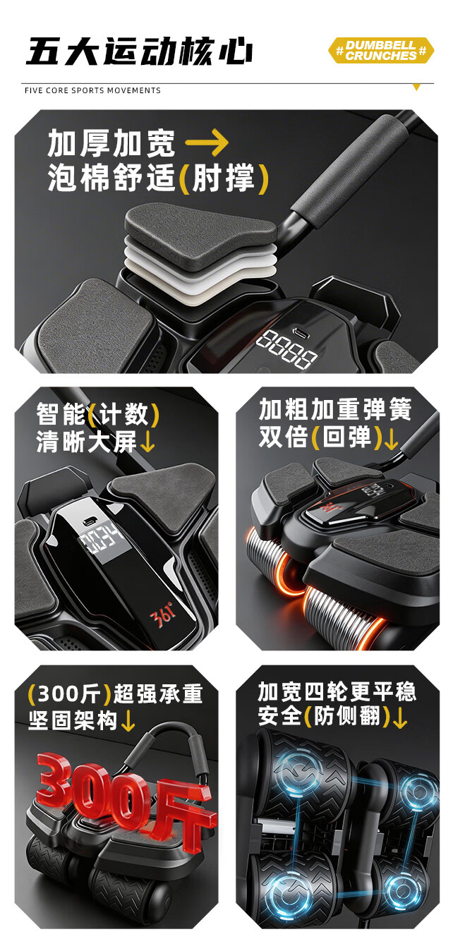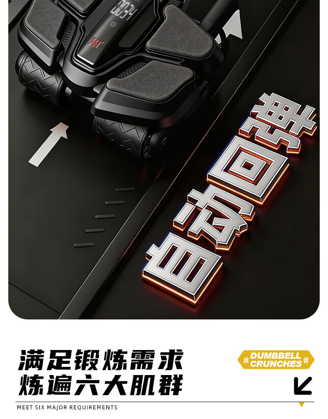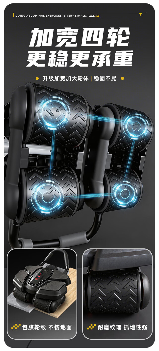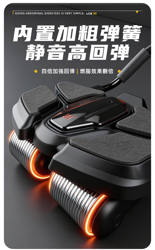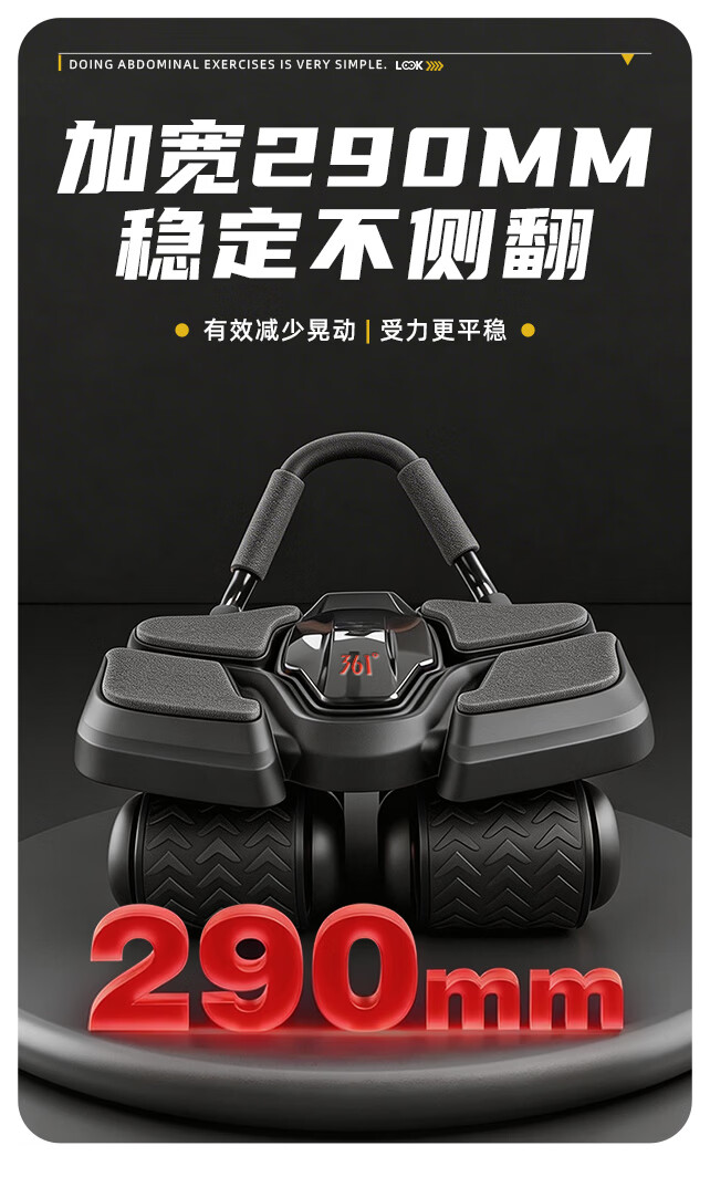 361°健腹轮自动回弹肘撑四轮健身运动器材腹肌训练器瘦肚子收腹练腹肌 特大黑色【智能数显+自动回弹】(送跪垫)