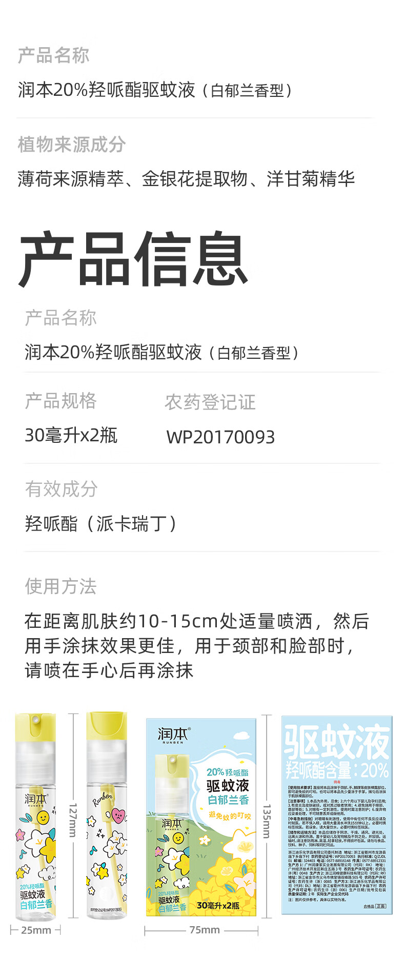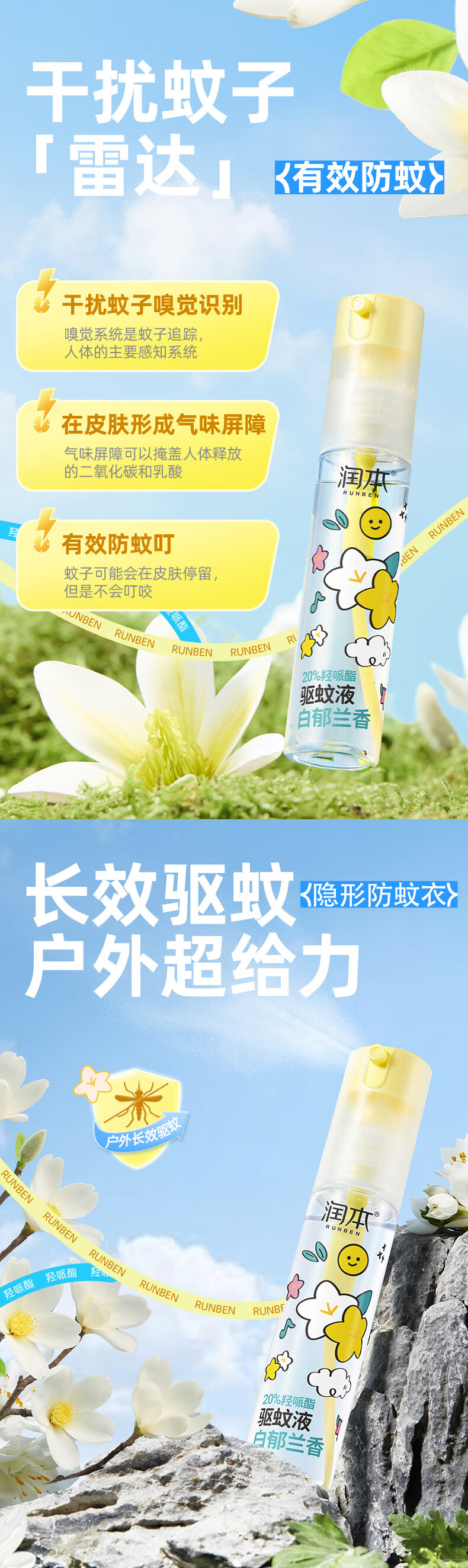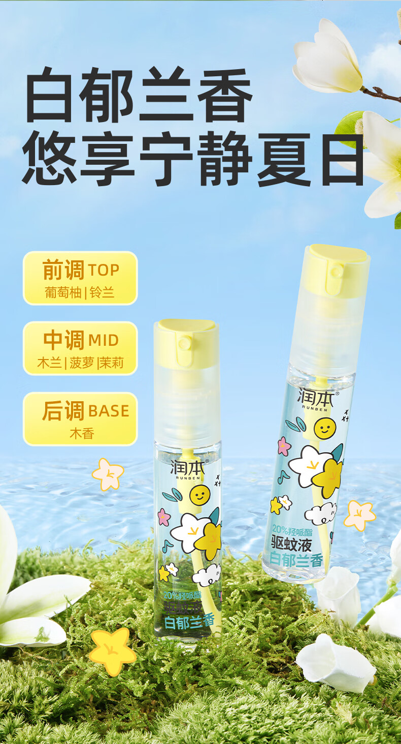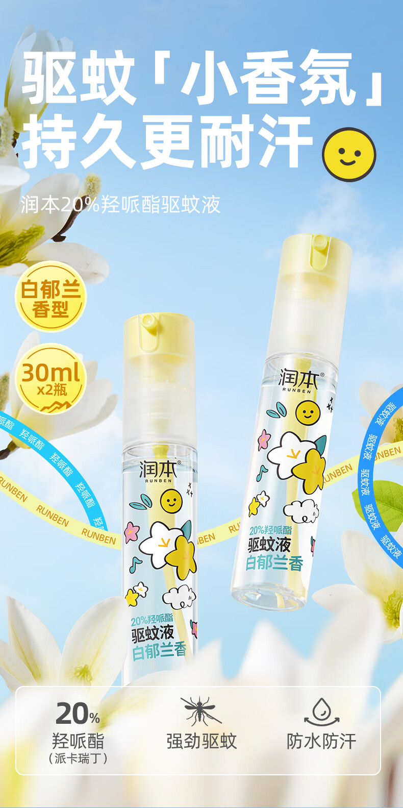 润本驱蚊液驱蚊喷雾花露水防蚊虫叮驱蚊水20%派卡瑞丁白郁兰香30ml*2