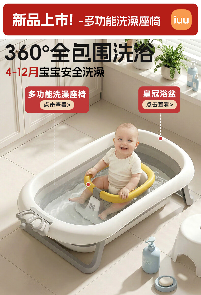 iuu婴儿洗澡盆儿童浴盆大号宝宝可折叠可坐可躺新生儿童用品 【官方补贴】浴盆+可调节浴架+脸盆-北欧灰 材质:食品级PP材质,安全无异味