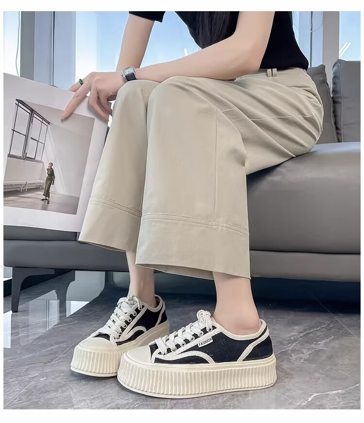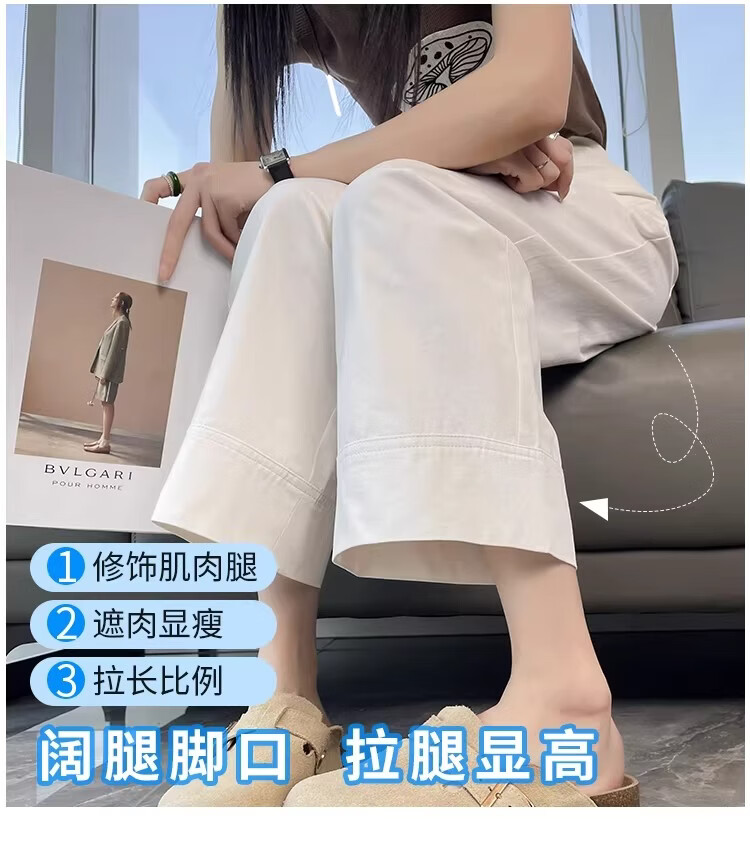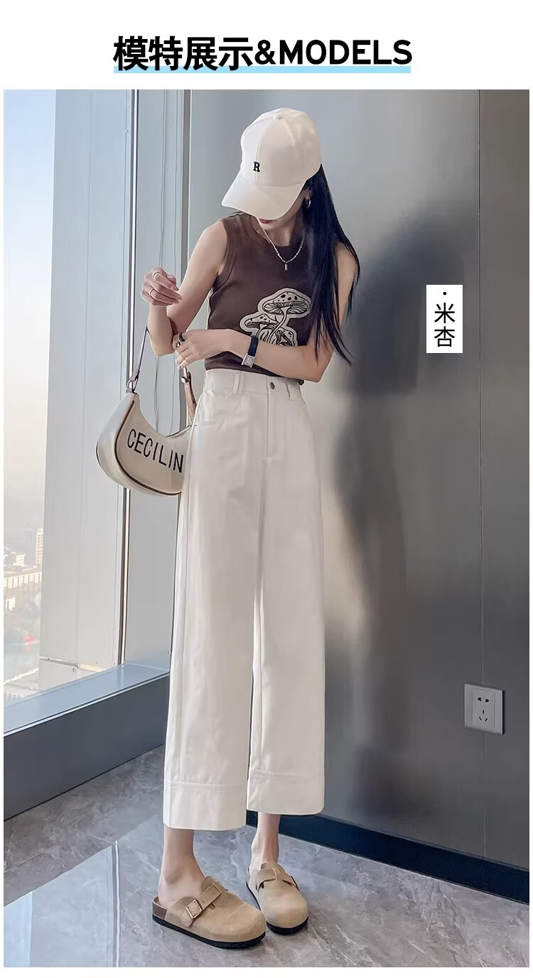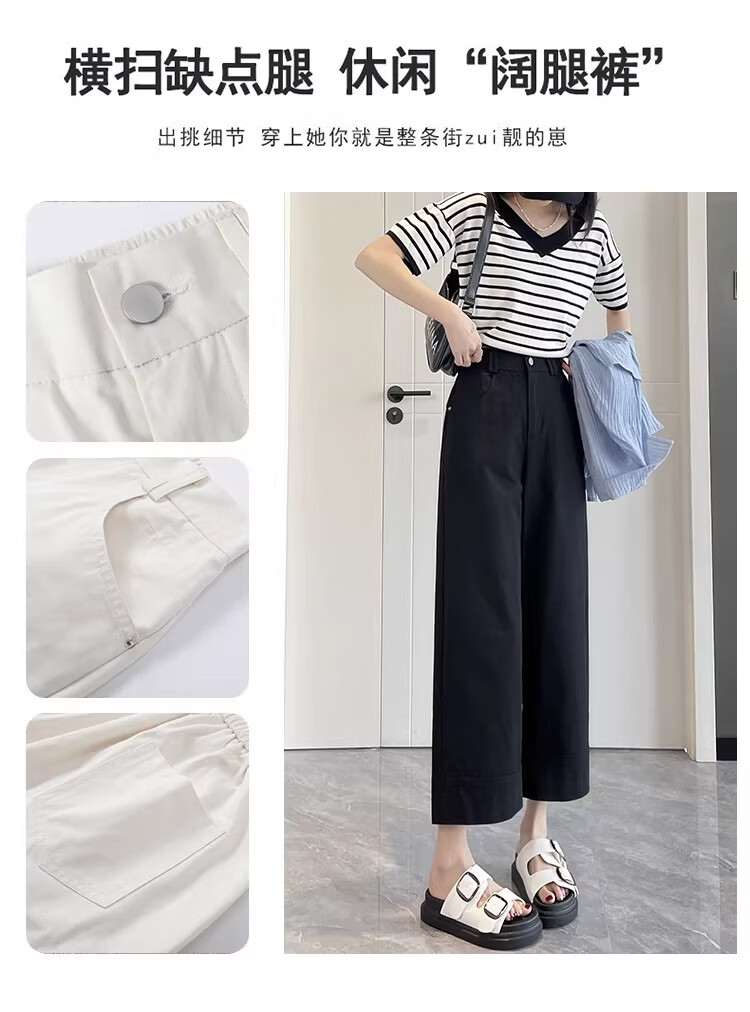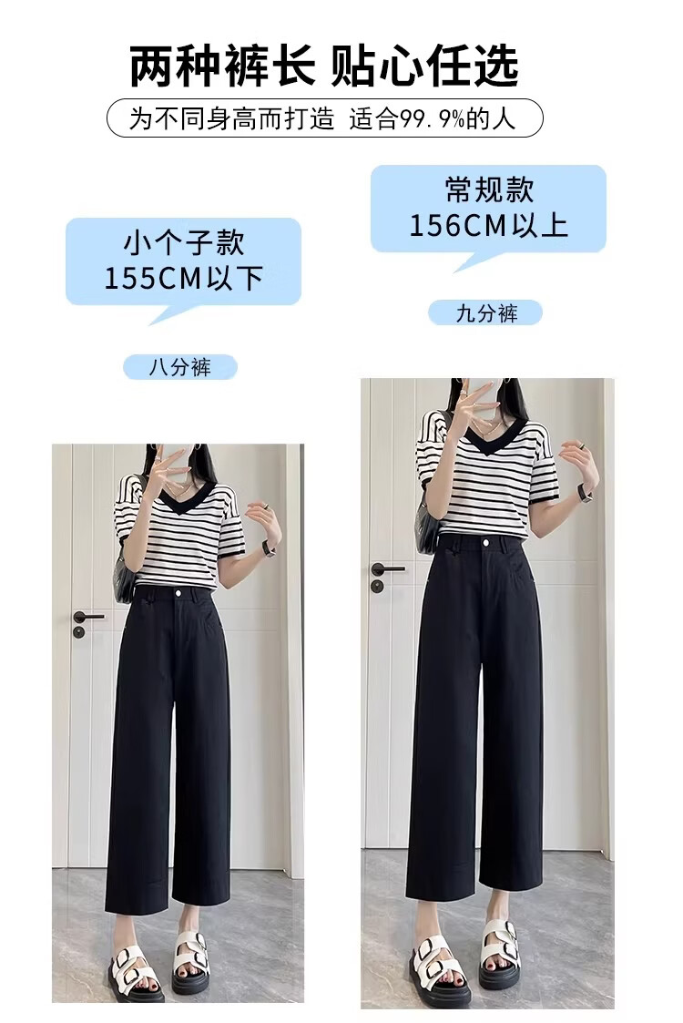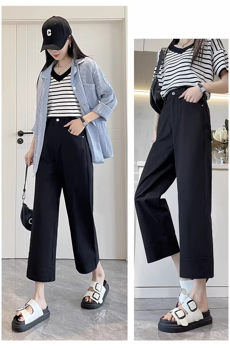 简蜓九分卷边阔腿裤女夏季薄款纯棉高腰小个子宽松日系八分直筒烟管裤 黑色-九分裤 L 【建议105-115斤】