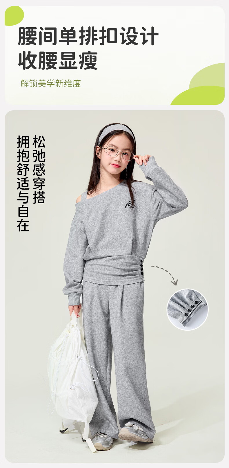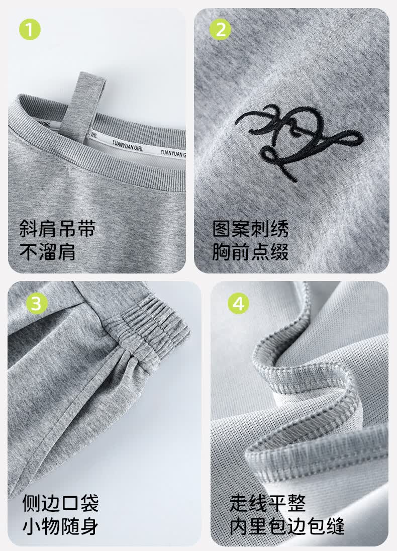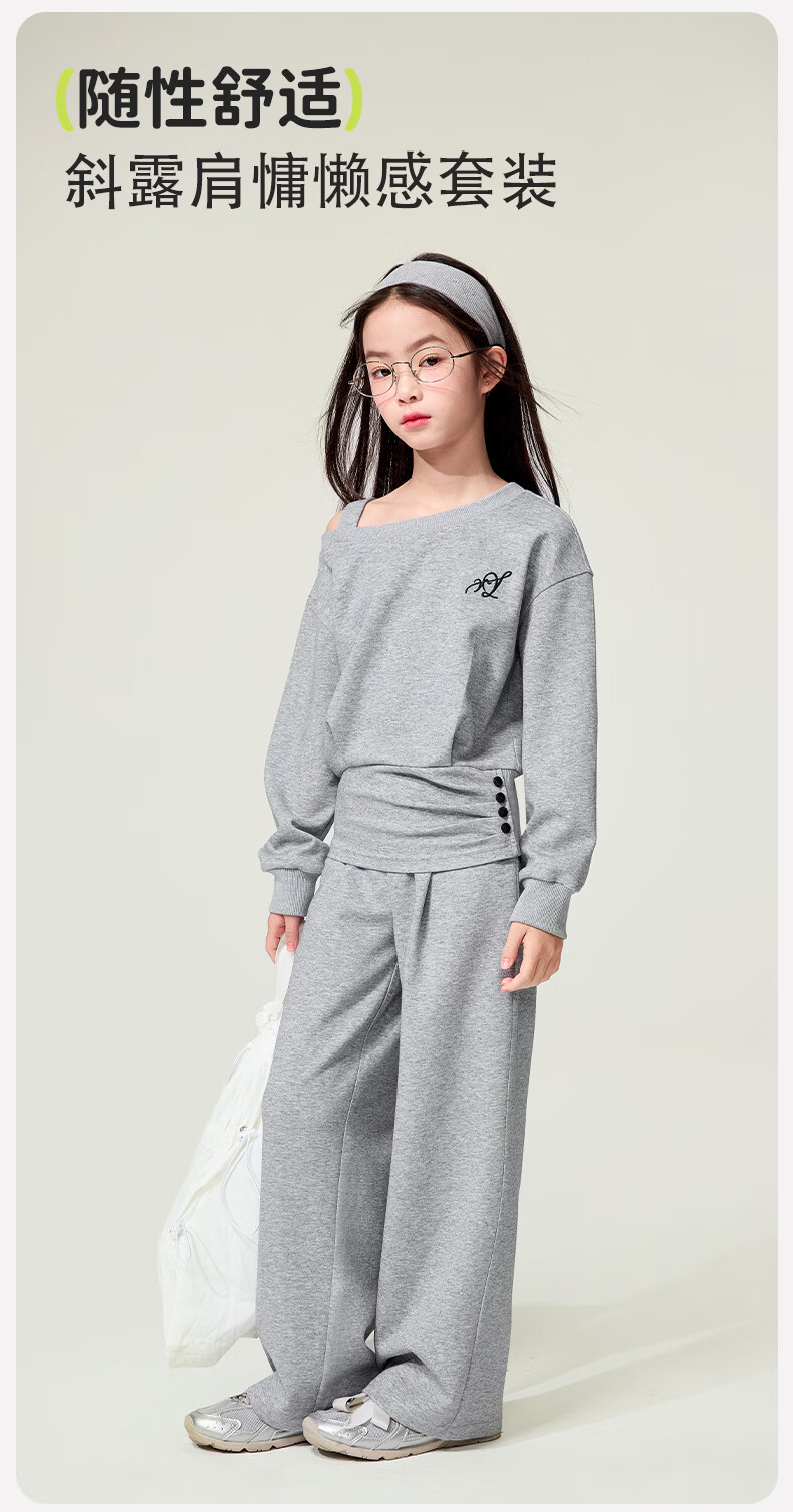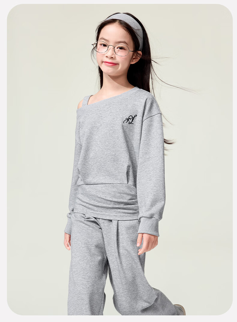 媛媛公主儿童套装26春季新款女童韩系休闲风斜肩收腰上衣长裤针织两件套 灰色 110