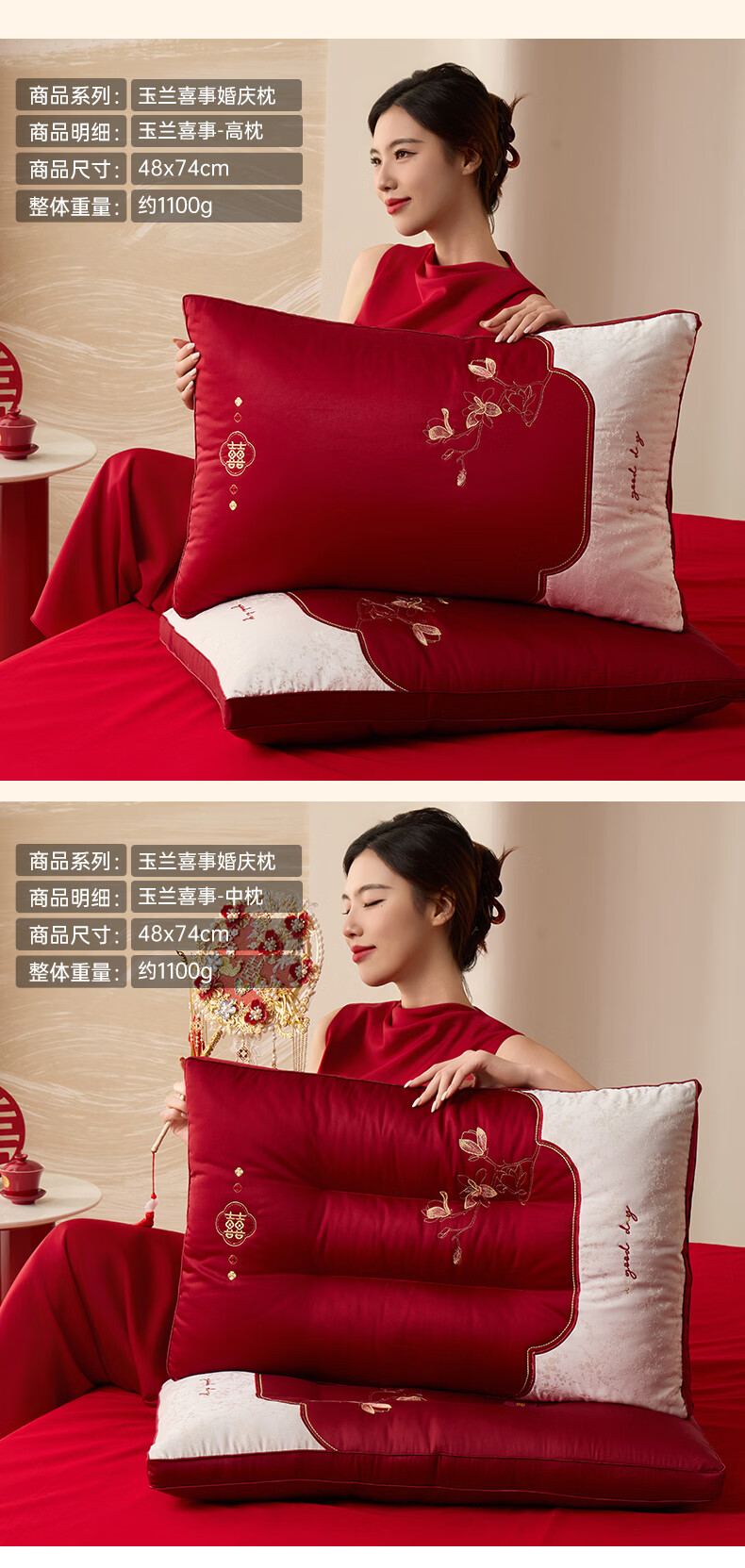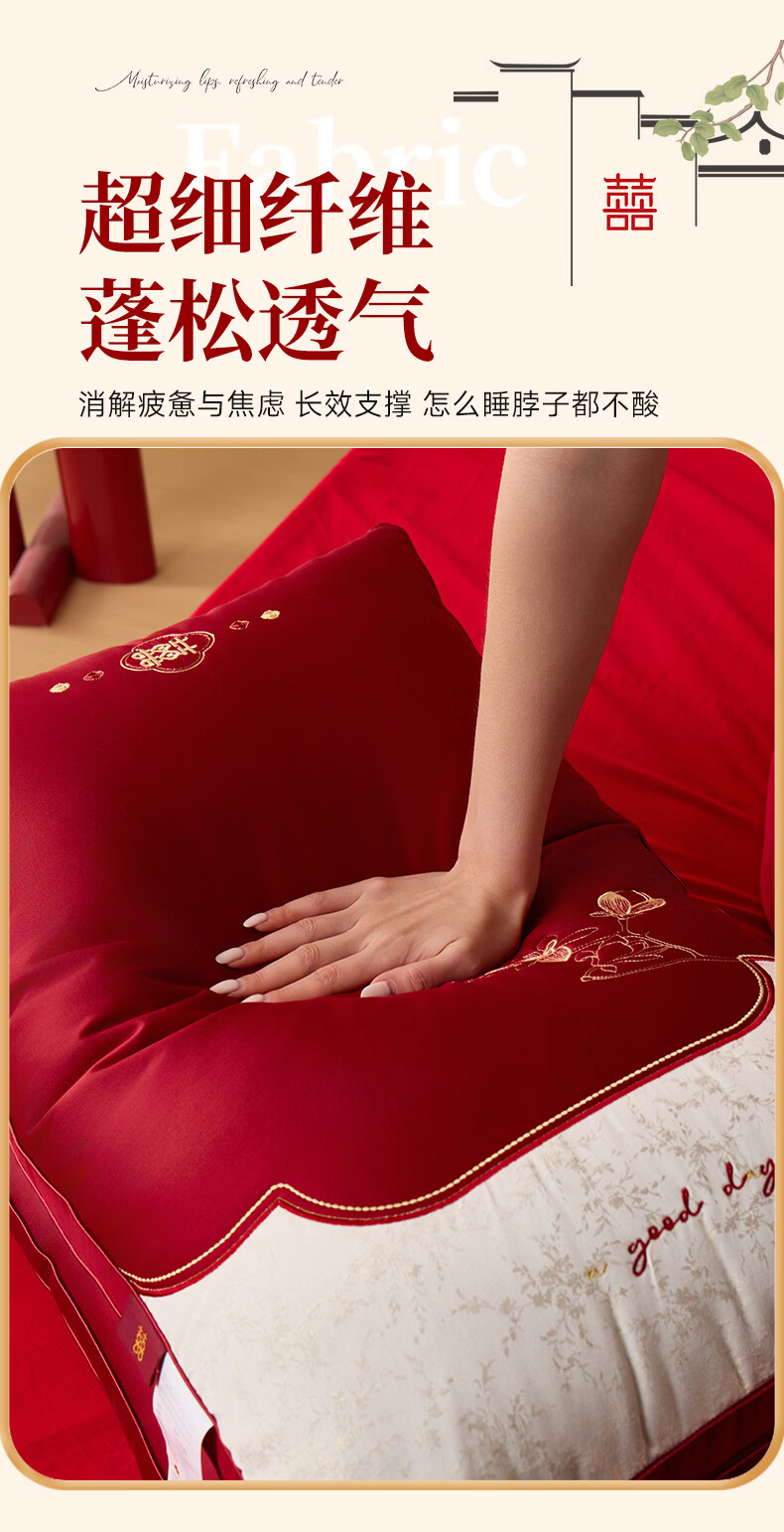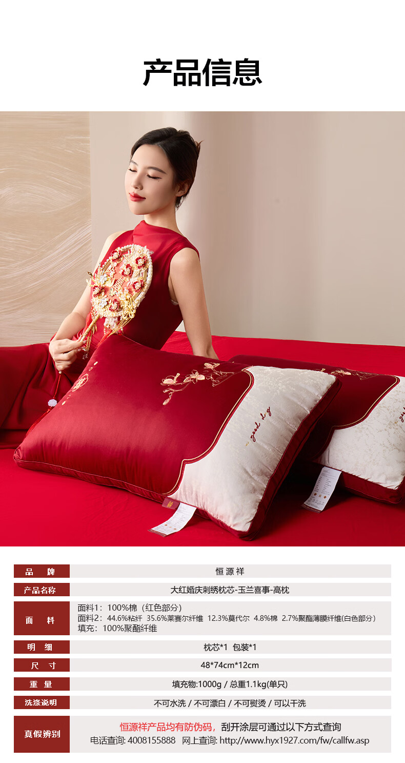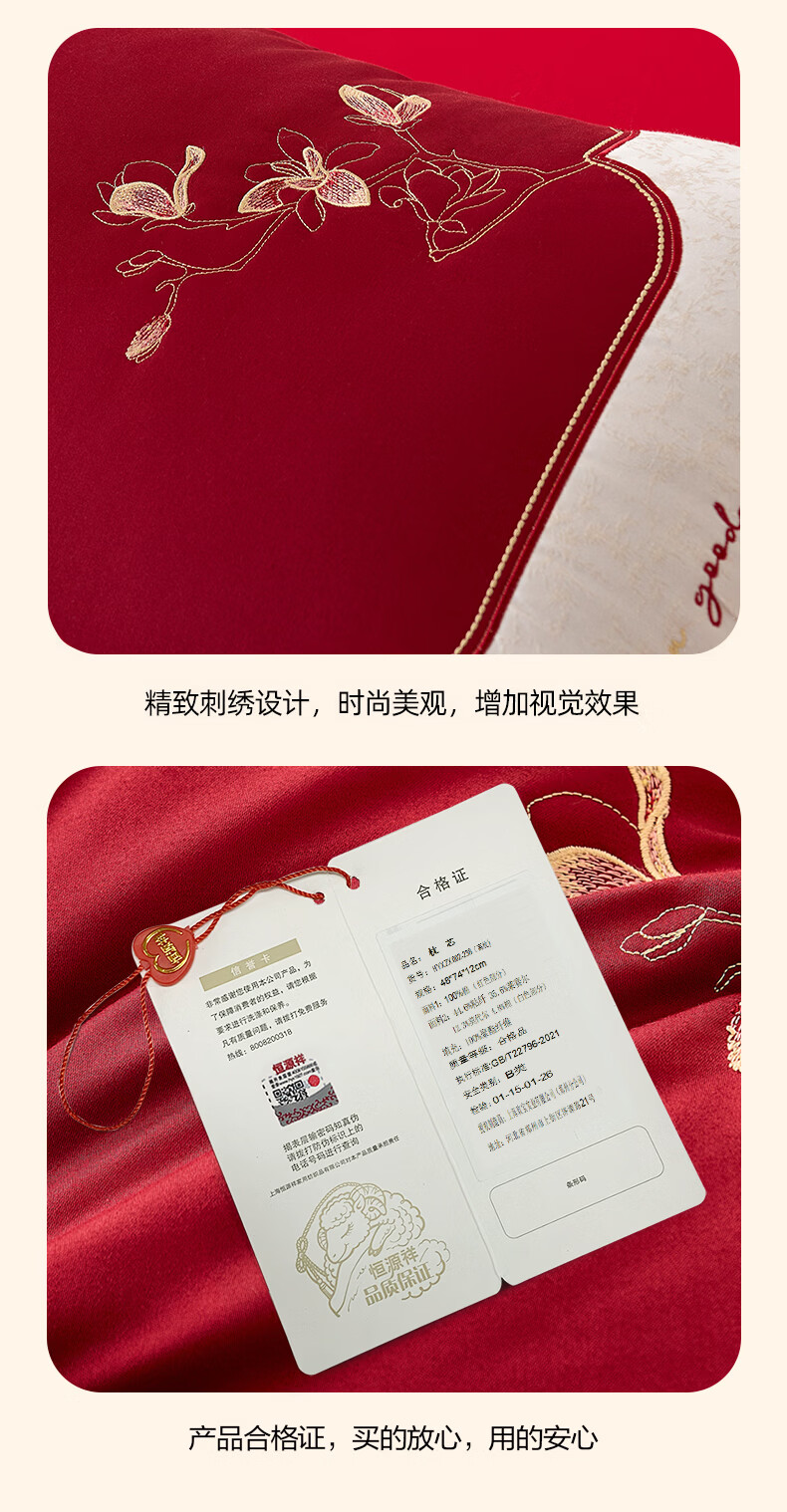 恒源祥 婚庆枕头 大红中式刺绣枕芯质感提花丝滑软糯轻奢双人婚庆枕芯 玉兰喜事-中枕48*74cm*6cm 【单只】