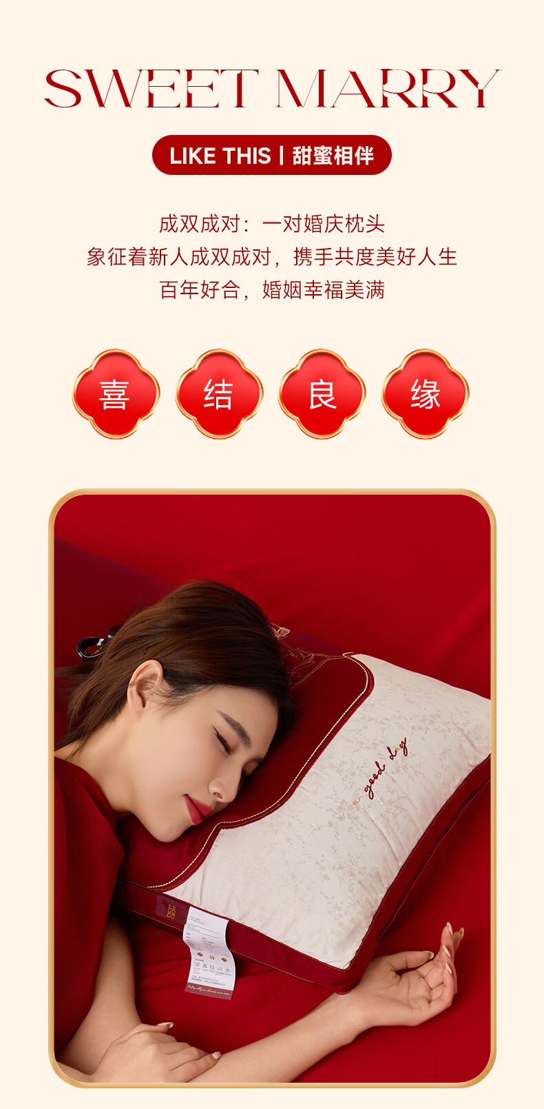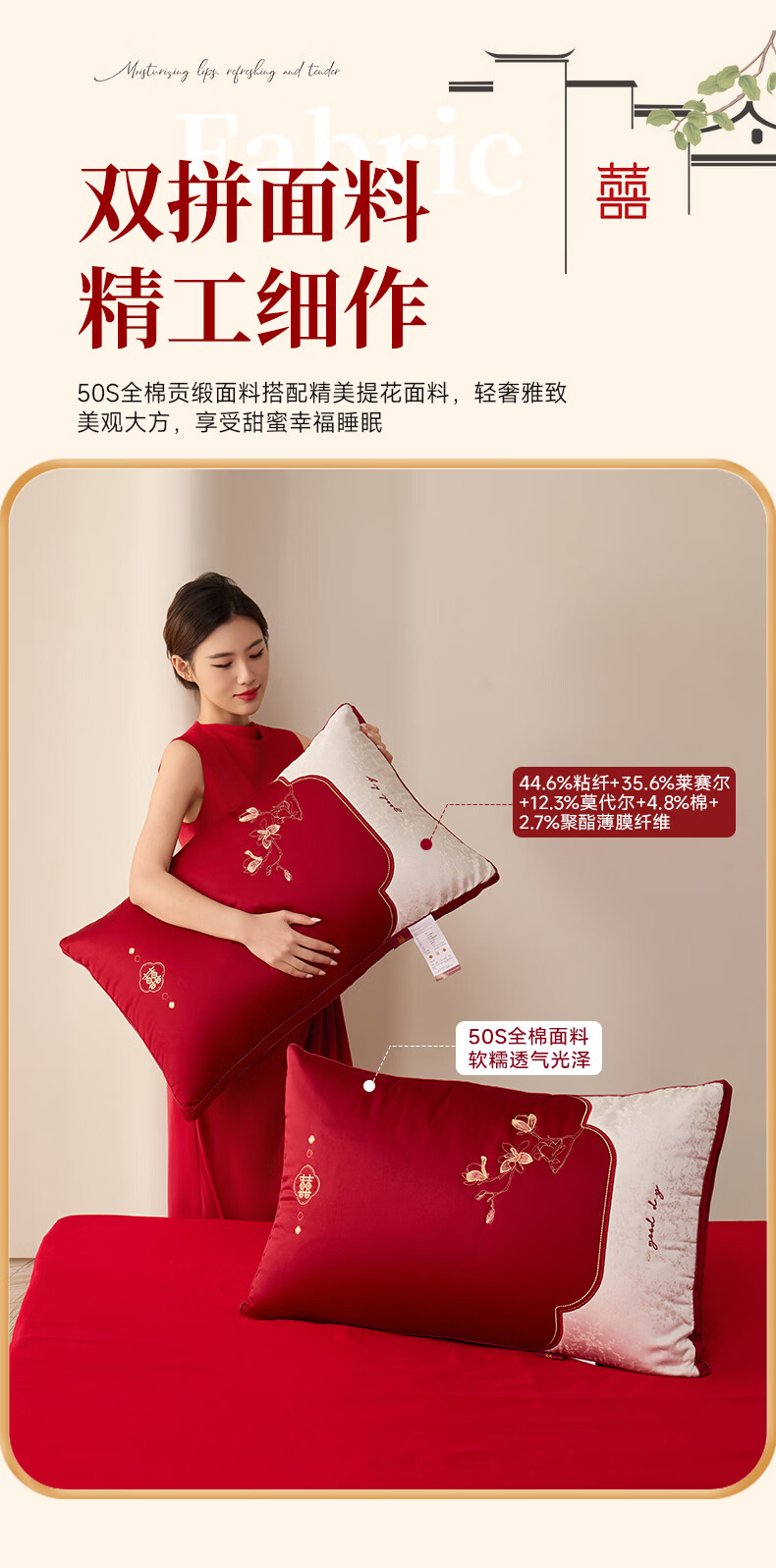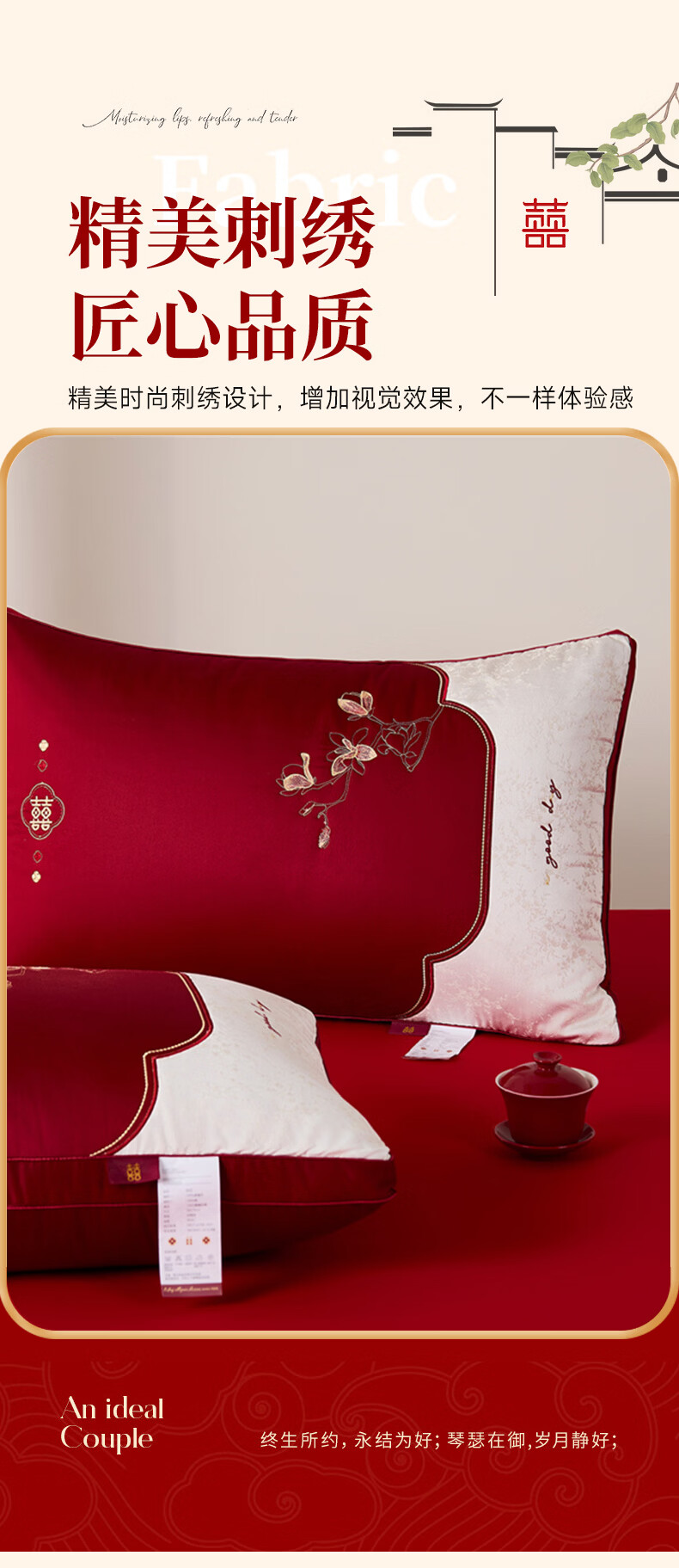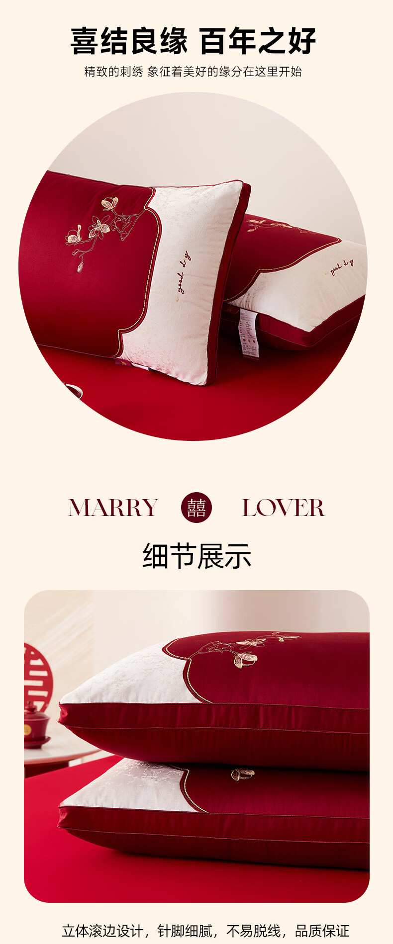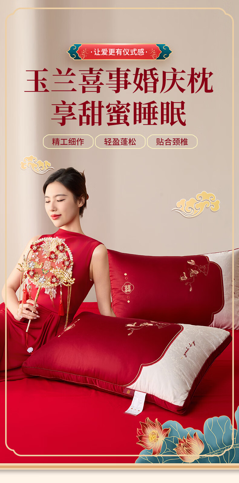 恒源祥 婚庆枕头 大红中式刺绣枕芯质感提花丝滑软糯轻奢双人婚庆枕芯 玉兰喜事-中枕48*74cm*6cm 【单只】