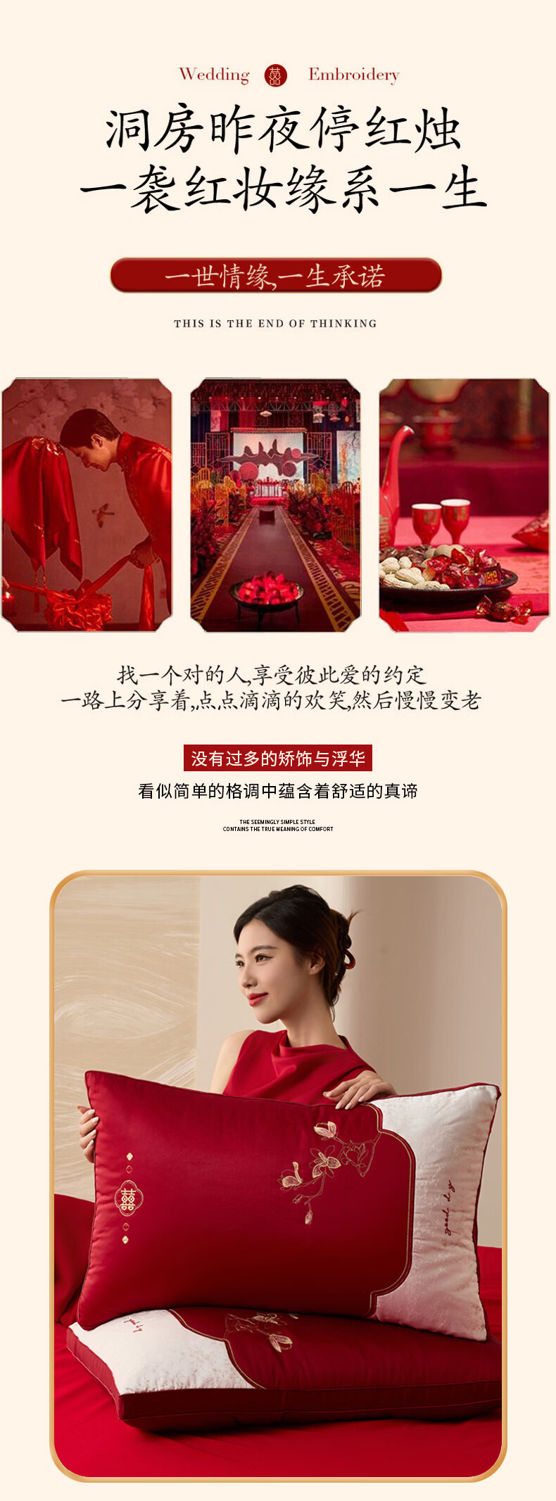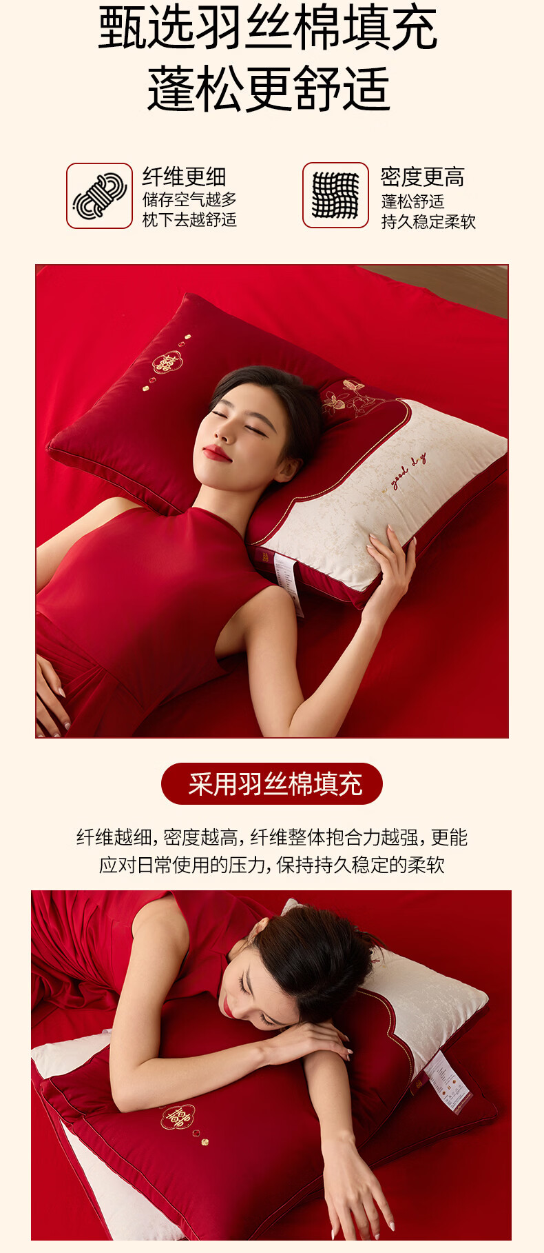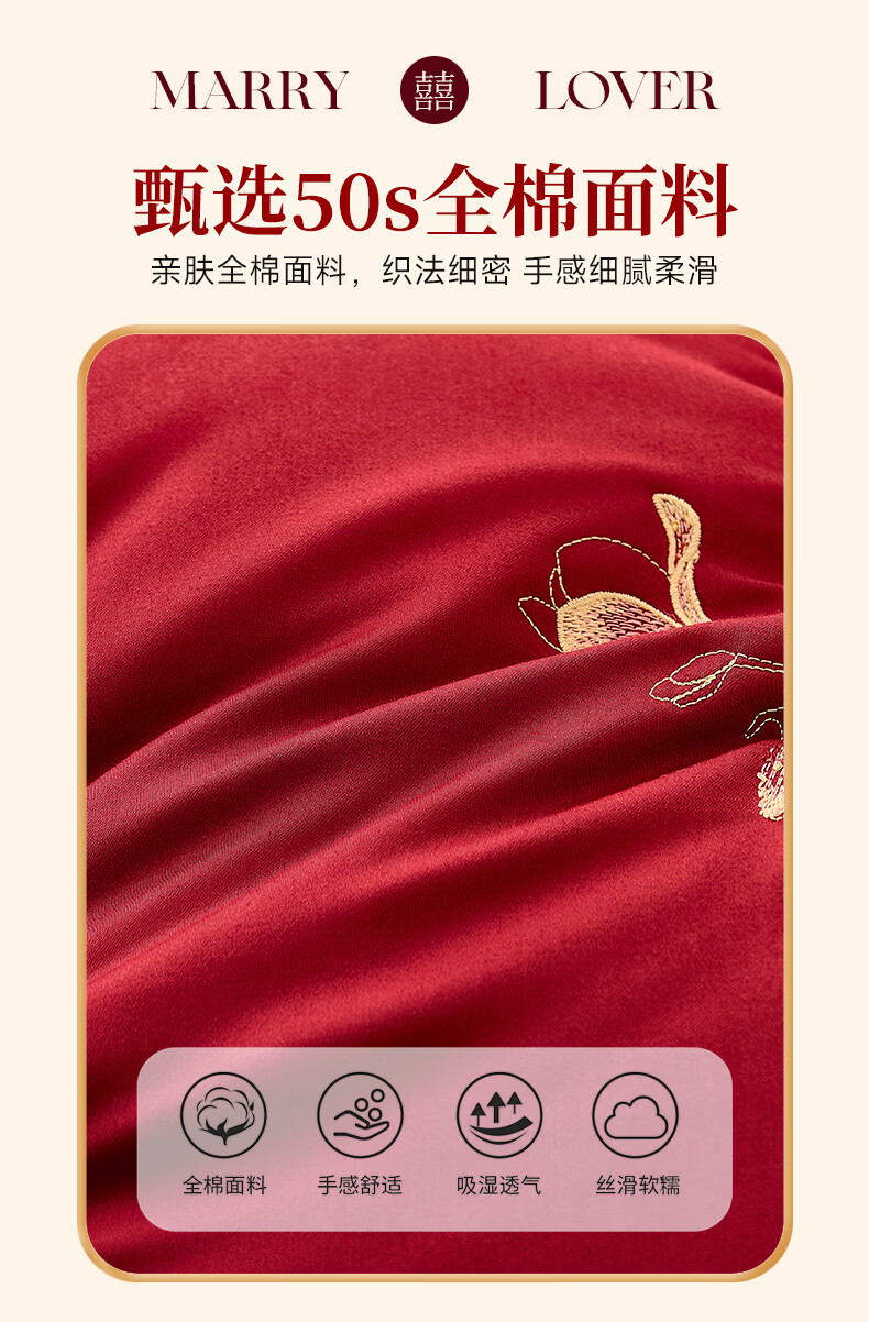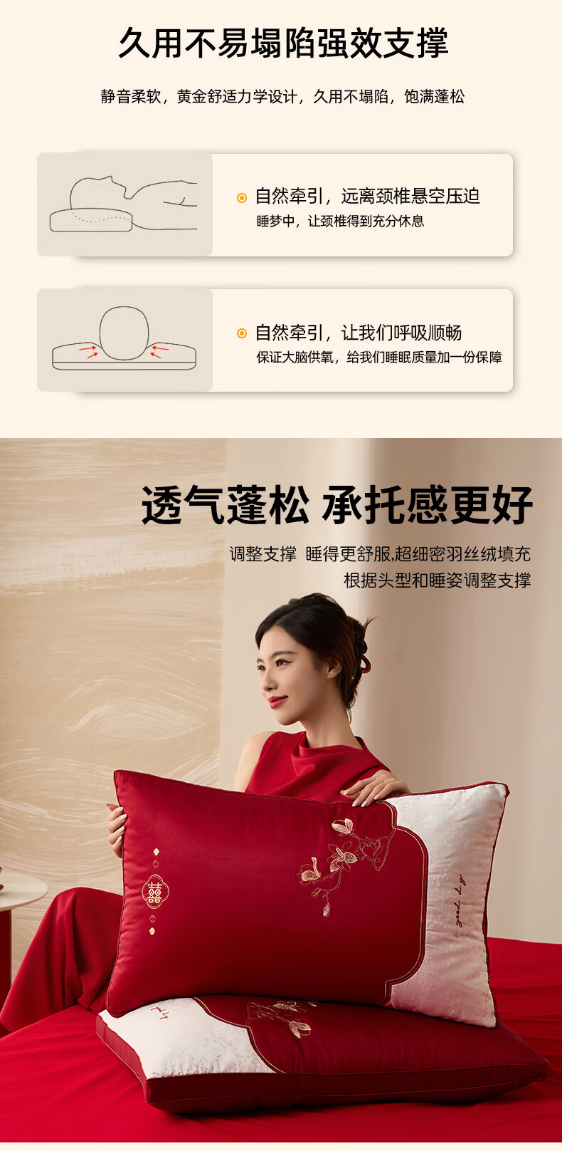恒源祥 婚庆枕头 大红中式刺绣枕芯质感提花丝滑软糯轻奢双人婚庆枕芯 玉兰喜事-中枕48*74cm*6cm 【单只】