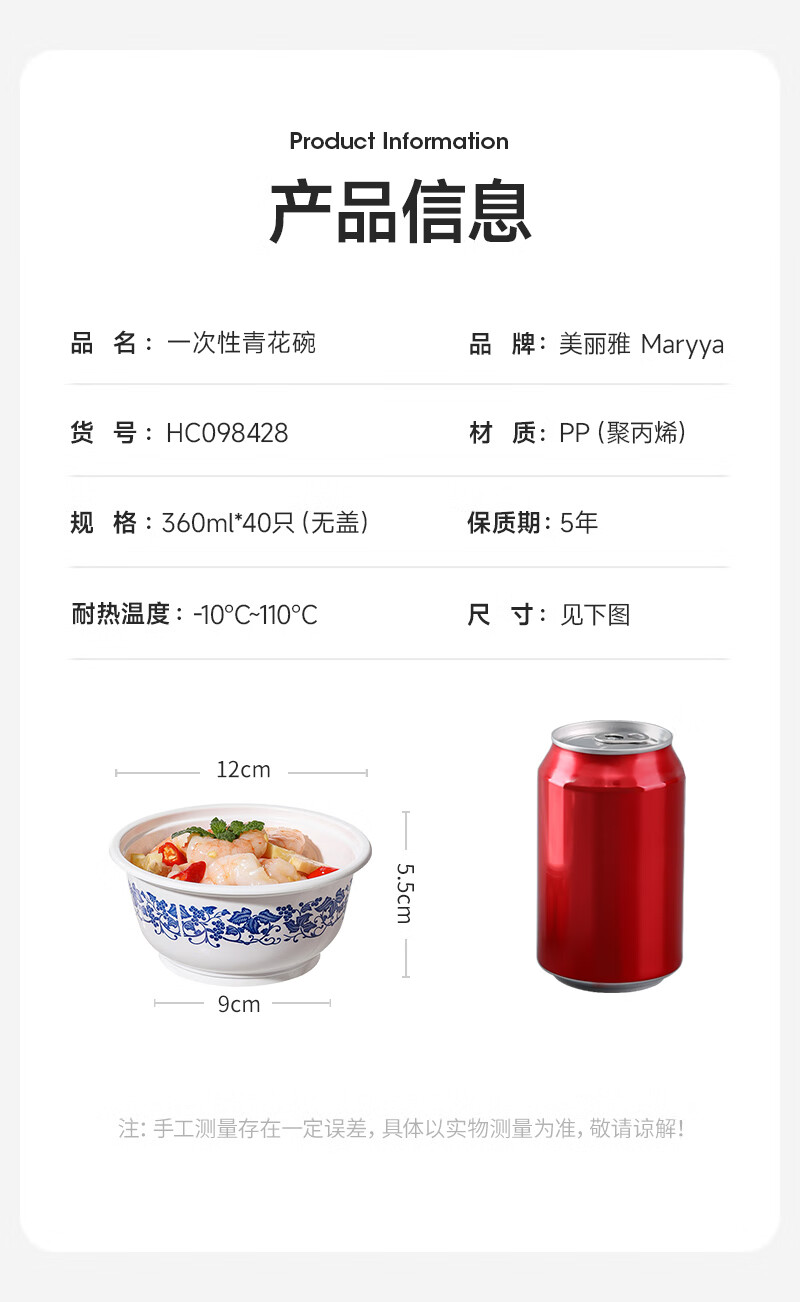 美丽雅一次性碗青花圆形餐盒 食品级塑料饭盒加厚耐高温360ml*40只