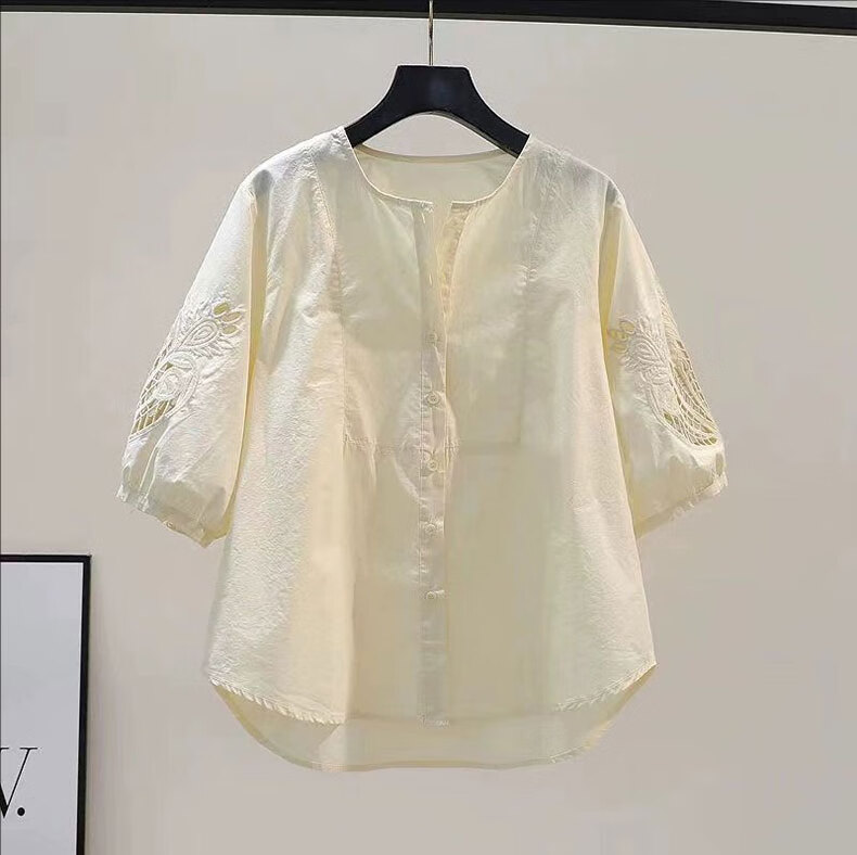 子牧棉麻春夏装 女文艺百搭中袖衬衣镂空刺绣衬衫宽松气质上衣6068 浅黄色 M (建议90-115斤)