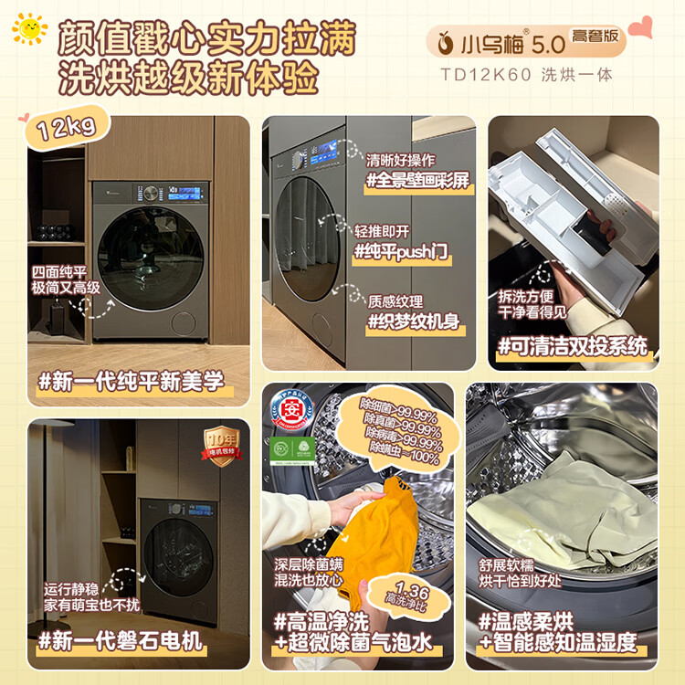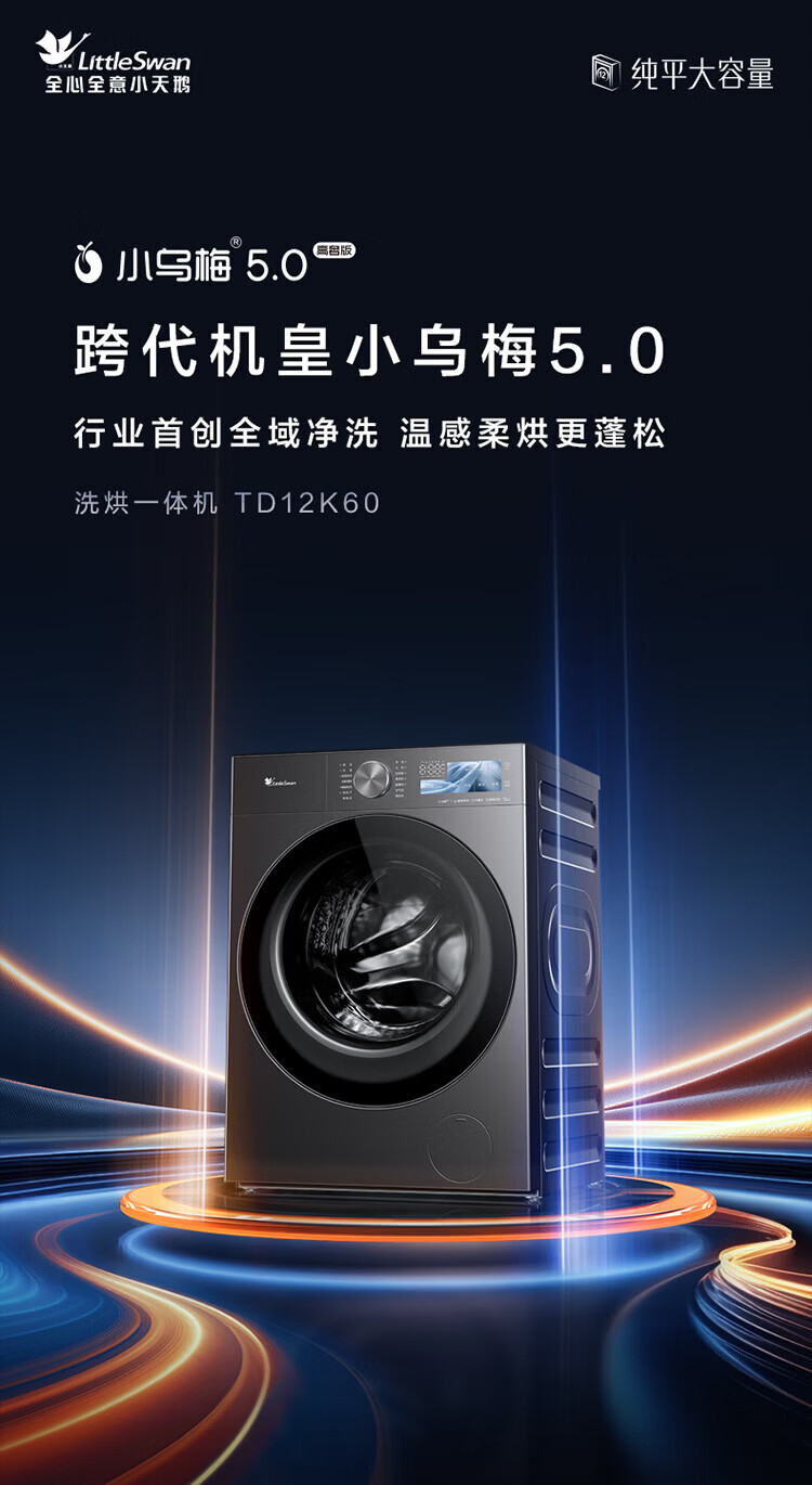 小天鹅(LittleSwan)小乌梅5.0高奢版 AWE同款洗衣机滚筒全自动洗烘一体带烘干12KG纯平大容量超微除菌气泡1.36洗净比 TD12K60 洗烘一体 滚筒洗烘