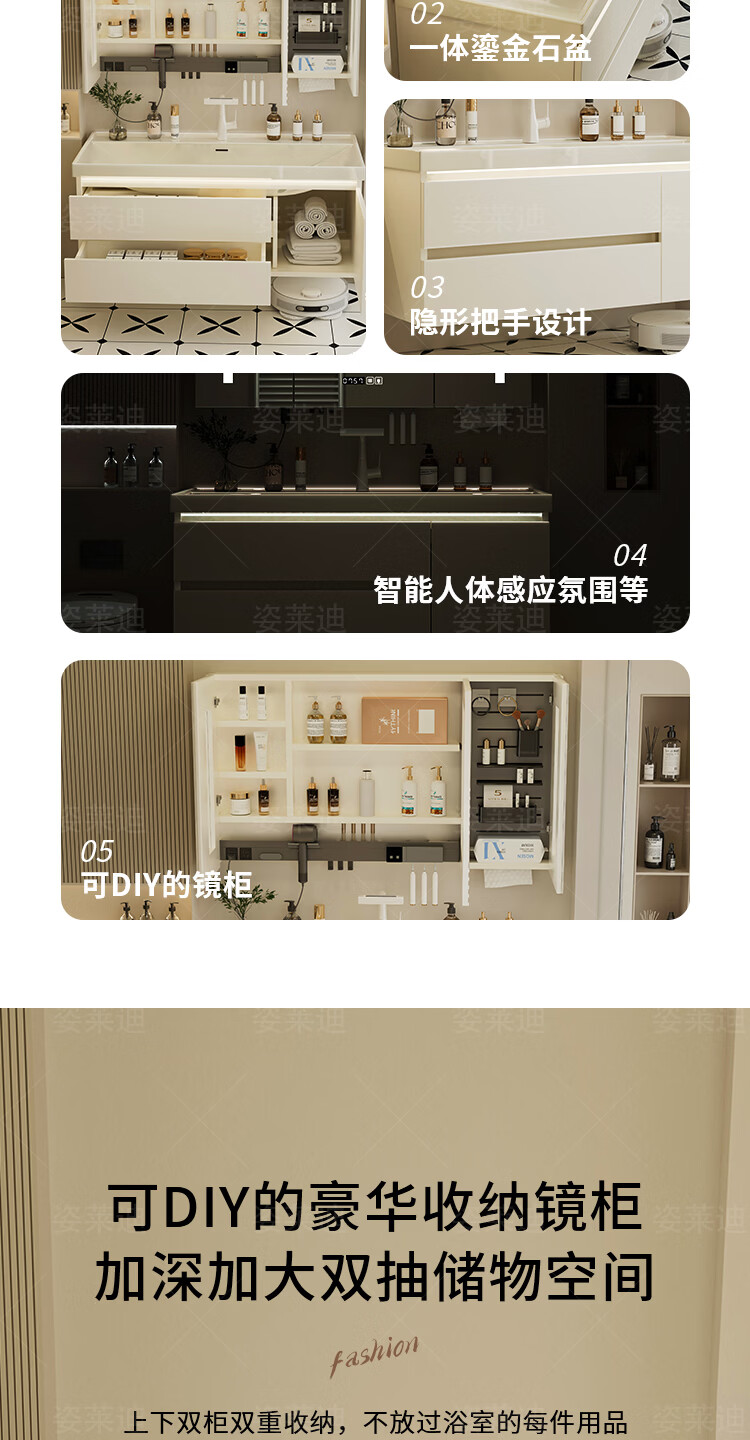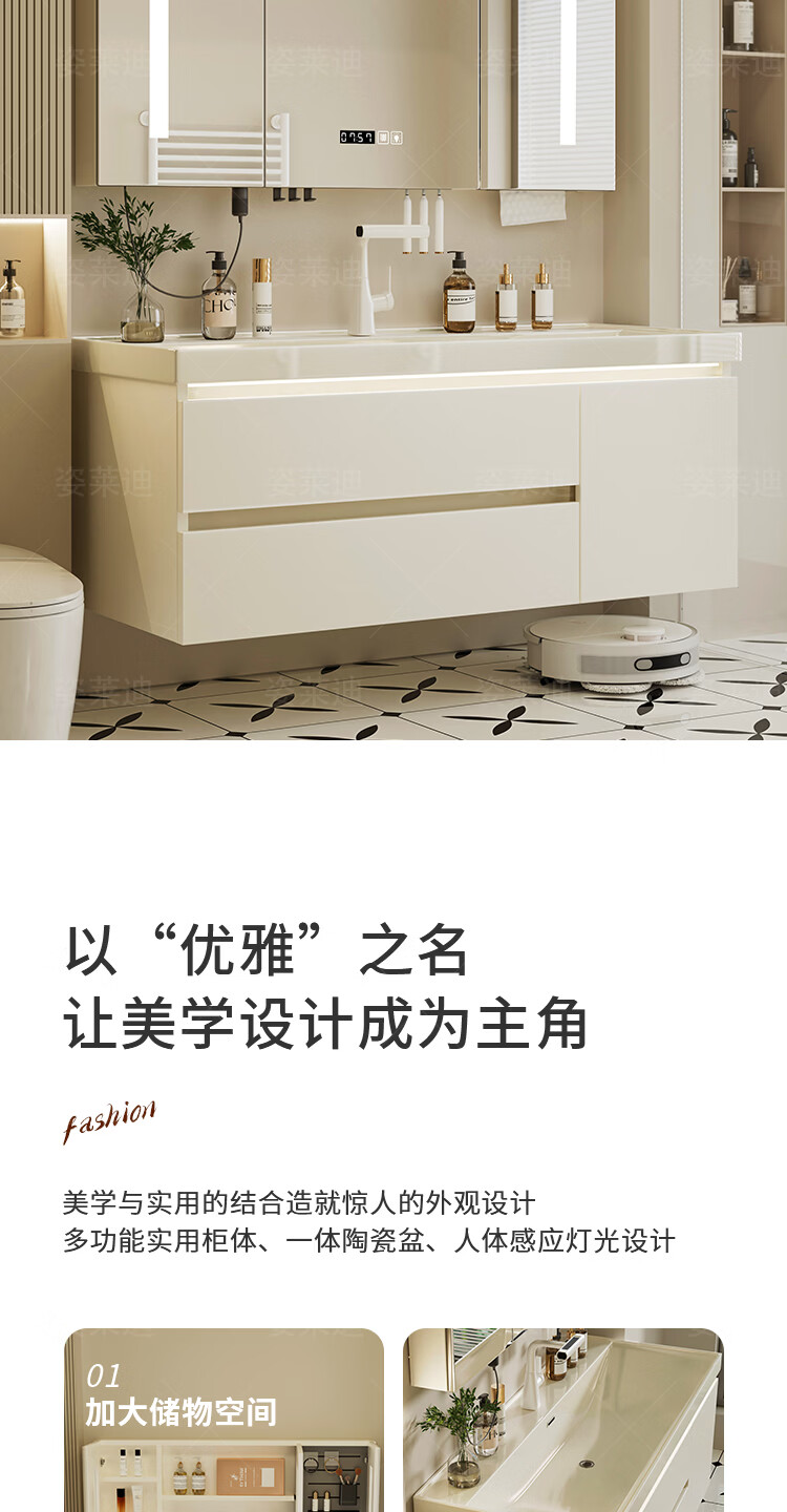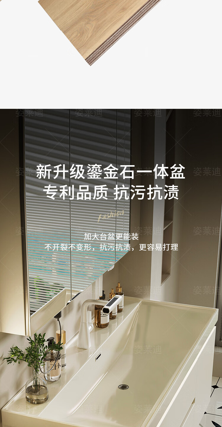 姿莱迪浴室柜鎏金石海洋盆卫生间洗漱盆奶油风洗脸洗手盆柜组合一体盆 鎏金白80cm鎏金石一体盆+全镜收纳镜柜升级厚18cm+白8
